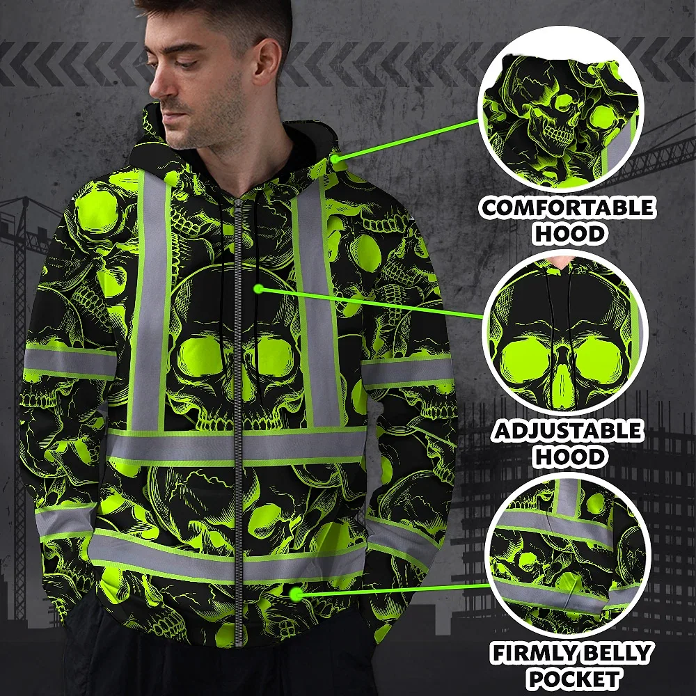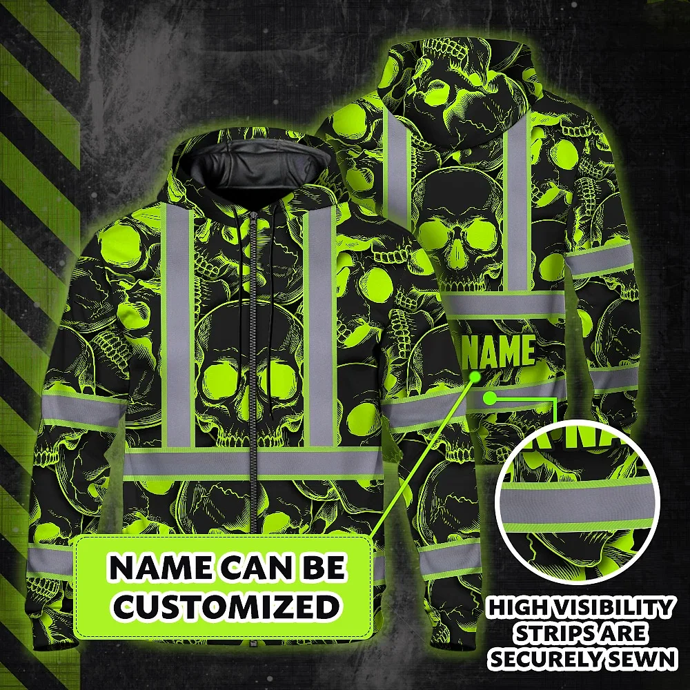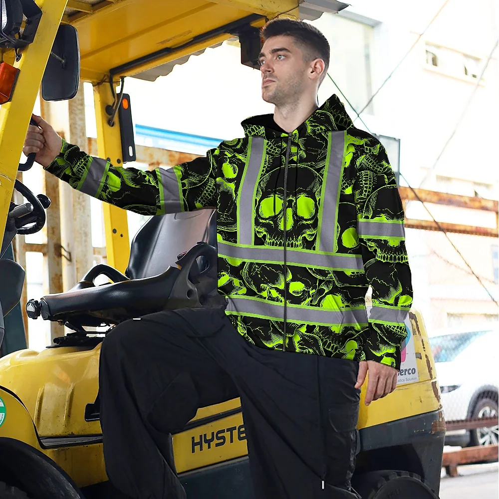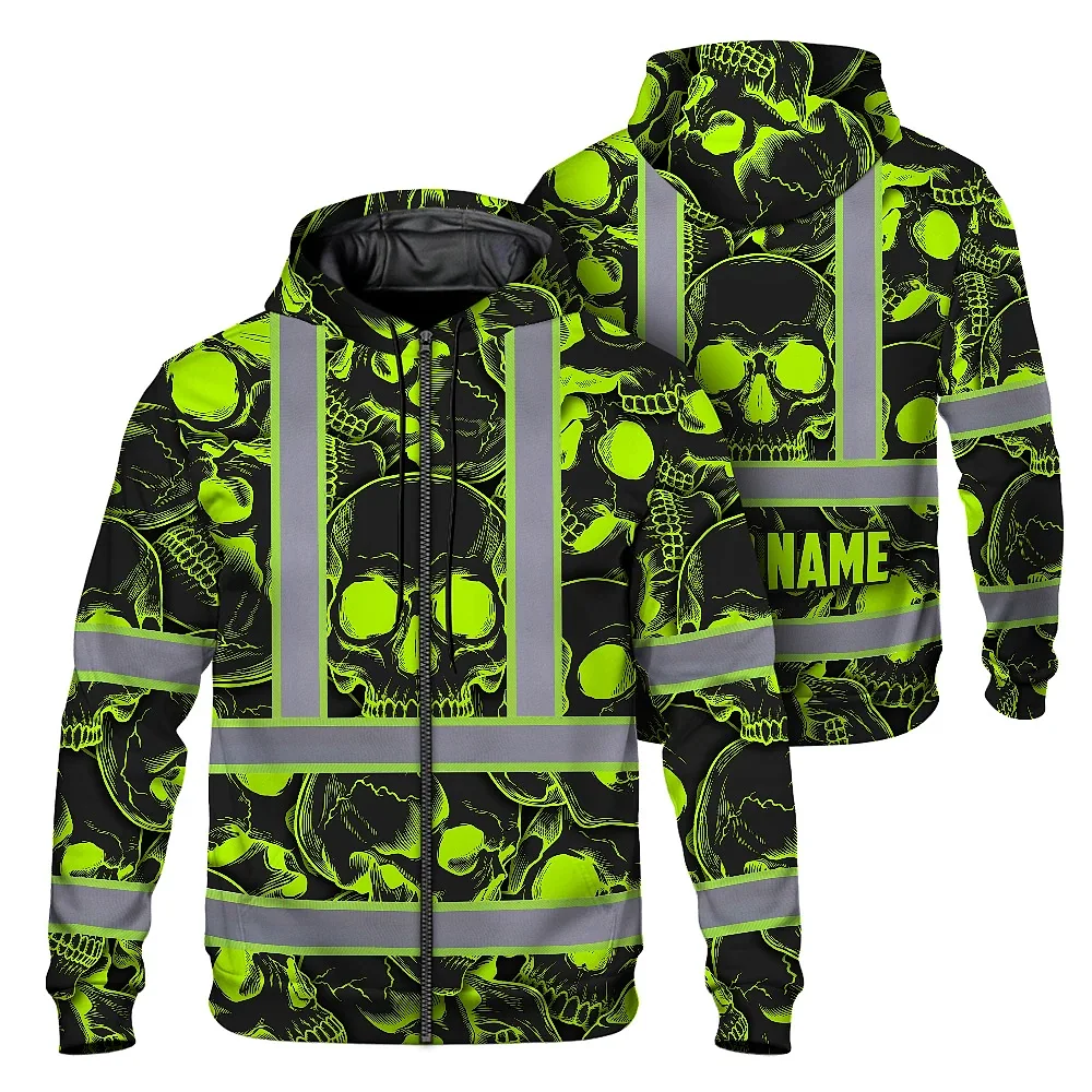 Hi Vis Zip Hoodie Reflective Tapes Green Neon Black Skull Custom Name Safety Workwear For Workers, Truckers, Operators