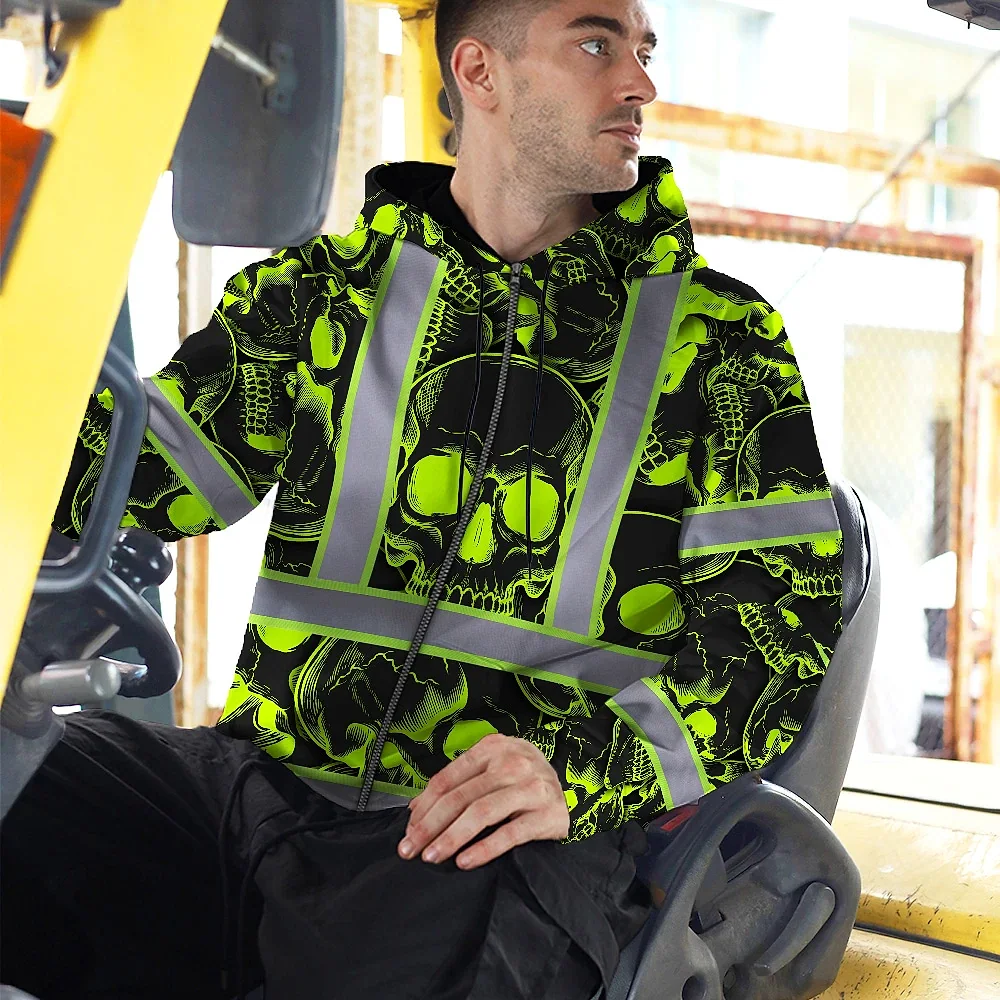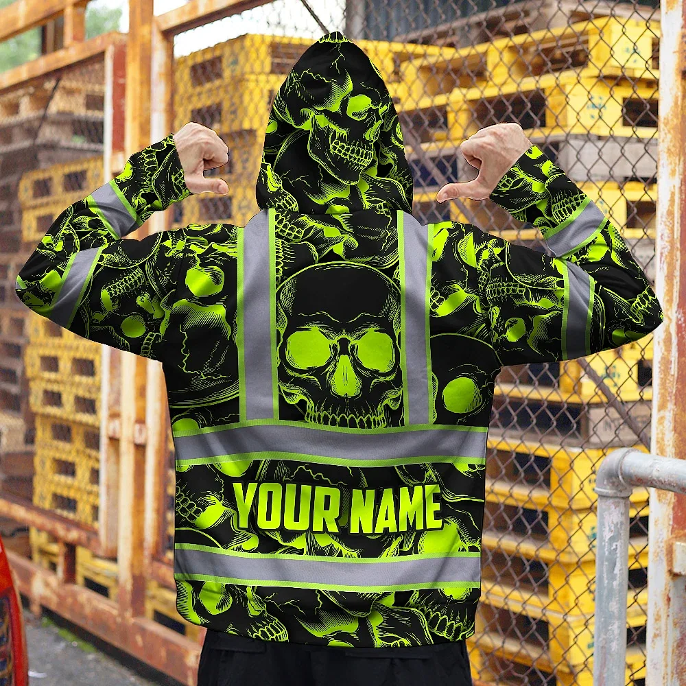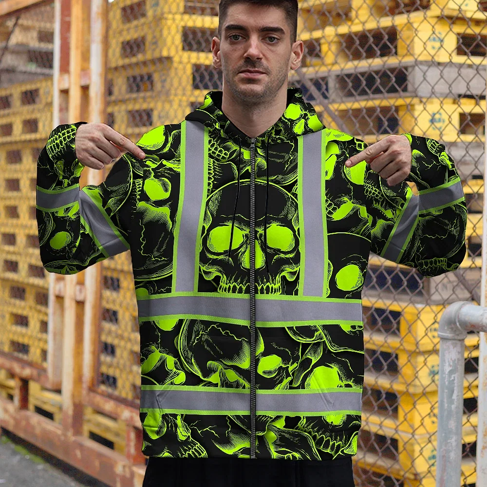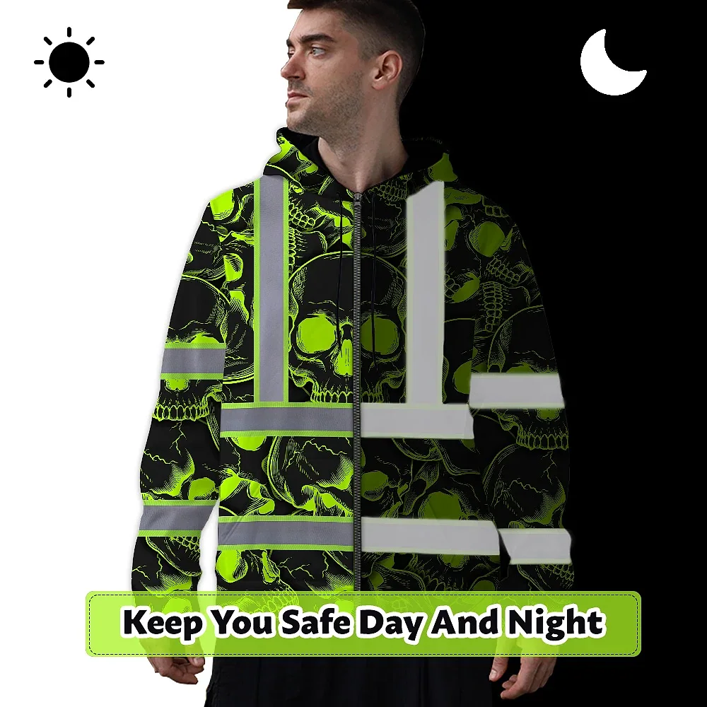 Hi Vis Zip Hoodie Reflective Tapes Green Neon Black Skull Custom Name Safety Workwear For Workers, Truckers, Operators