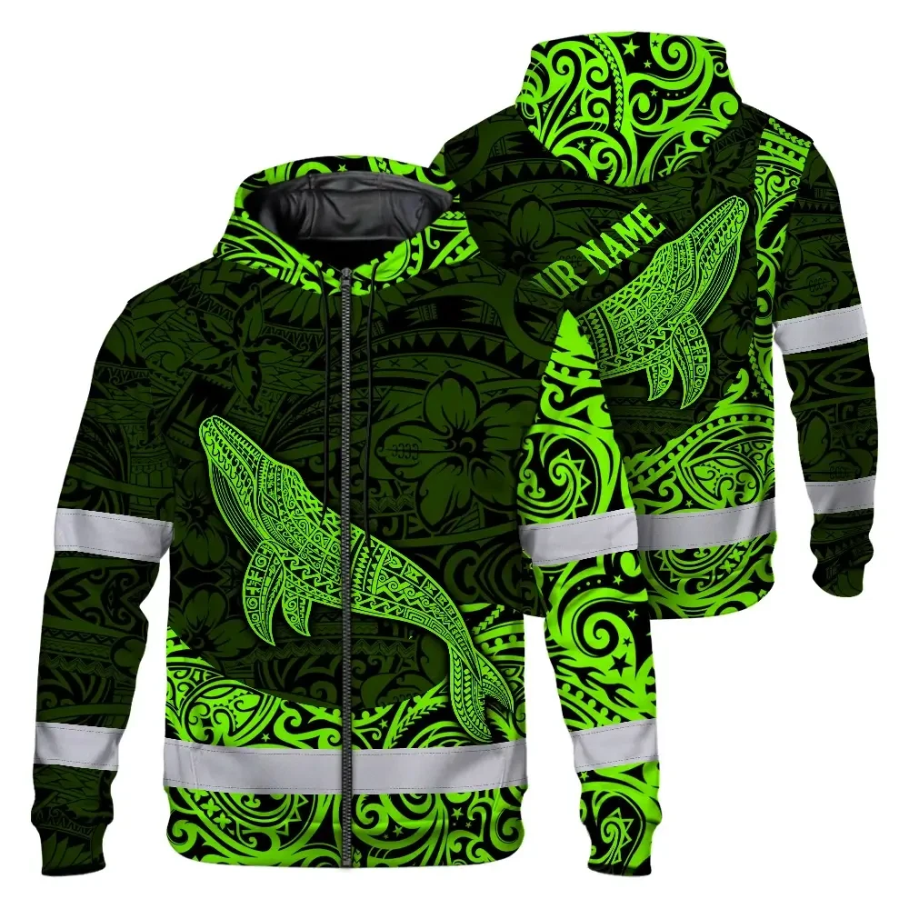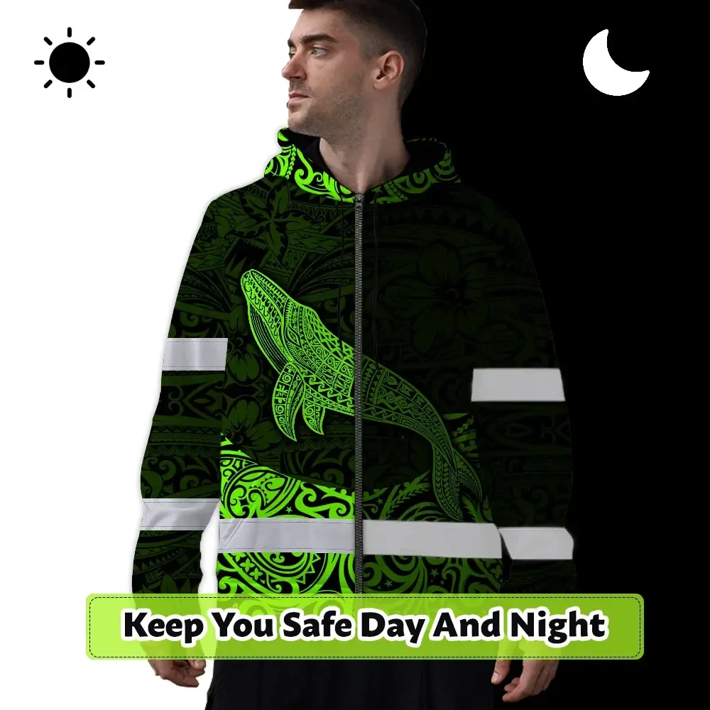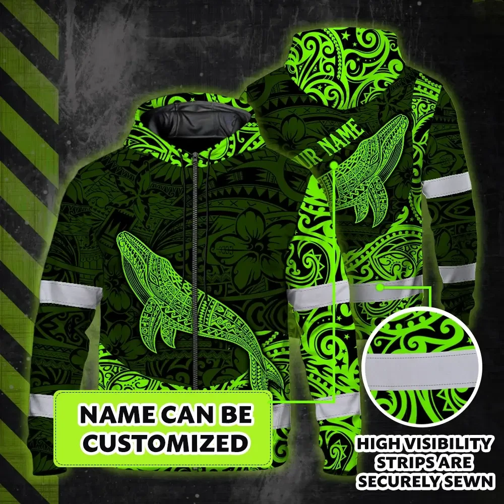 Hi Vis Zip Hoodie Reflective Tapes Green Neon Hawaii Whale Custom Name Safety Workwear For Workers, Truckers, Operators