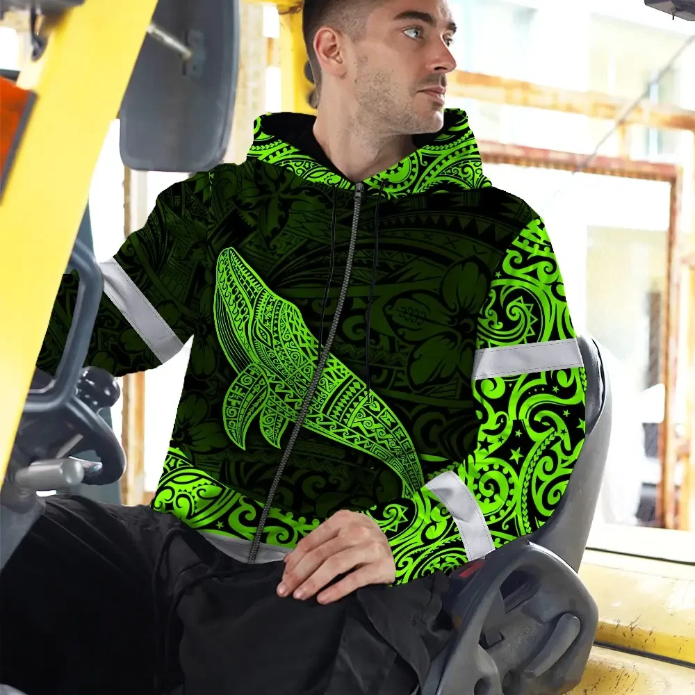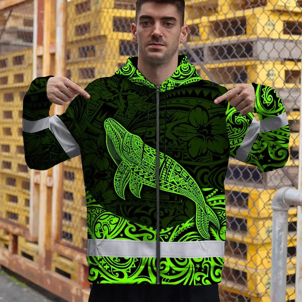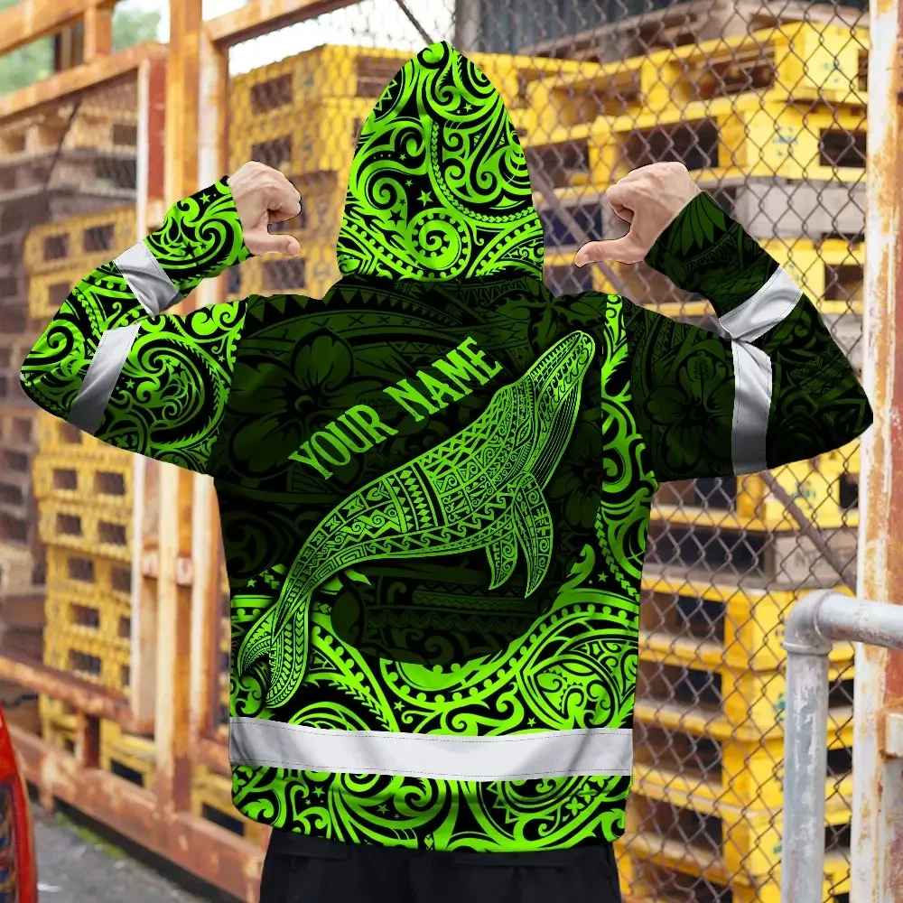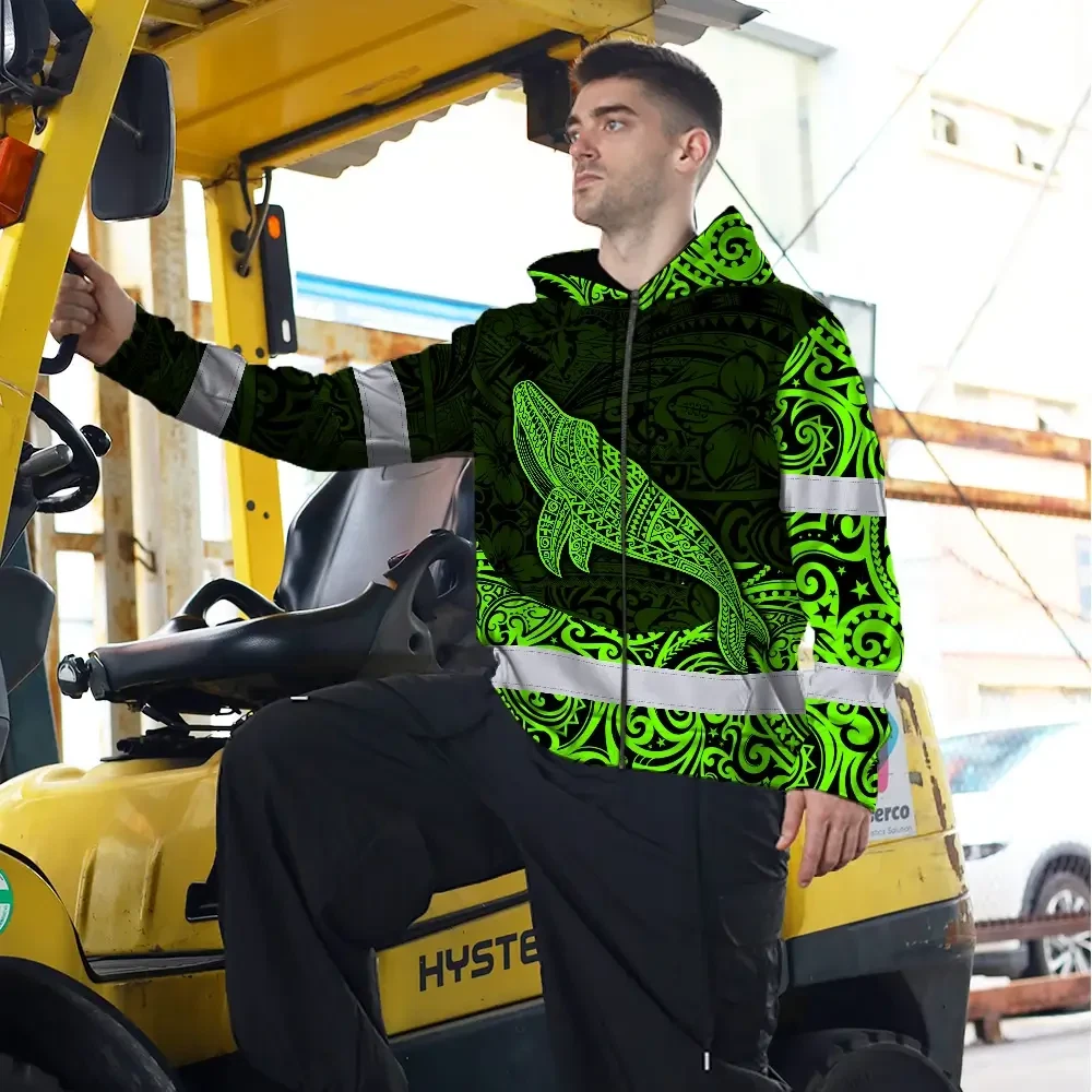 Hi Vis Zip Hoodie Reflective Tapes Green Neon Hawaii Whale Custom Name Safety Workwear For Workers, Truckers, Operators