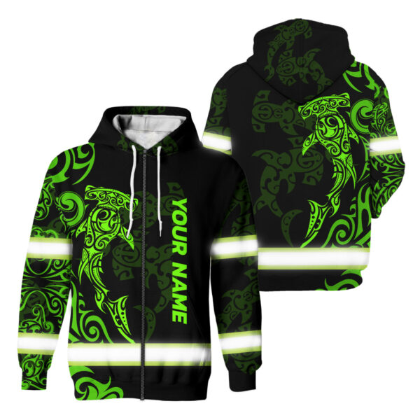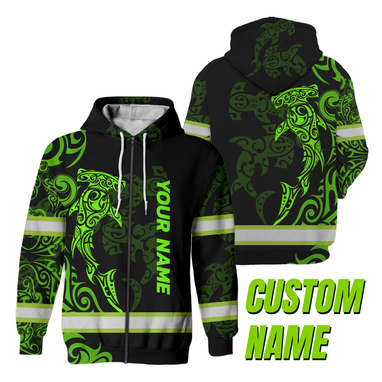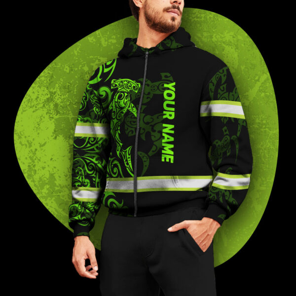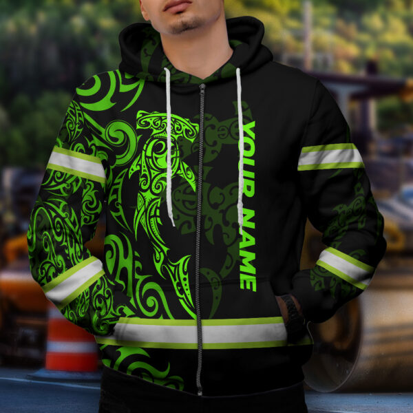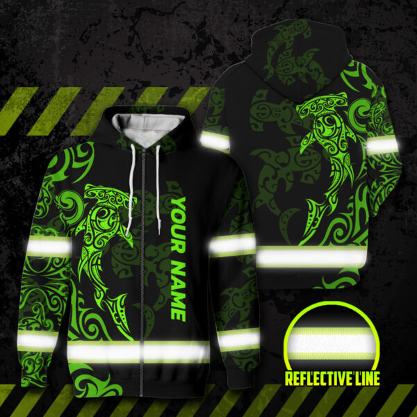 Hi Vis Zip Hoodie Reflective Tapes Green Neon Shark Hawaii Polynesian Custom Name Safety Workwear For Workers, Operator, Cyclists, Patriotic quantity