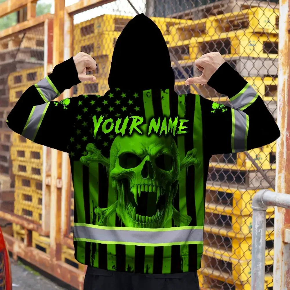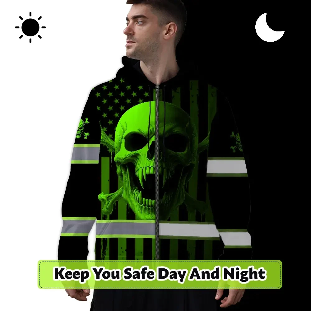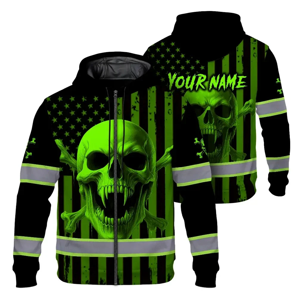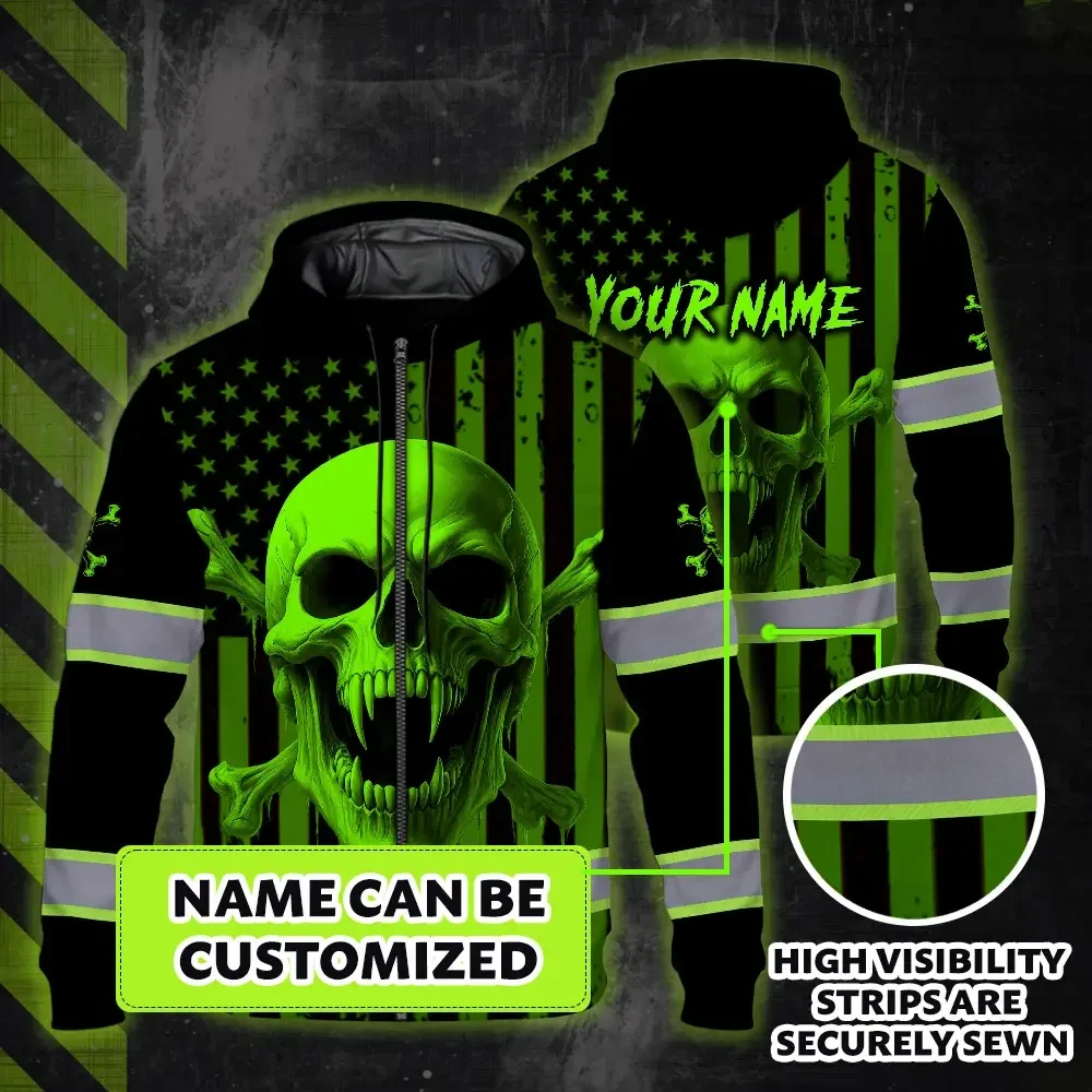 Hi Vis Zip Hoodie Reflective Tapes Green Neon Skull US Flag 2 Custom Name