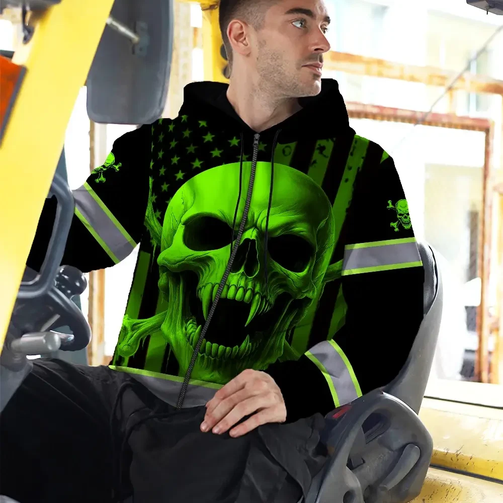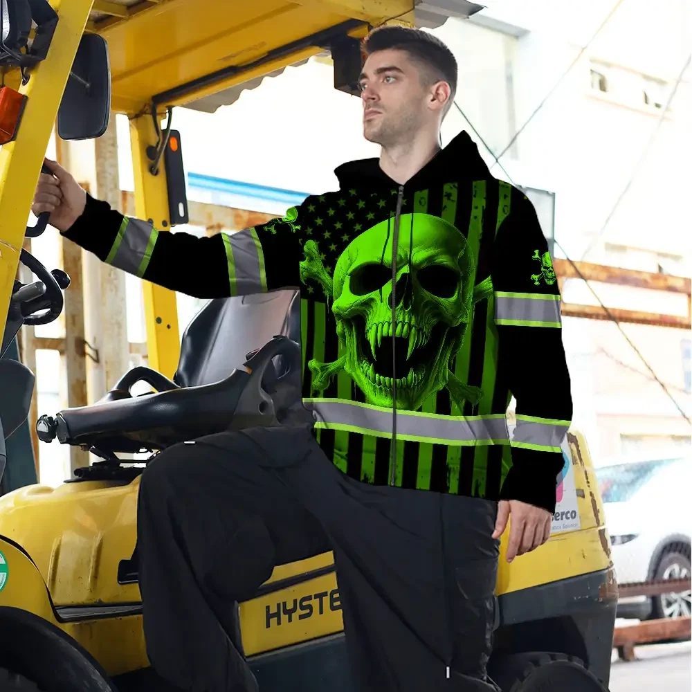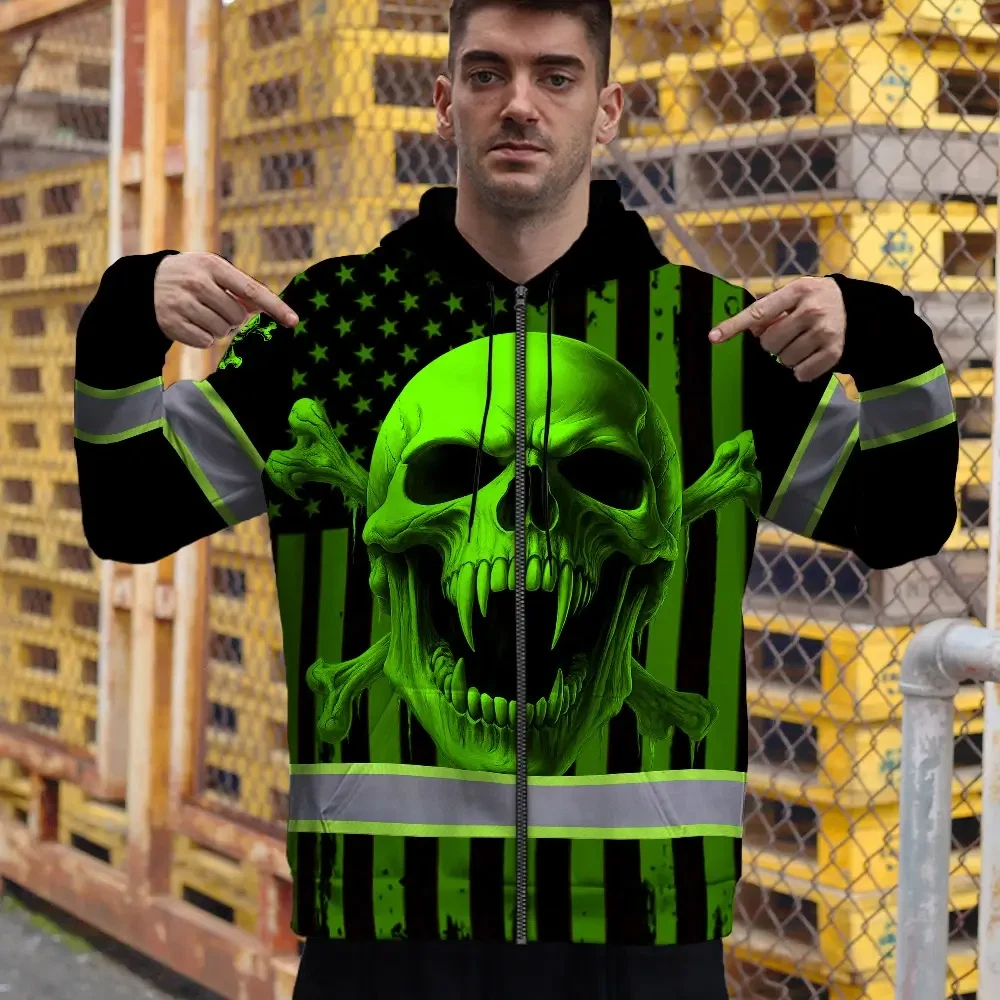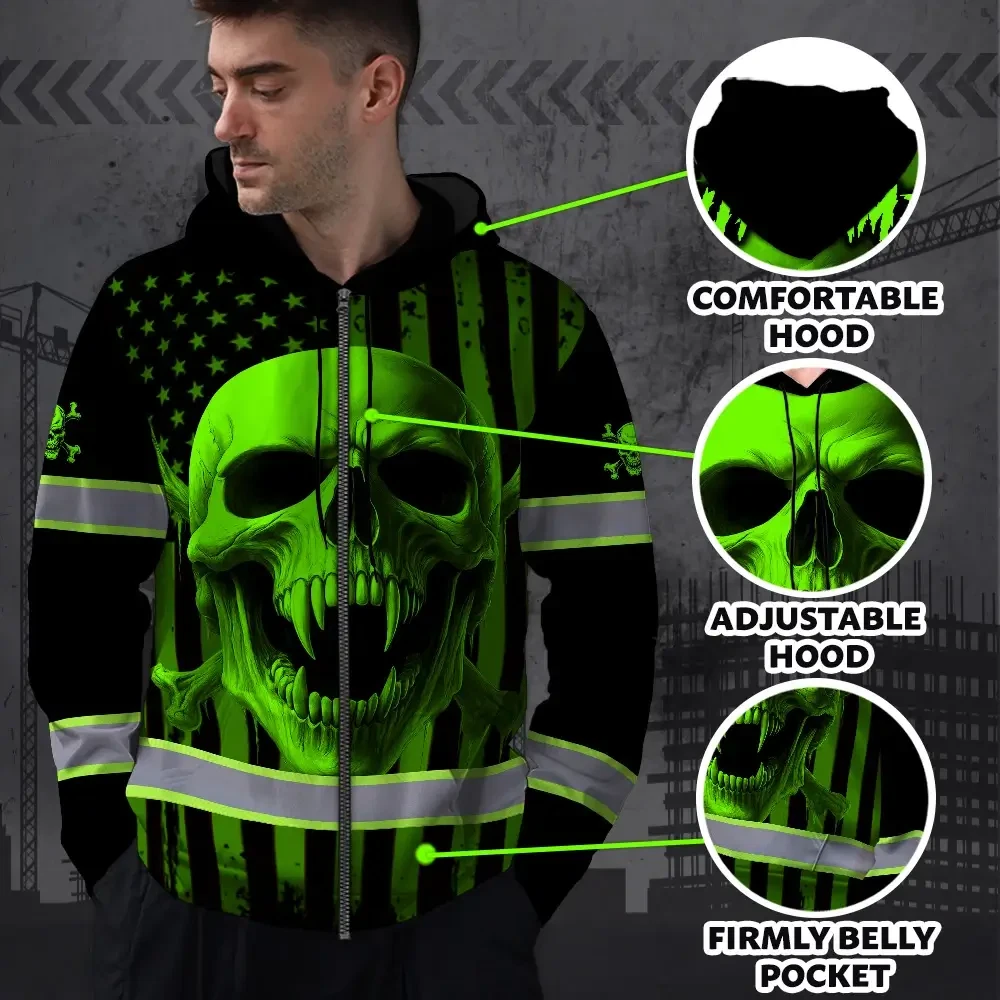 Hi Vis Zip Hoodie Reflective Tapes Green Neon Skull US Flag 2 Custom Name