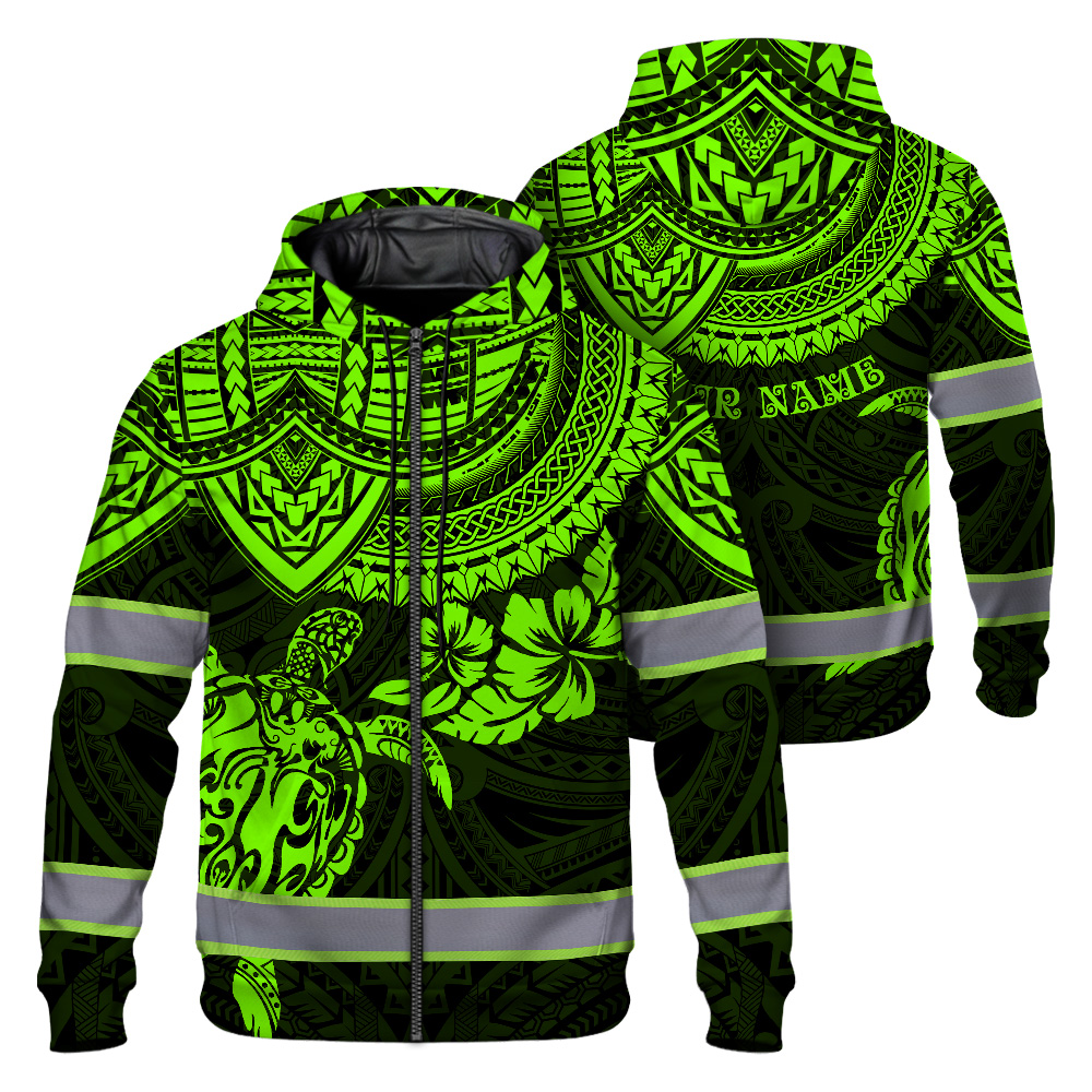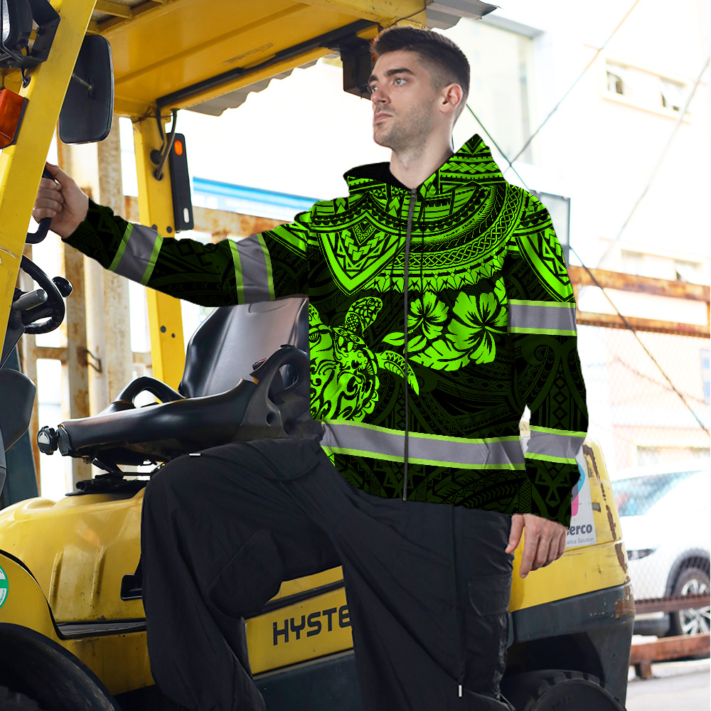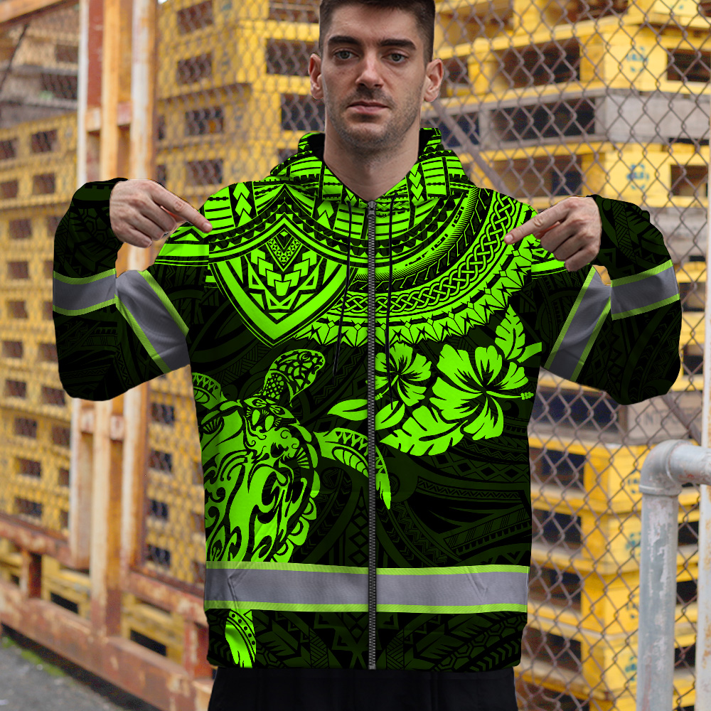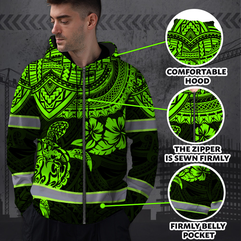 Hi Vis Zip Hoodie Reflective Tapes Green Turtle Flower Hawaiian Polynesian