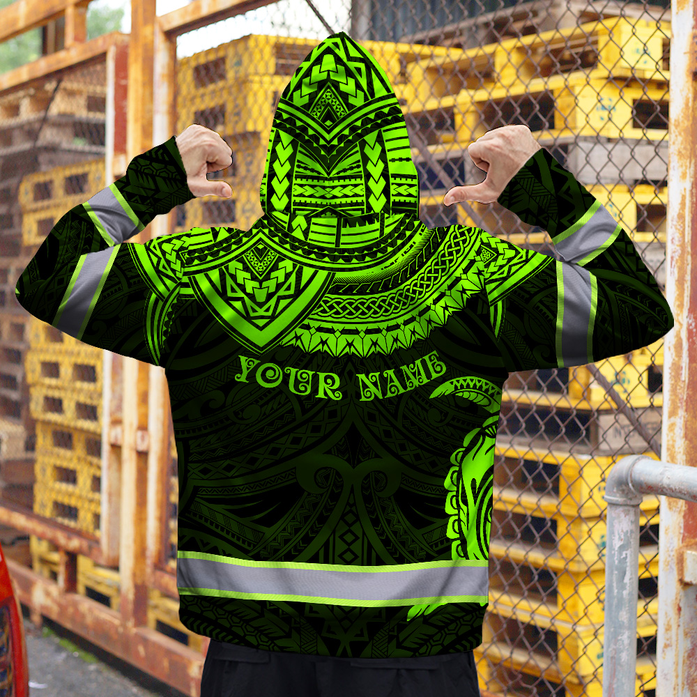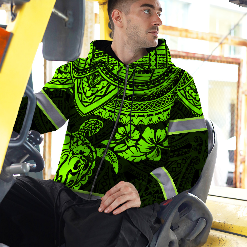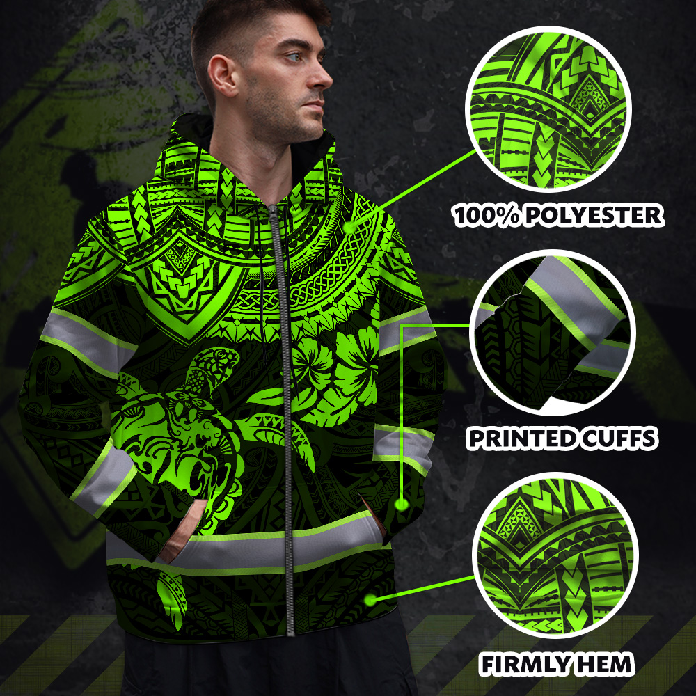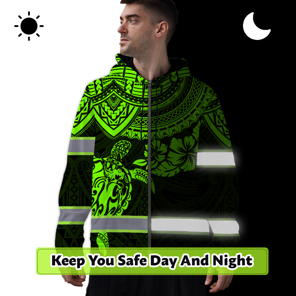 Hi Vis Zip Hoodie Reflective Tapes Green Turtle Flower Hawaiian Polynesian Key Features