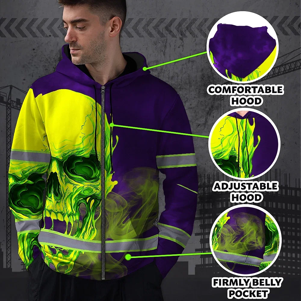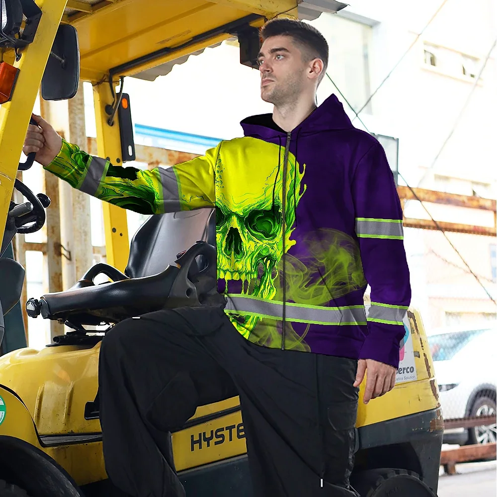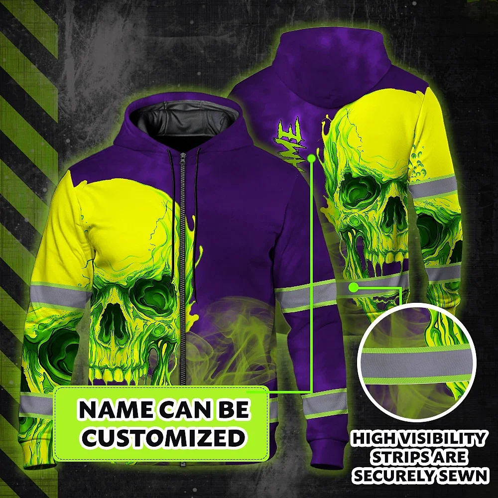 Hi Vis Zip Hoodie Reflective Tapes Green Violet Skull Custom Name Safety Workwear For Workers, Truckers, Operators