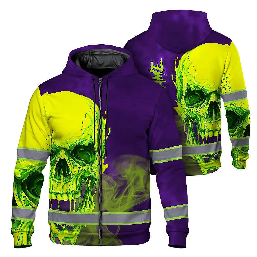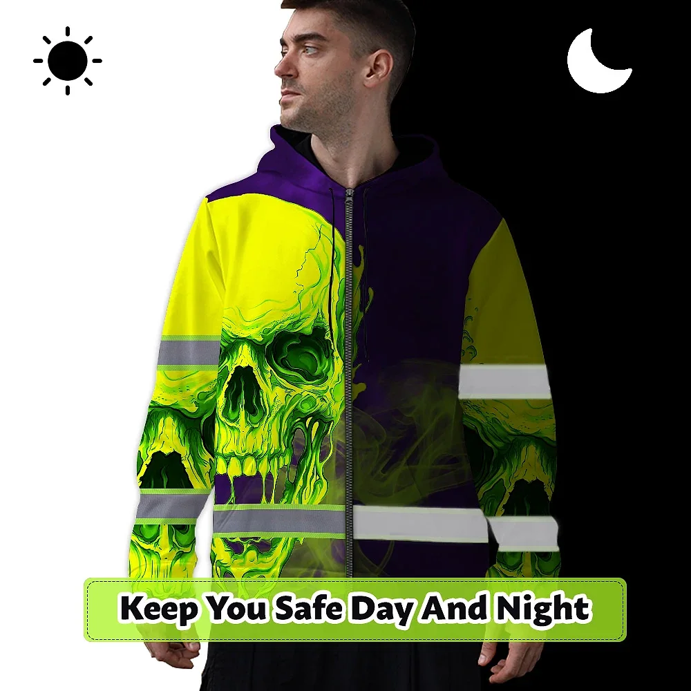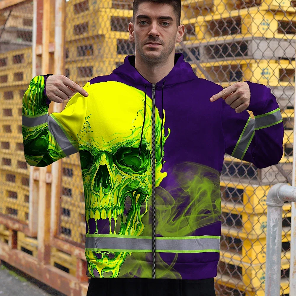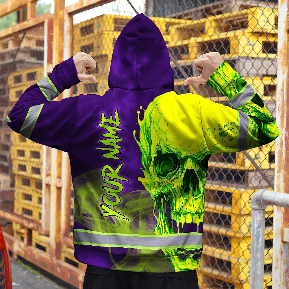 Hi Vis Zip Hoodie Reflective Tapes Green Violet Skull Custom Name Safety Workwear For Workers, Truckers, Operators