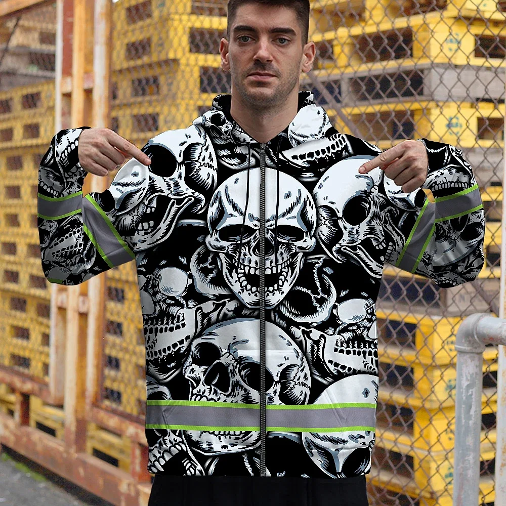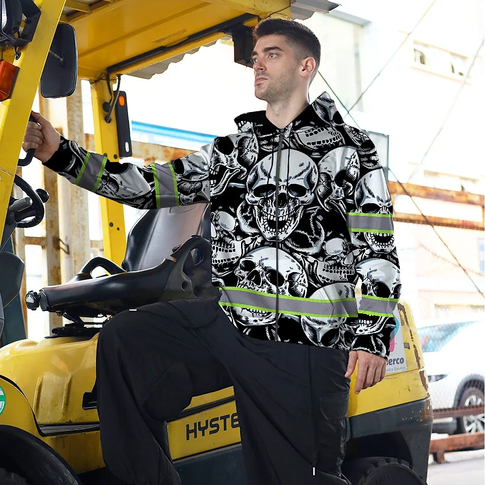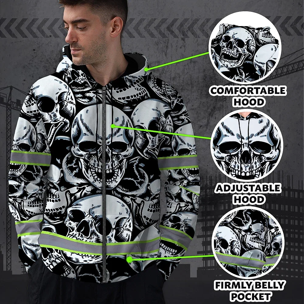 Hi Vis Zip Hoodie Reflective Tapes Grey Black Skull Custom Name Safety Workwear For Workers, Truckers, Operators