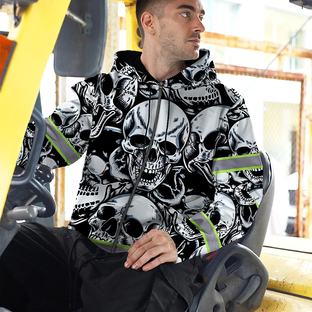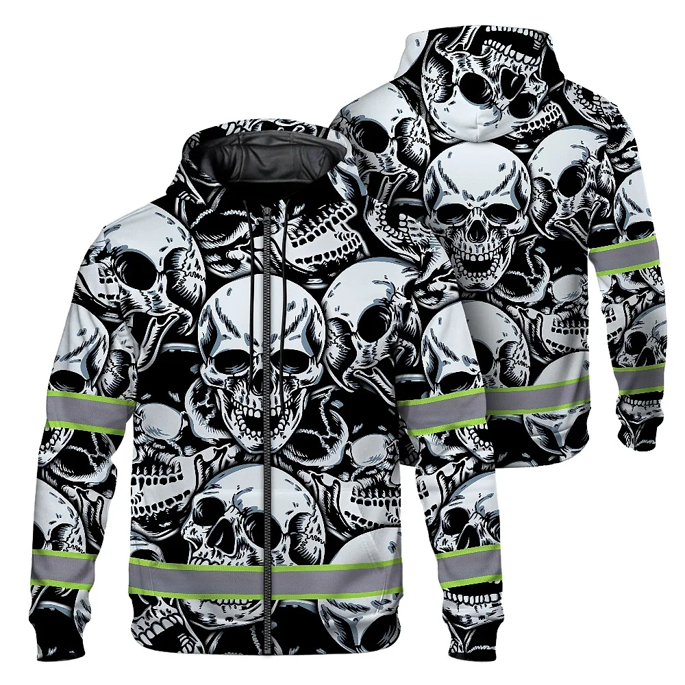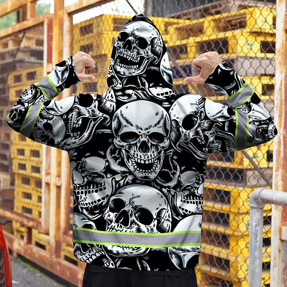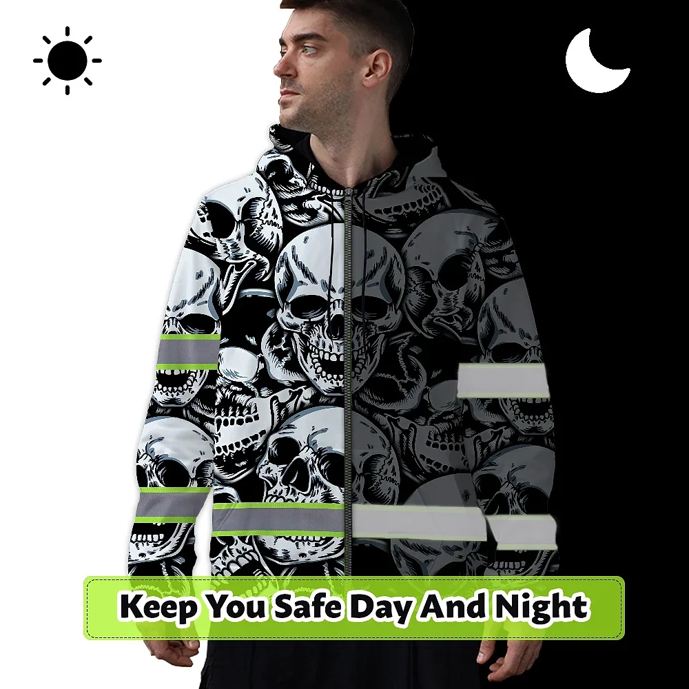 Hi Vis Zip Hoodie Reflective Tapes Grey Black Skull Custom Name Safety Workwear For Workers, Truckers, Operators