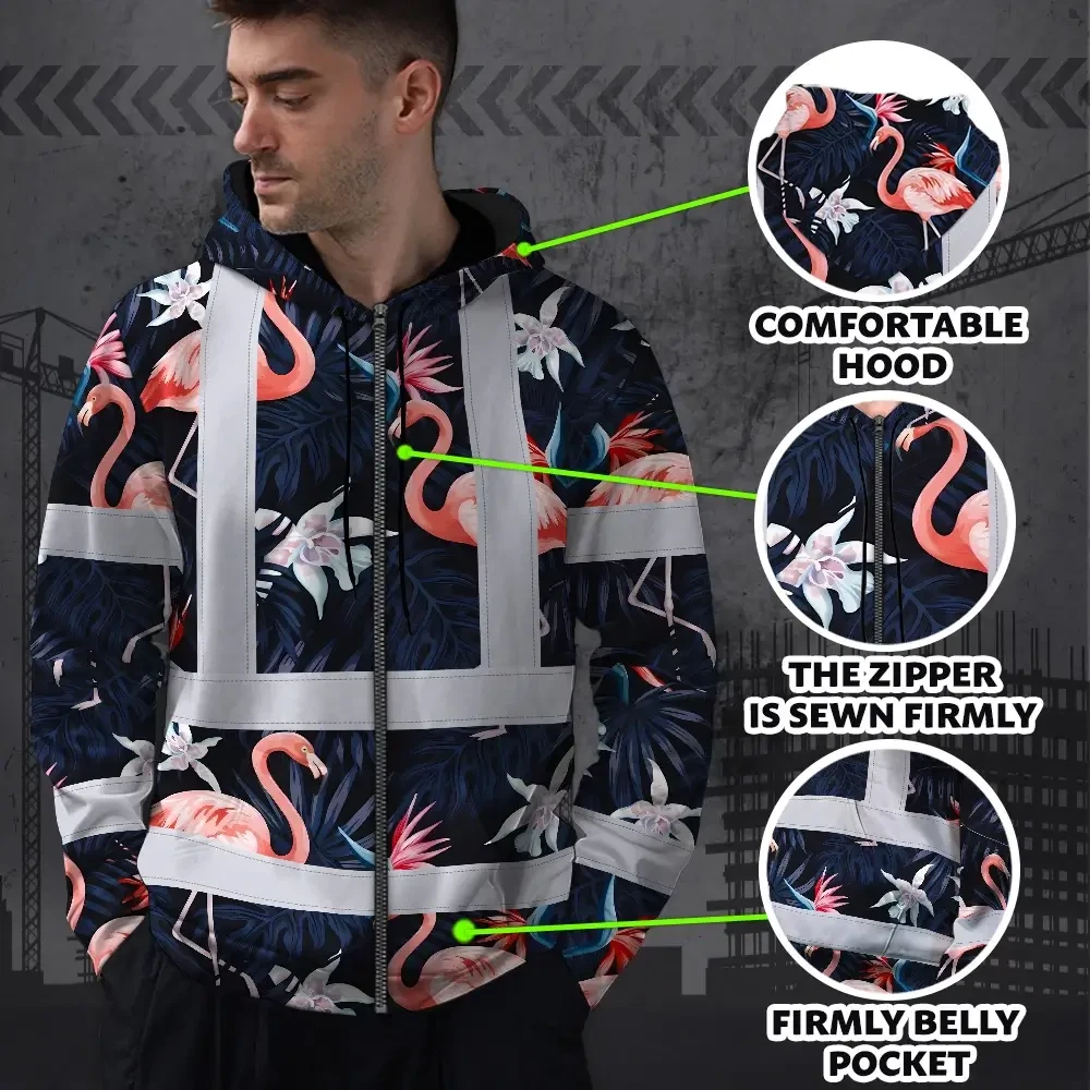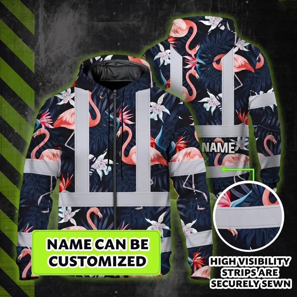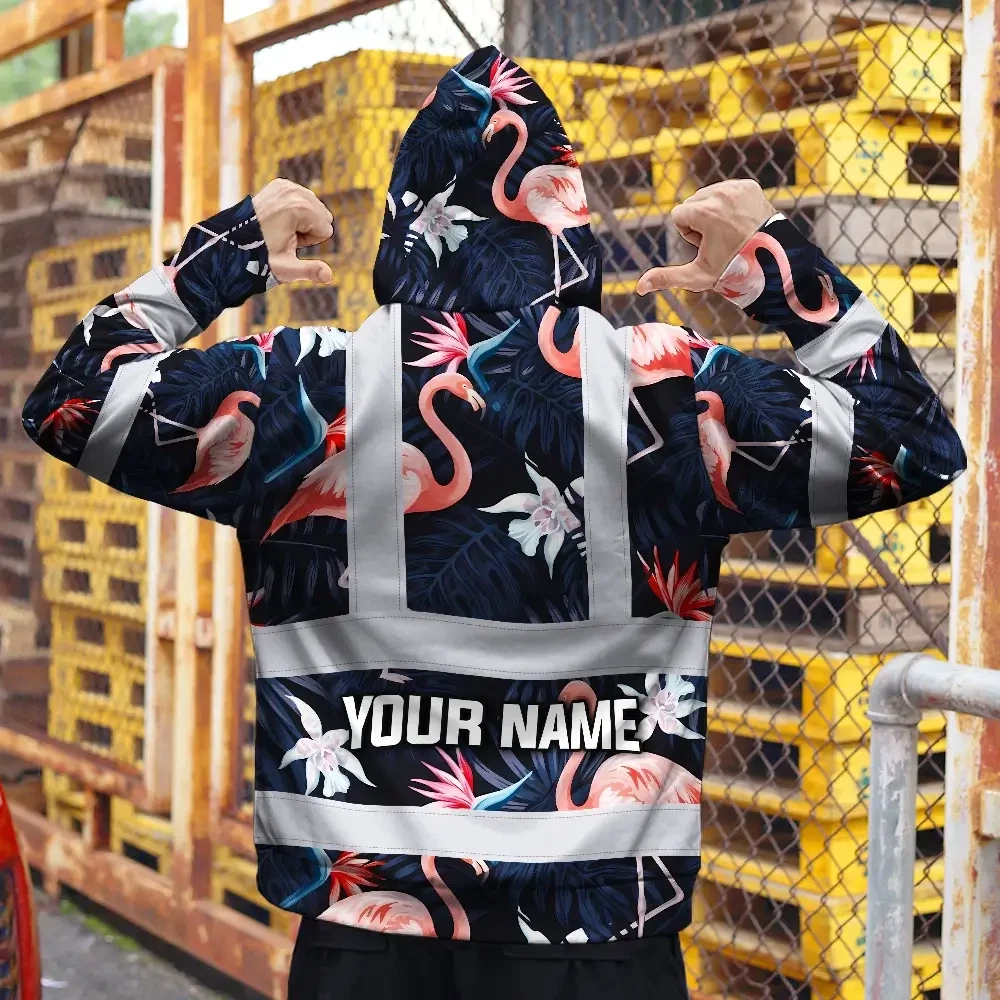 Hi Vis Zip Hoodie Reflective Tapes Hawaii Flamingo 2 Custom Name Safety Workwear For Workers, Truckers, Operators