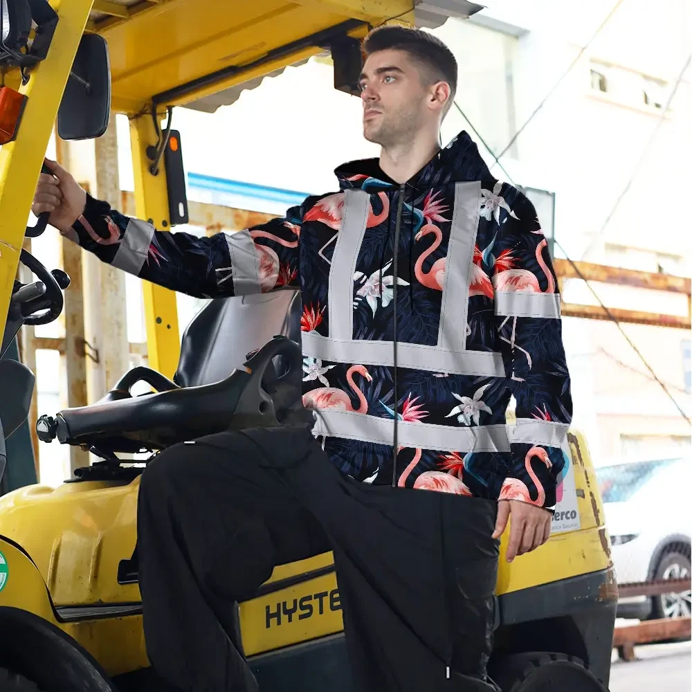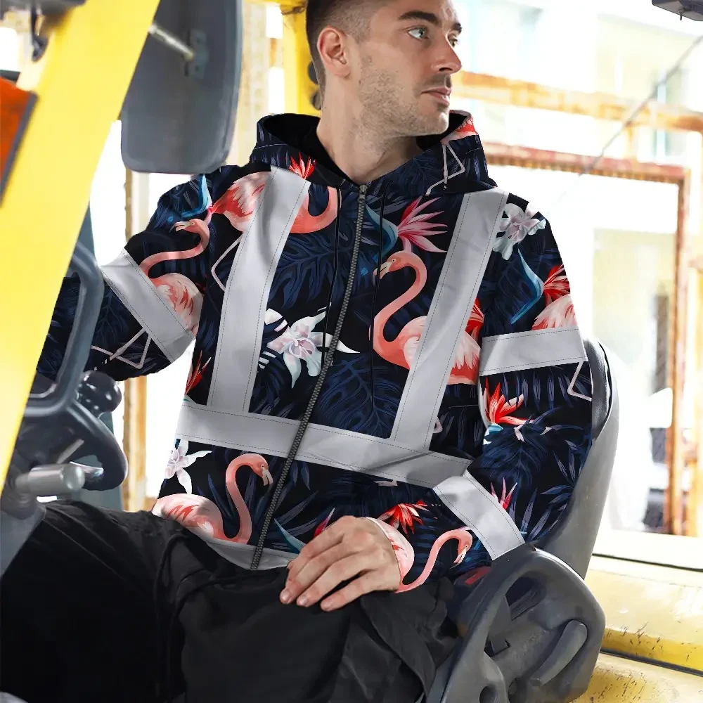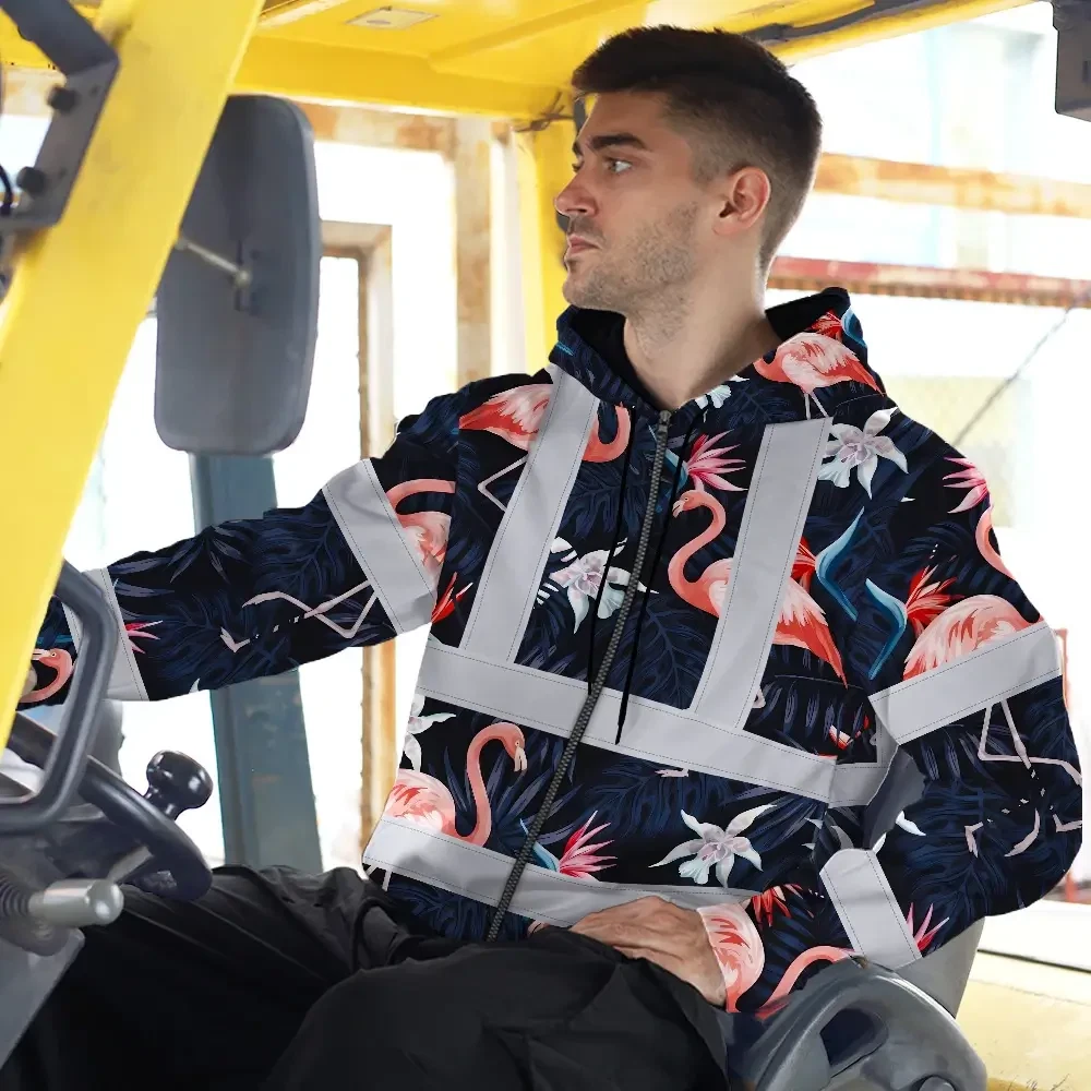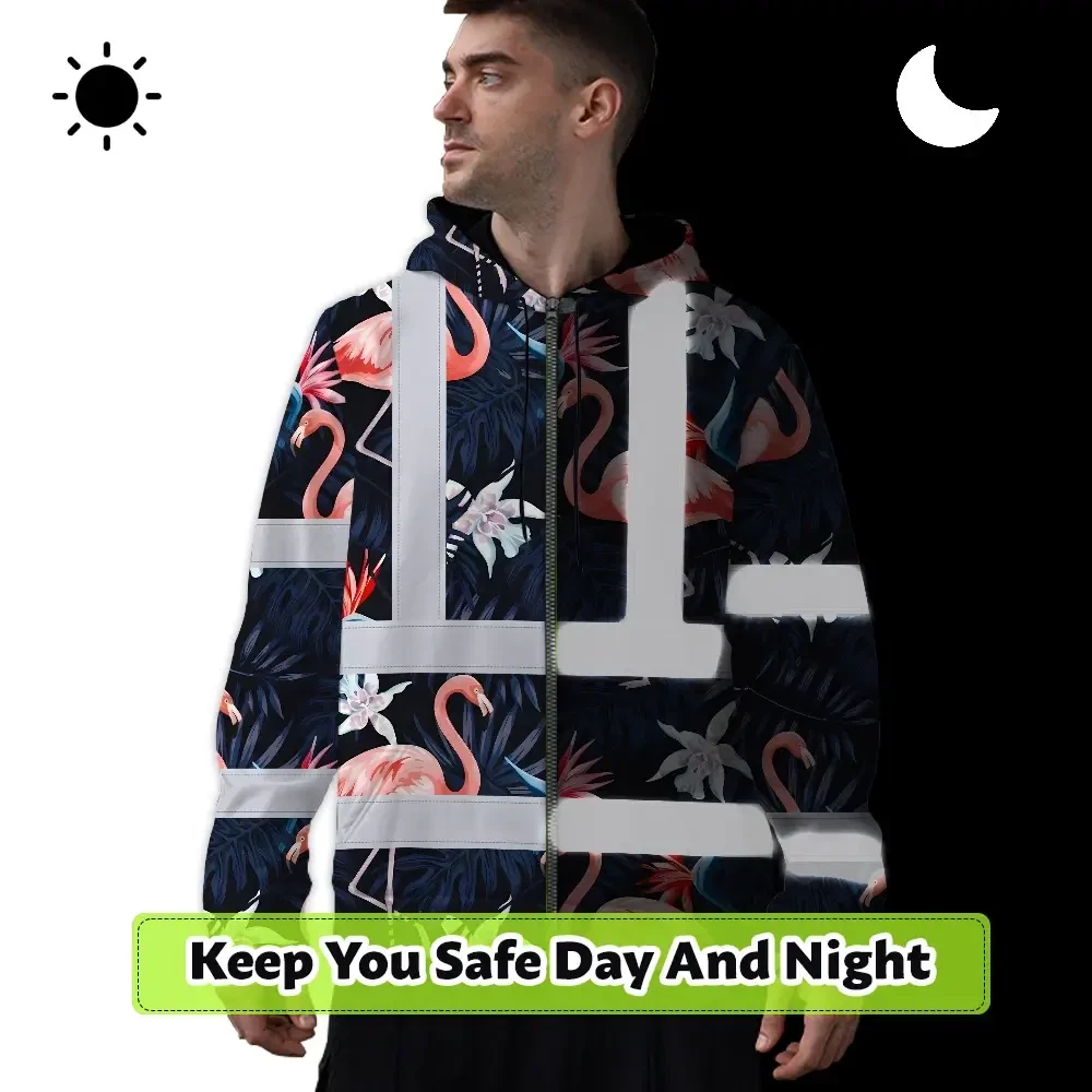 Hi Vis Zip Hoodie Reflective Tapes Hawaii Flamingo 2 Custom Name Safety Workwear For Workers, Truckers, Operators