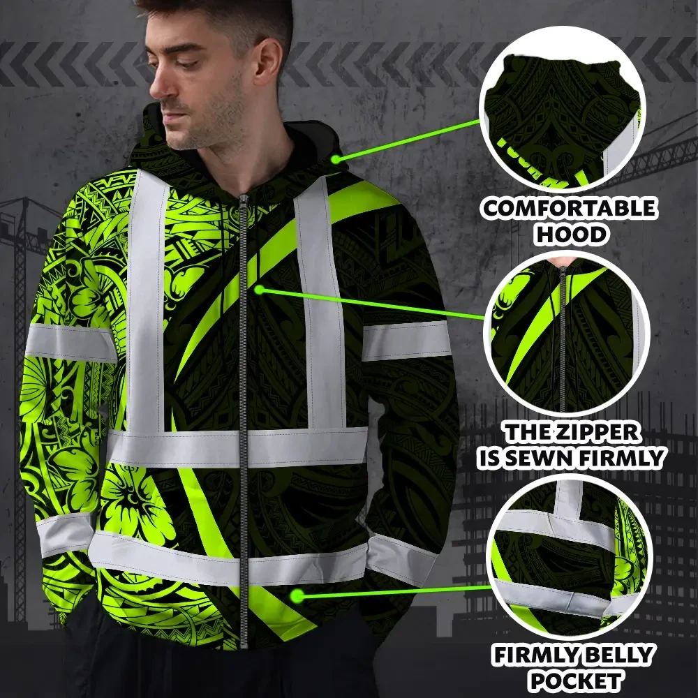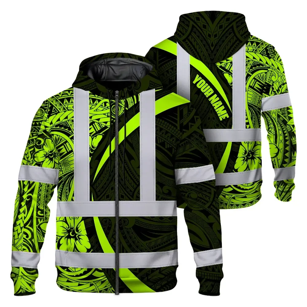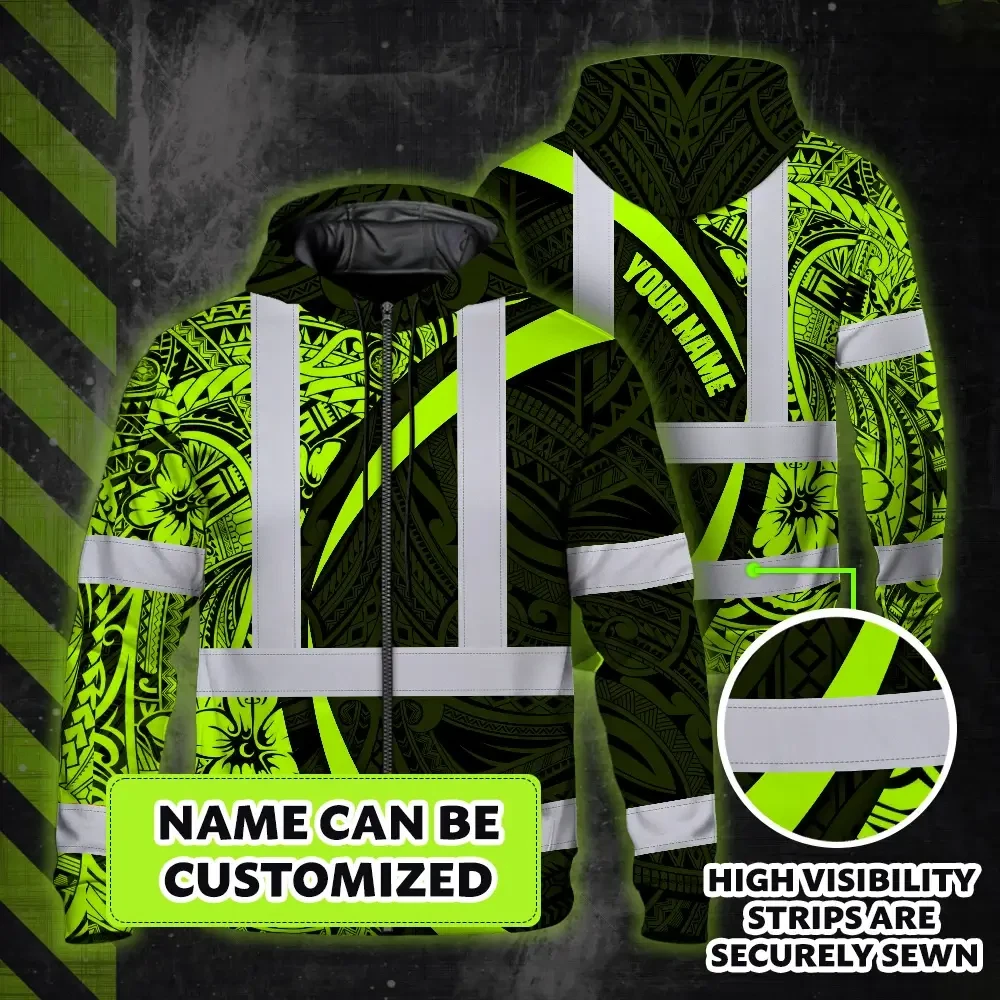 Hi Vis Zip Hoodie Reflective Tapes Hawaiian Polynesian Tribal Custom Name Safety Workwear For Workers, Truckers, Operators