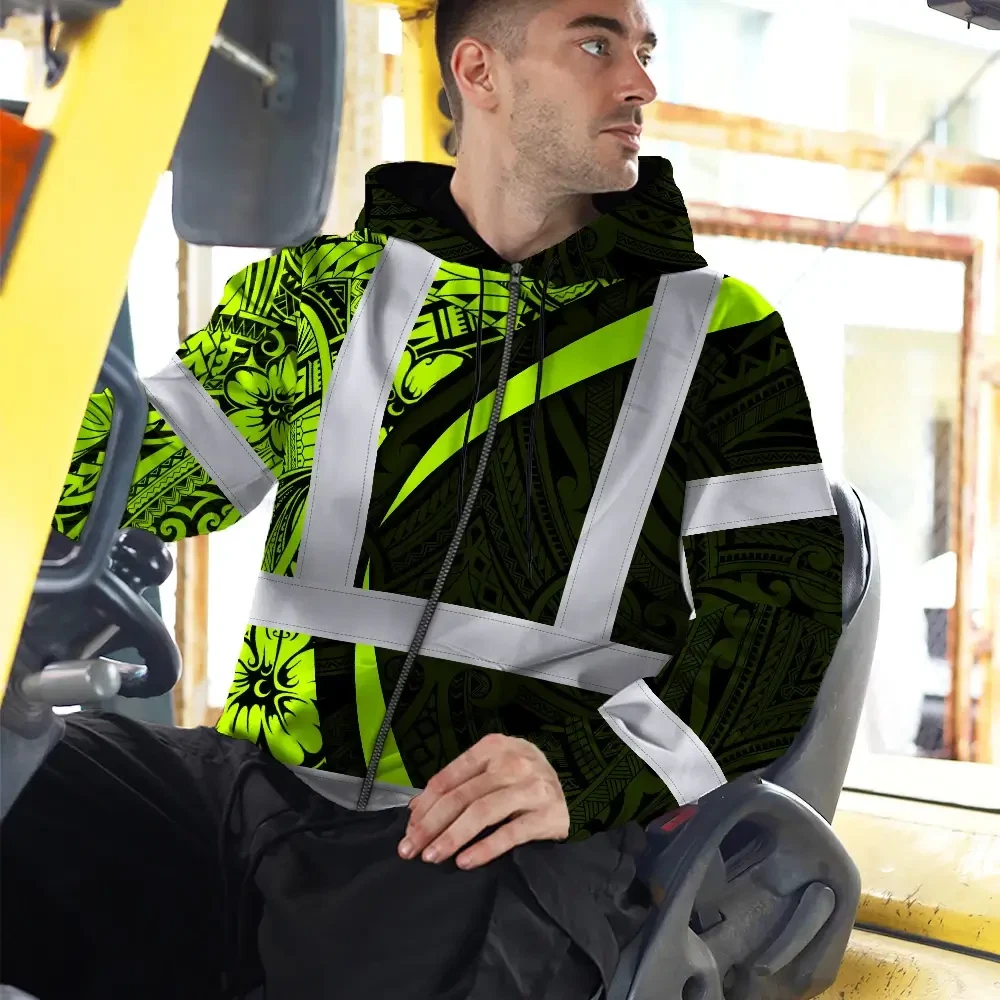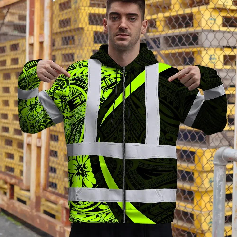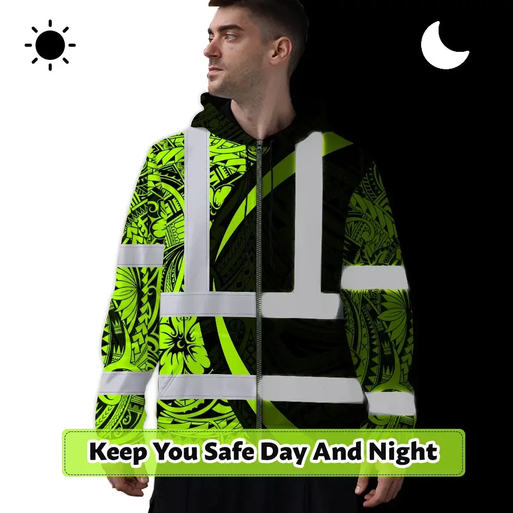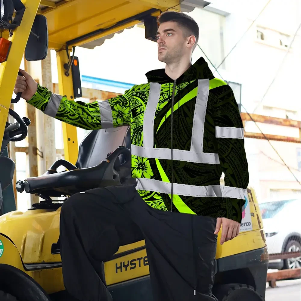 Hi Vis Zip Hoodie Reflective Tapes Hawaiian Polynesian Tribal Custom Name Safety Workwear For Workers, Truckers, Operators