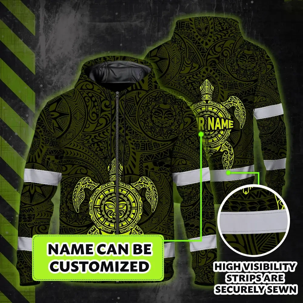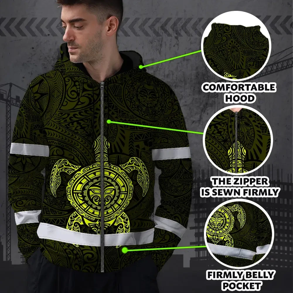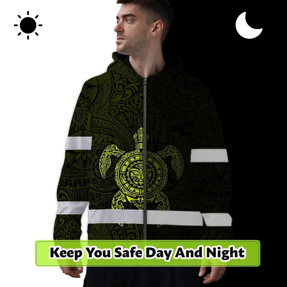 Hi Vis Zip Hoodie Reflective Tapes Lime Neon Hawaii Turtle Custom Name Safety Workwear For Workers, Truckers, Operators