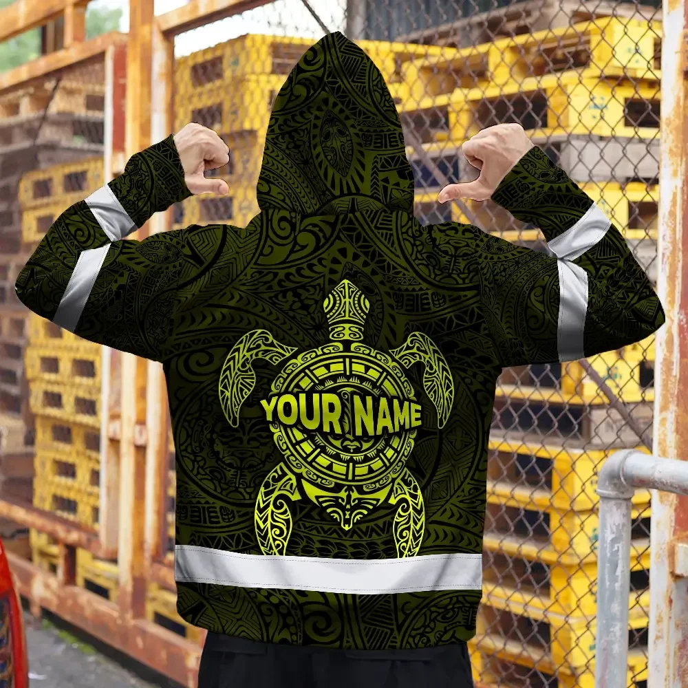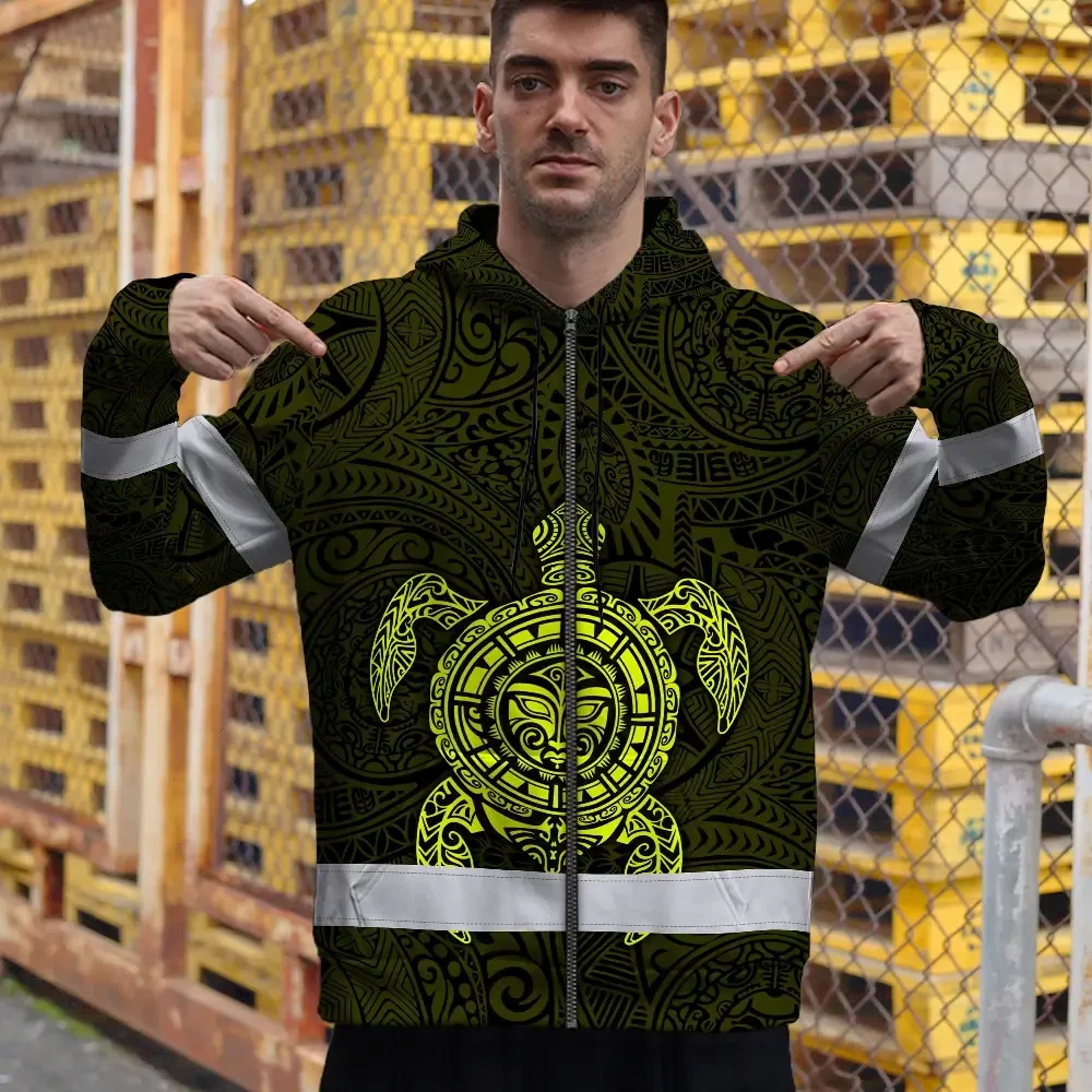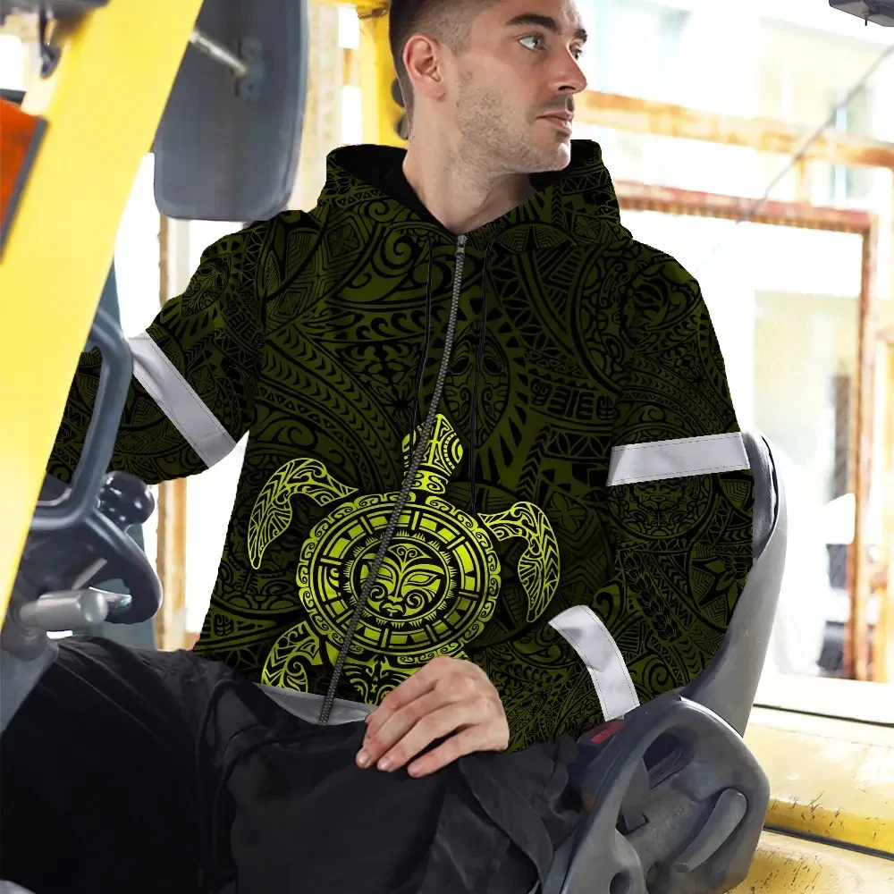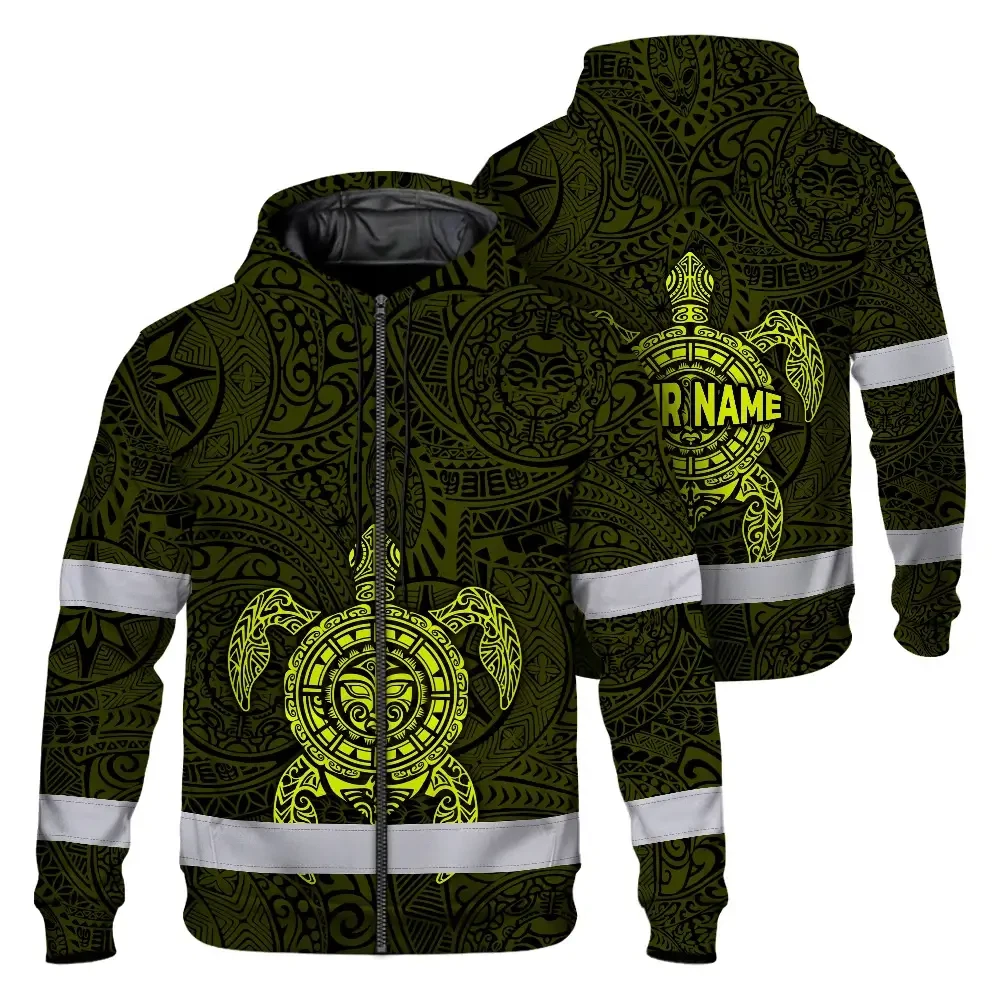 Hi Vis Zip Hoodie Reflective Tapes Lime Neon Hawaii Turtle Custom Name Safety Workwear For Workers, Truckers, Operators