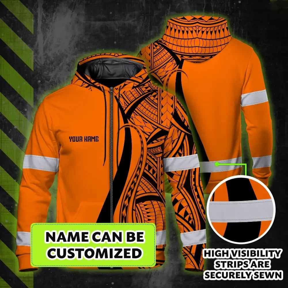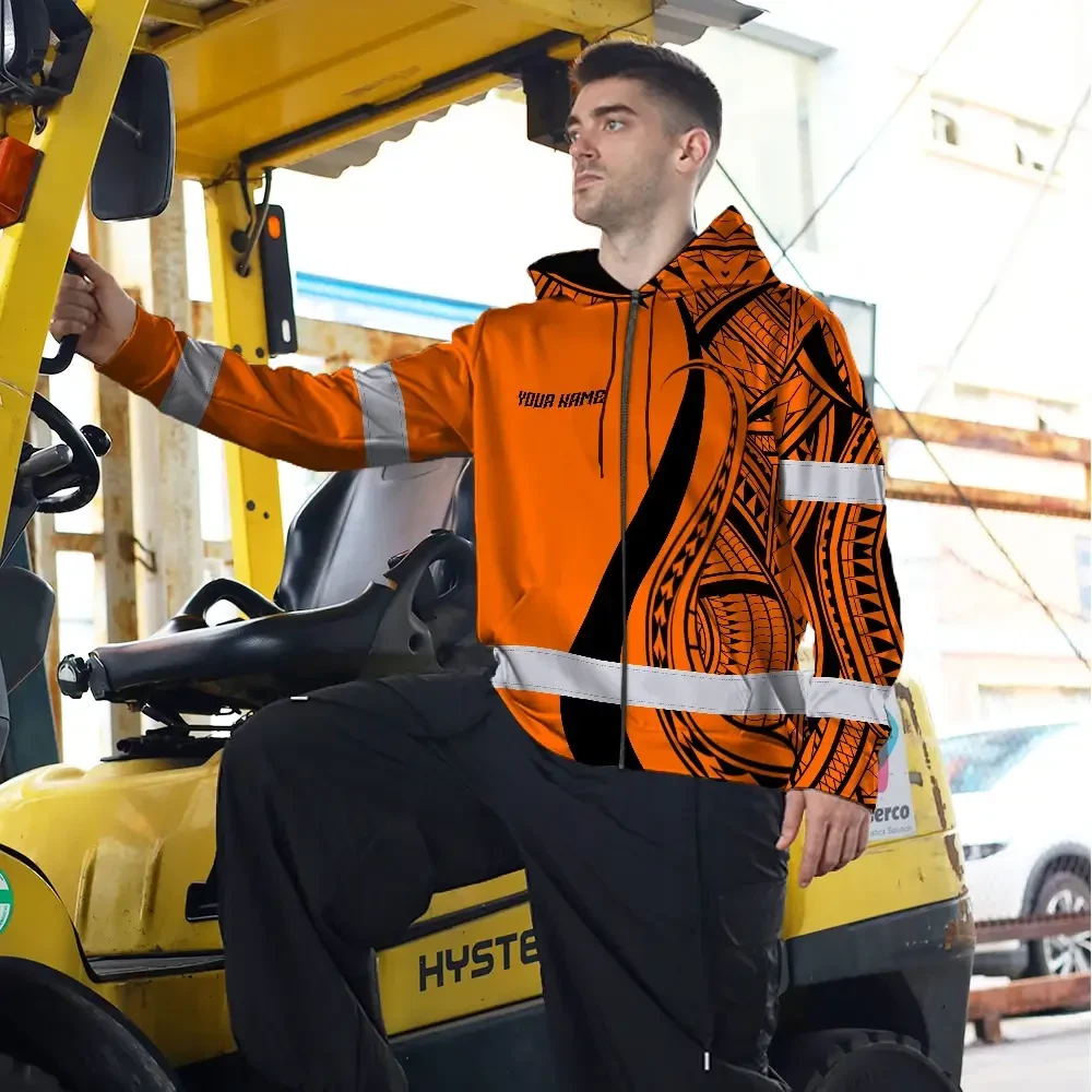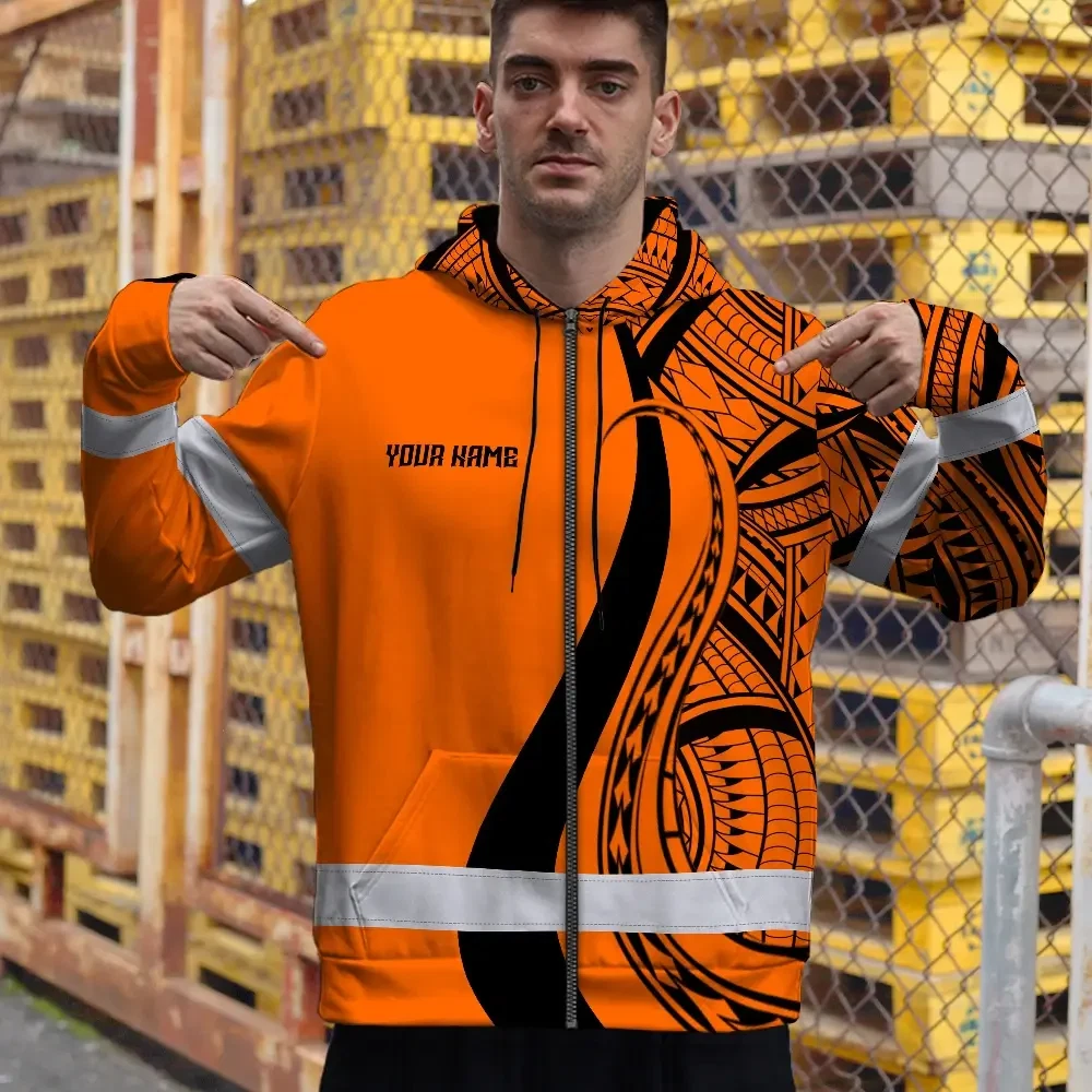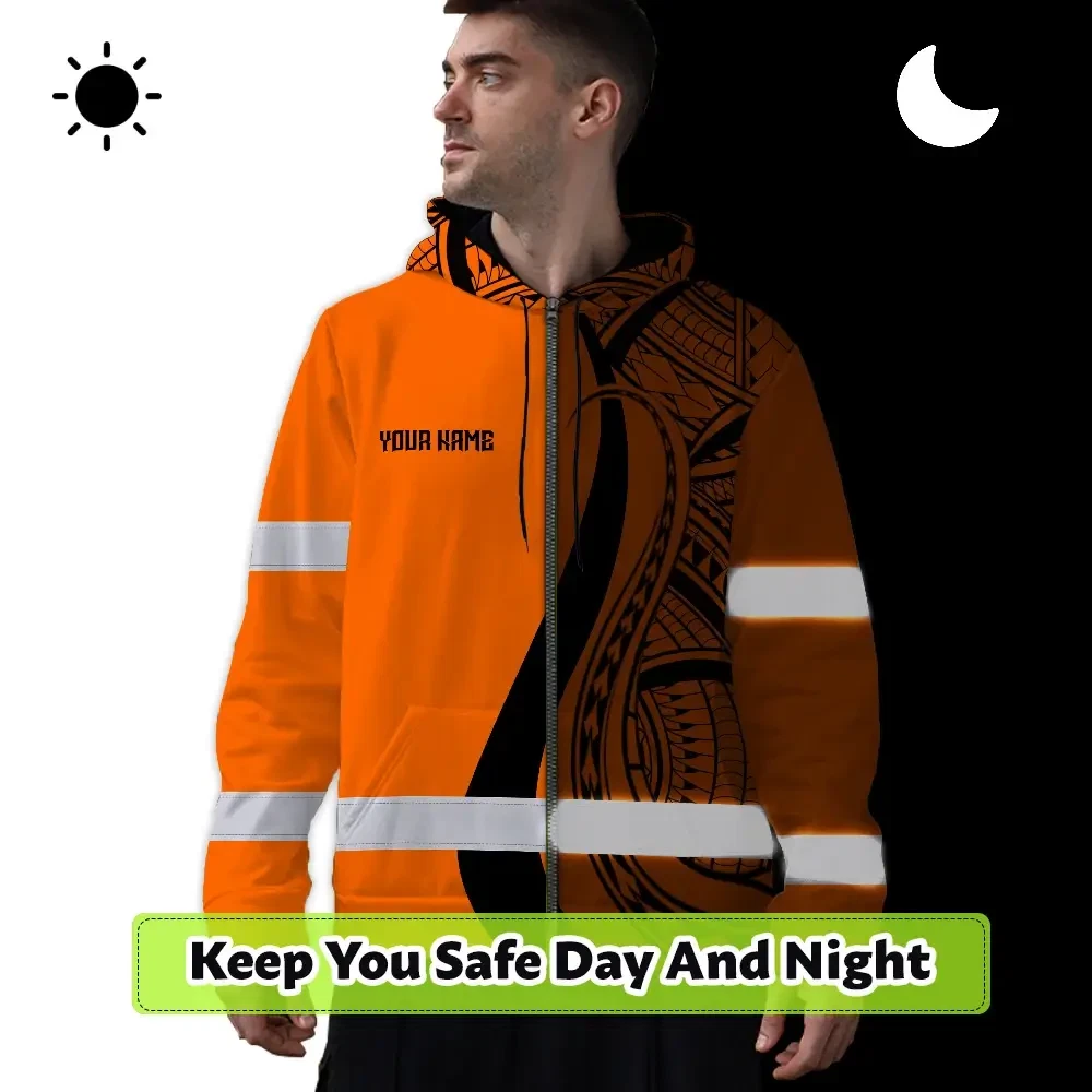 Hi Vis Zip Hoodie Reflective Tapes Orange And Black Neon Hawaii Custom Name Safety Workwear For Workers, Truckers, Operators