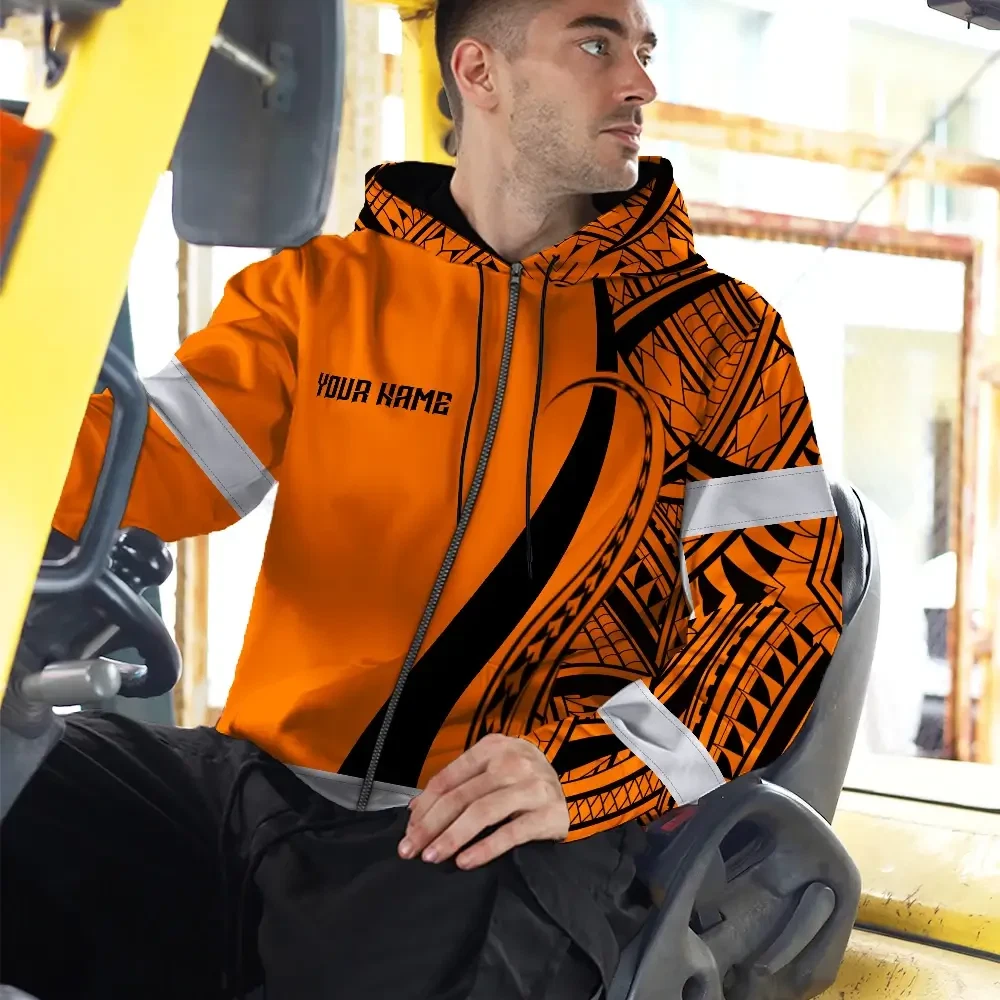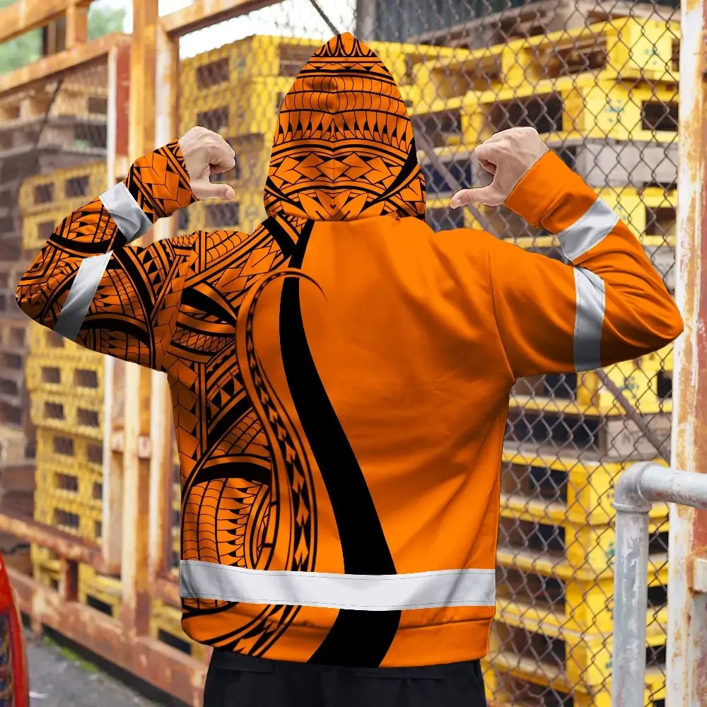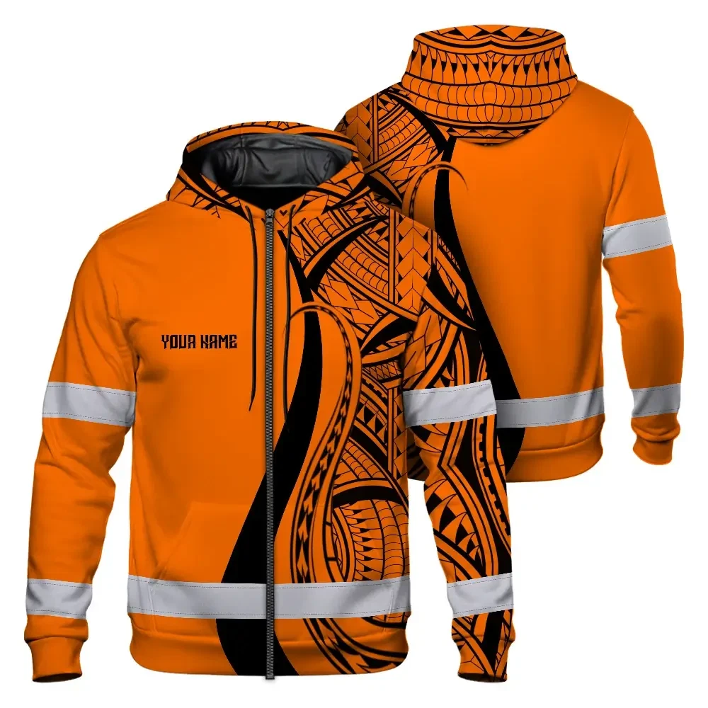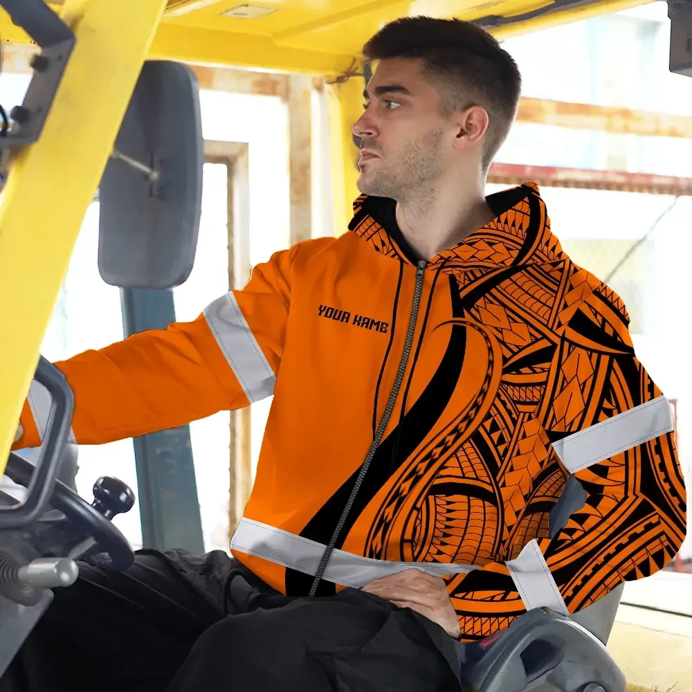 Hi Vis Zip Hoodie Reflective Tapes Orange And Black Neon Hawaii Custom Name Safety Workwear For Workers, Truckers, Operators