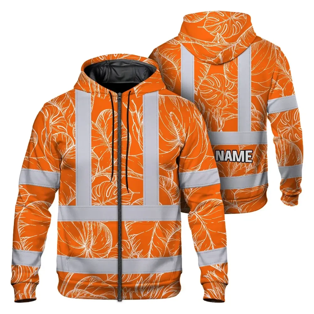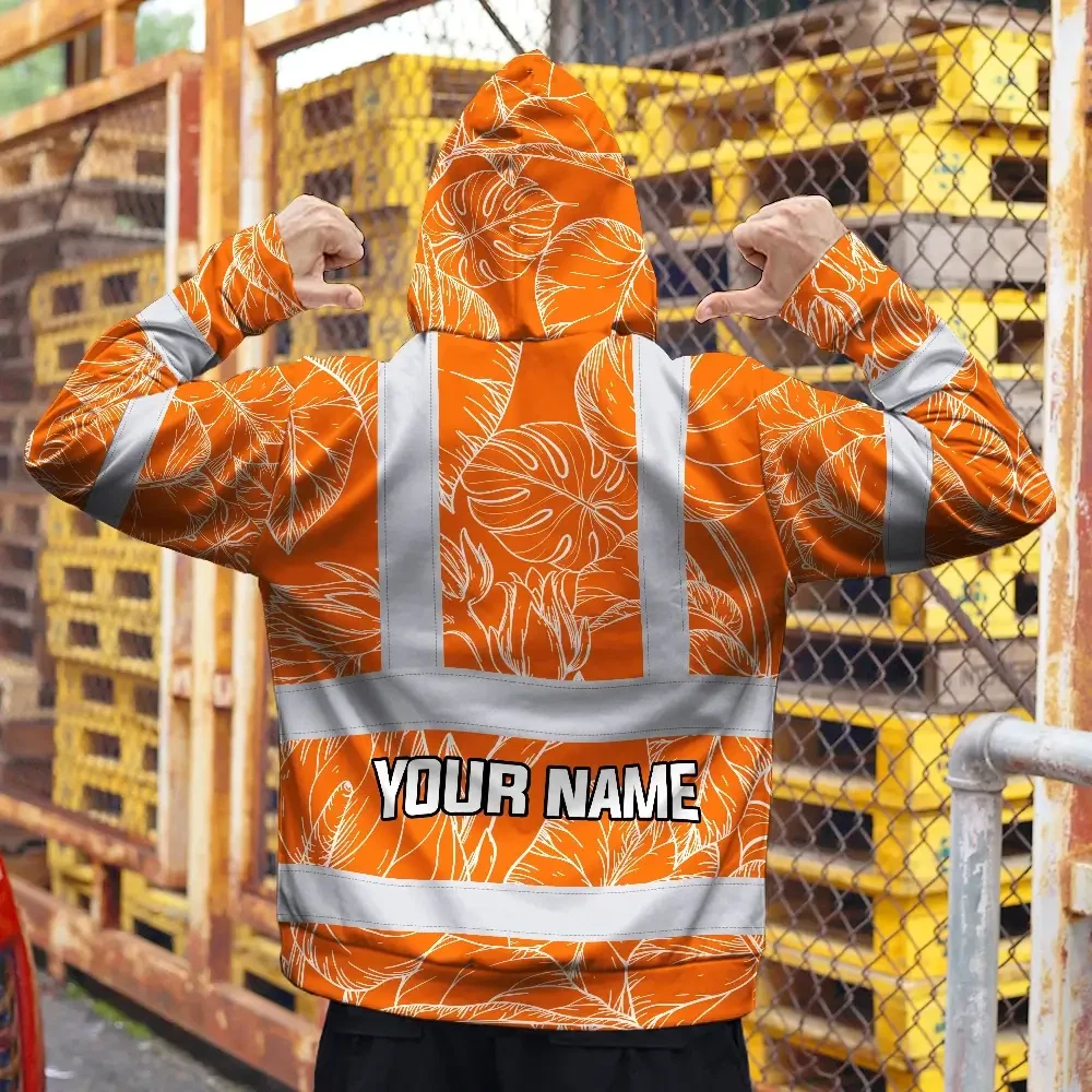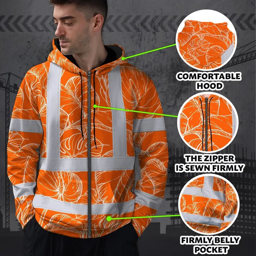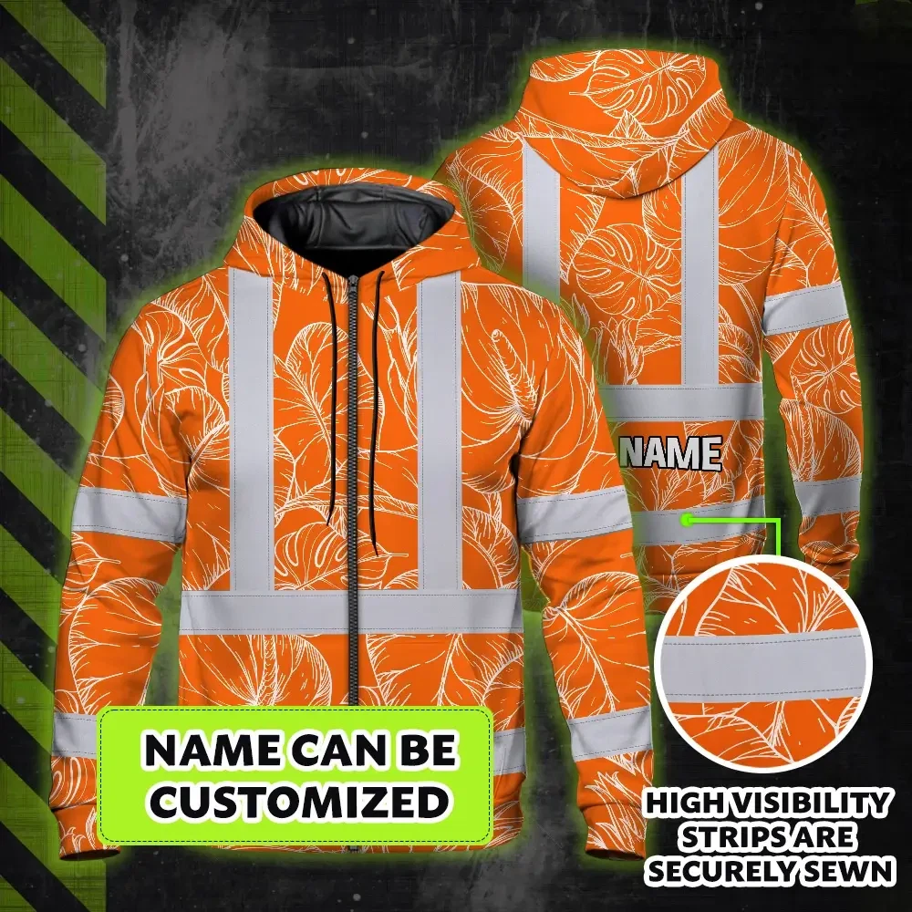 Hi Vis Zip Hoodie Reflective Tapes Orange Black Neon Flowers Custom Name Safety Workwear For Workers, Truckers, Operators