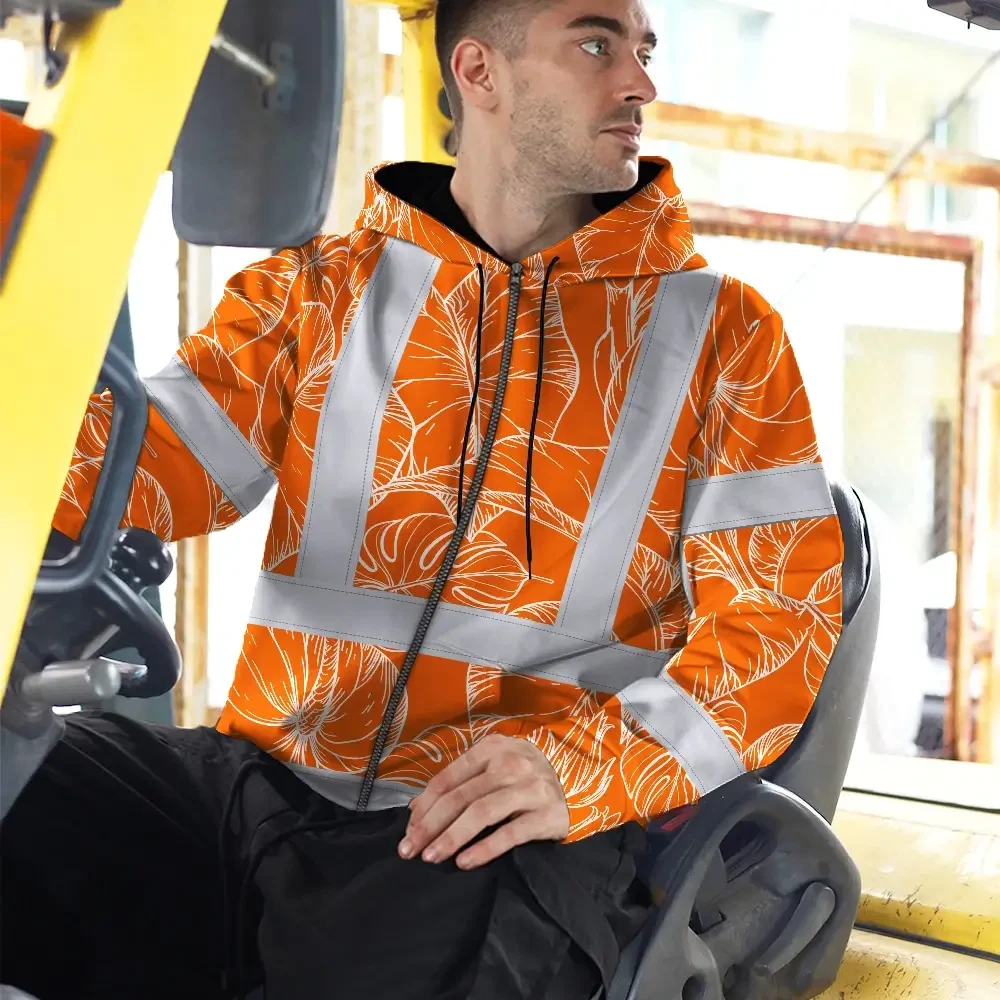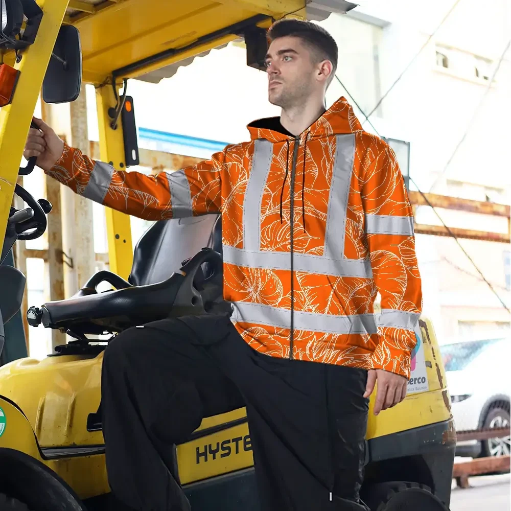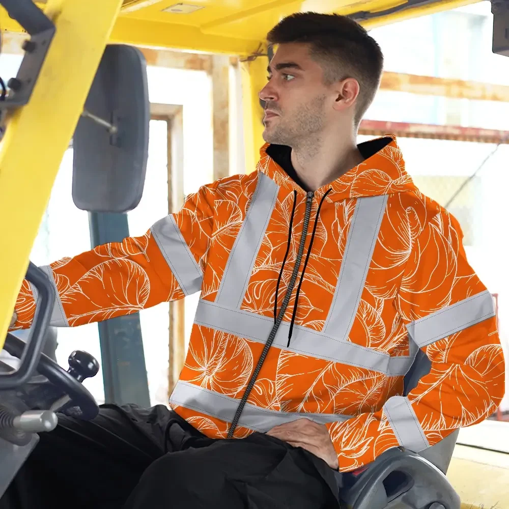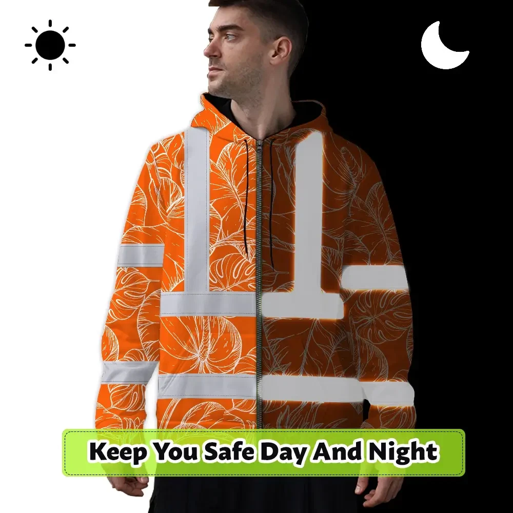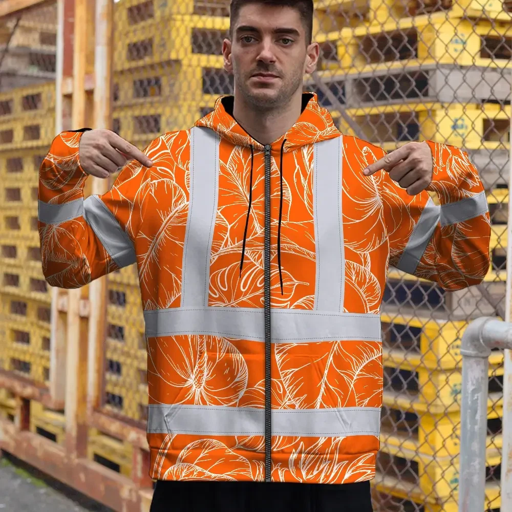 Hi Vis Zip Hoodie Reflective Tapes Orange Black Neon Flowers Custom Name Safety Workwear For Workers, Truckers, Operators