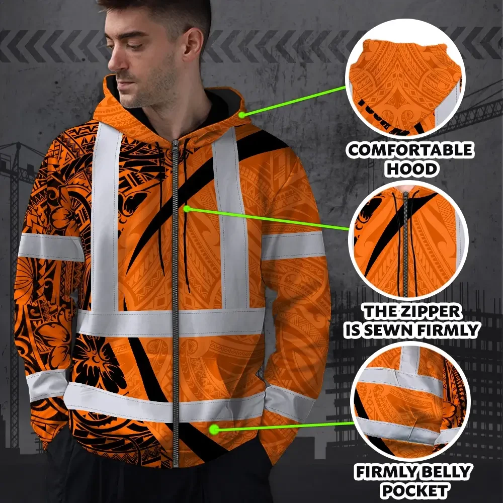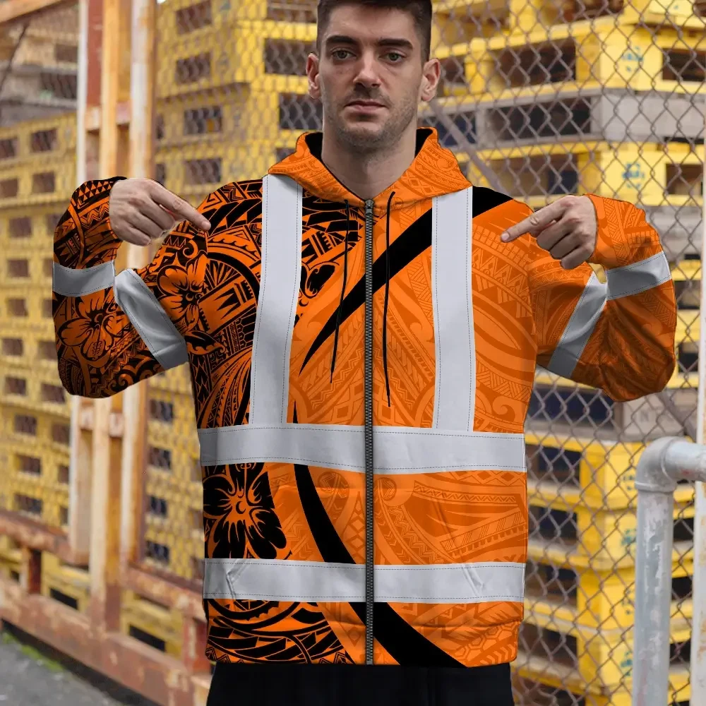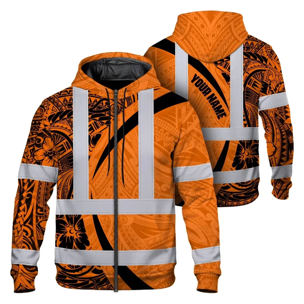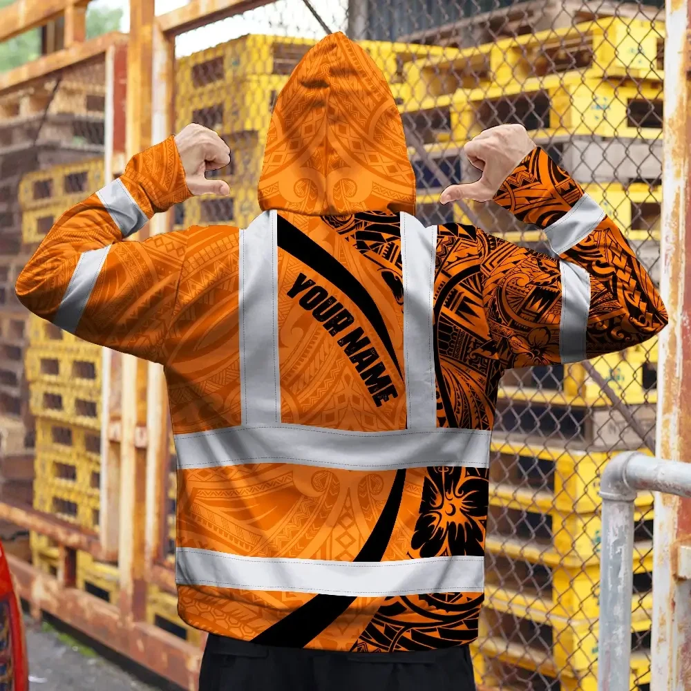 Hi Vis Zip Hoodie Reflective Tapes Orange Hawaiian Polynesian Tribal Custom Name Safety Workwear For Workers, Truckers, Operators
