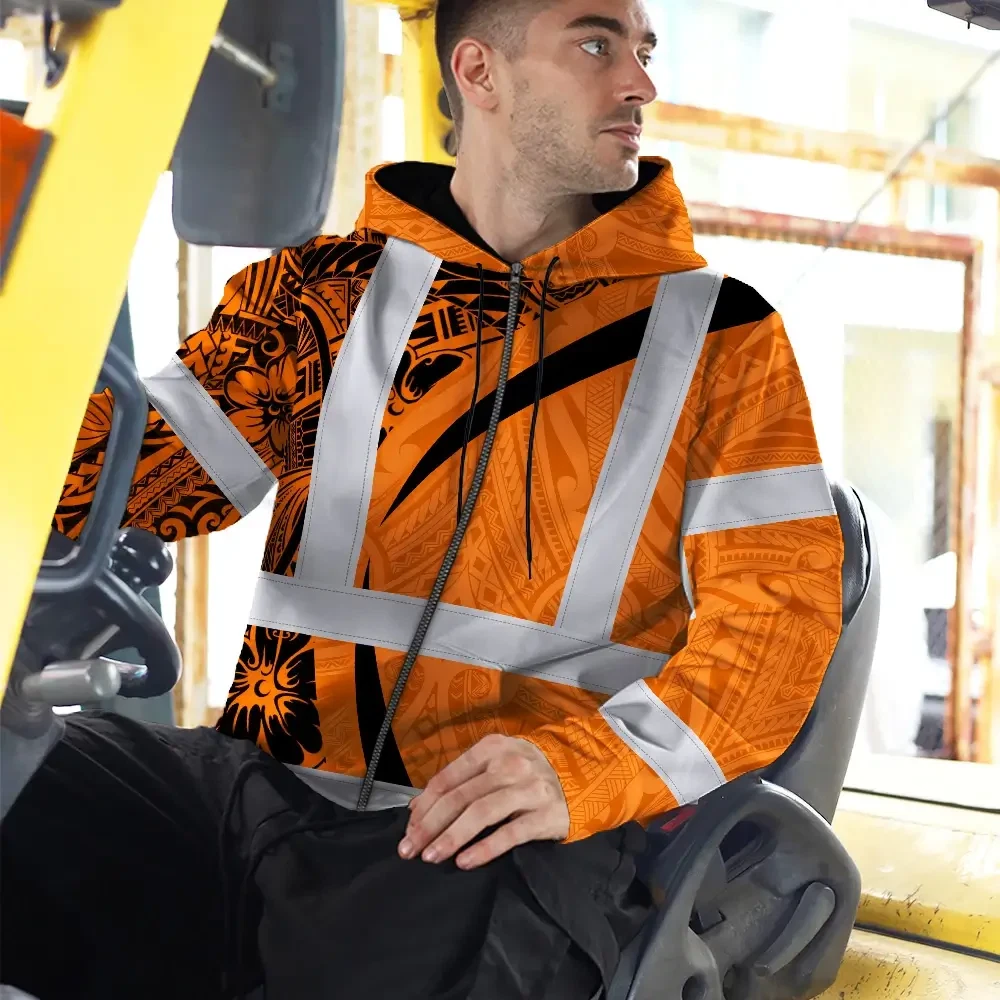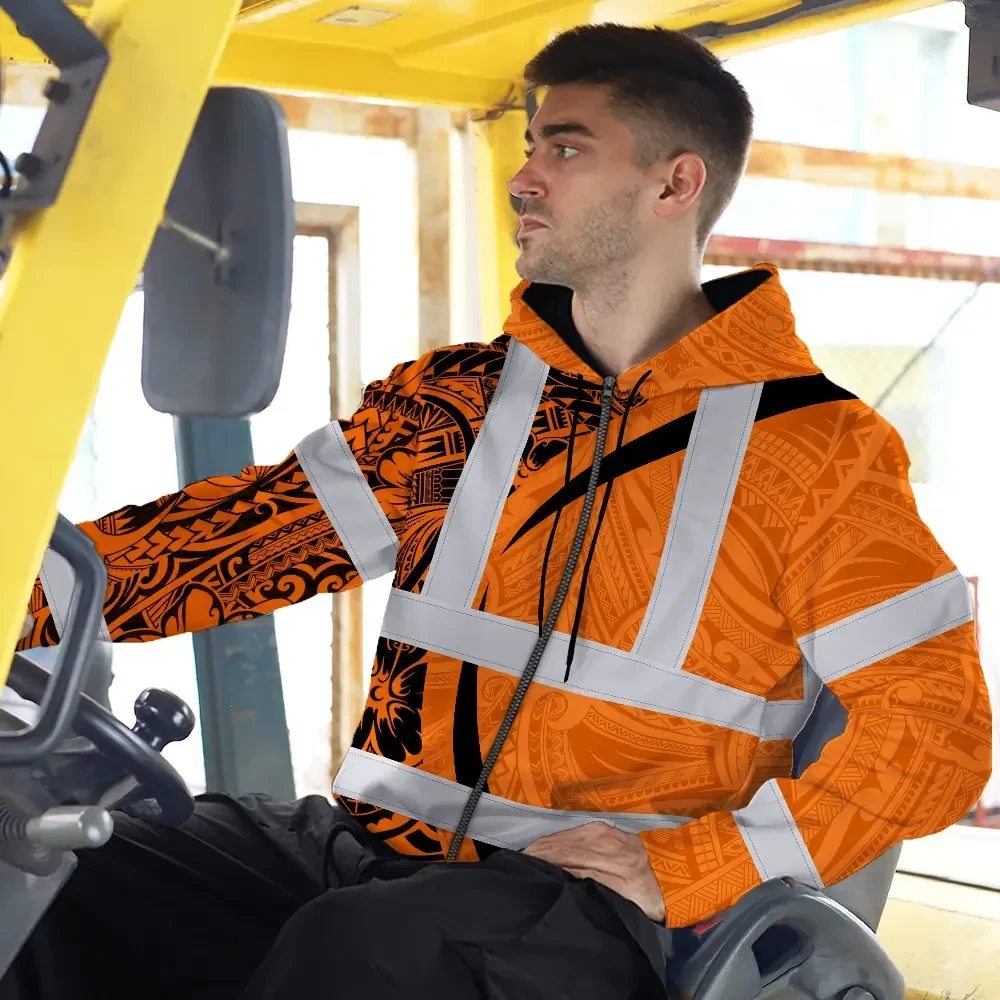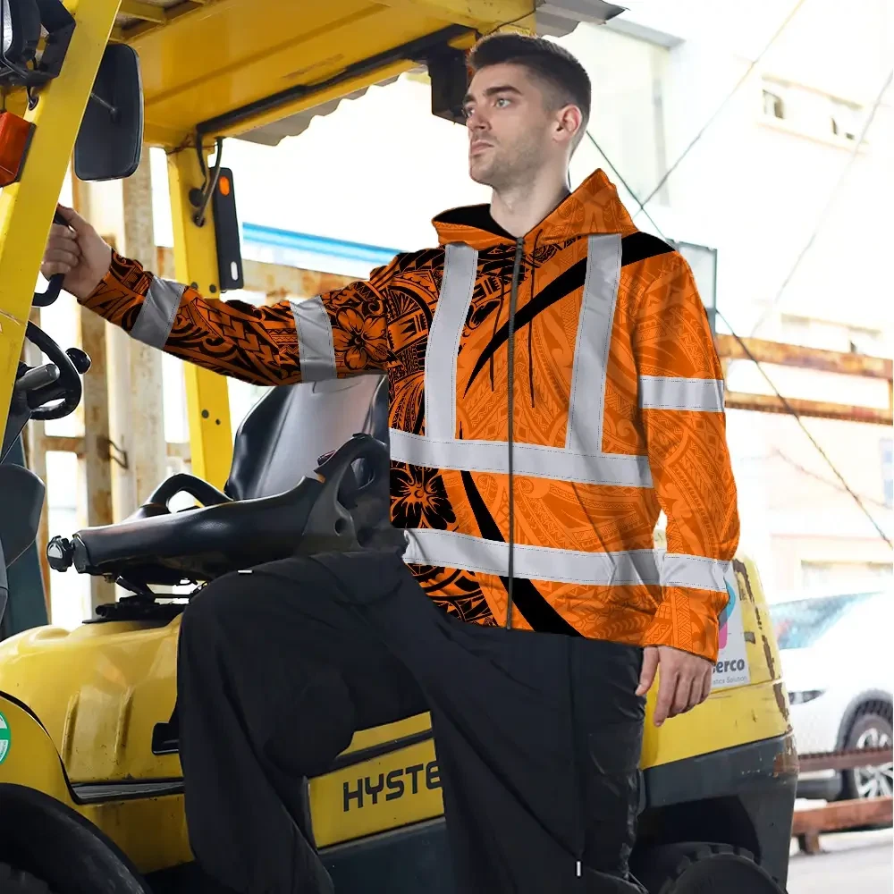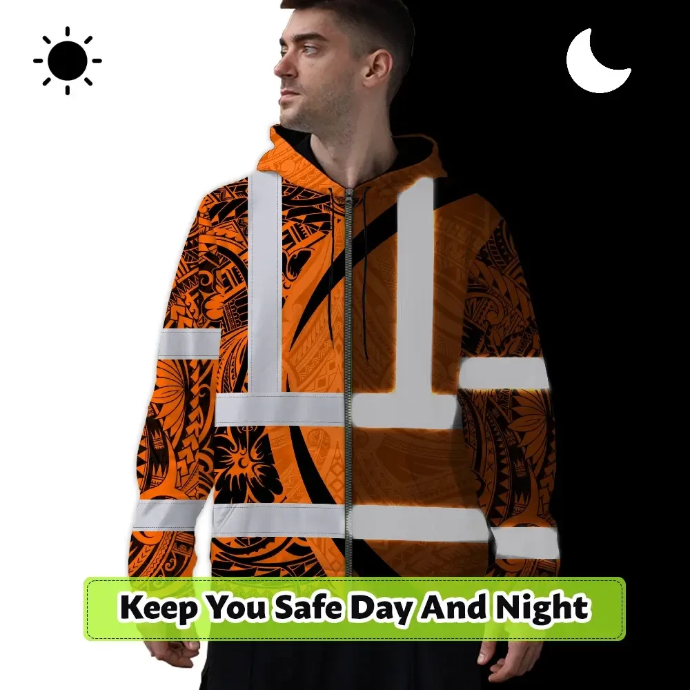 Hi Vis Zip Hoodie Reflective Tapes Orange Hawaiian Polynesian Tribal Custom Name Safety Workwear For Workers, Truckers, Operators