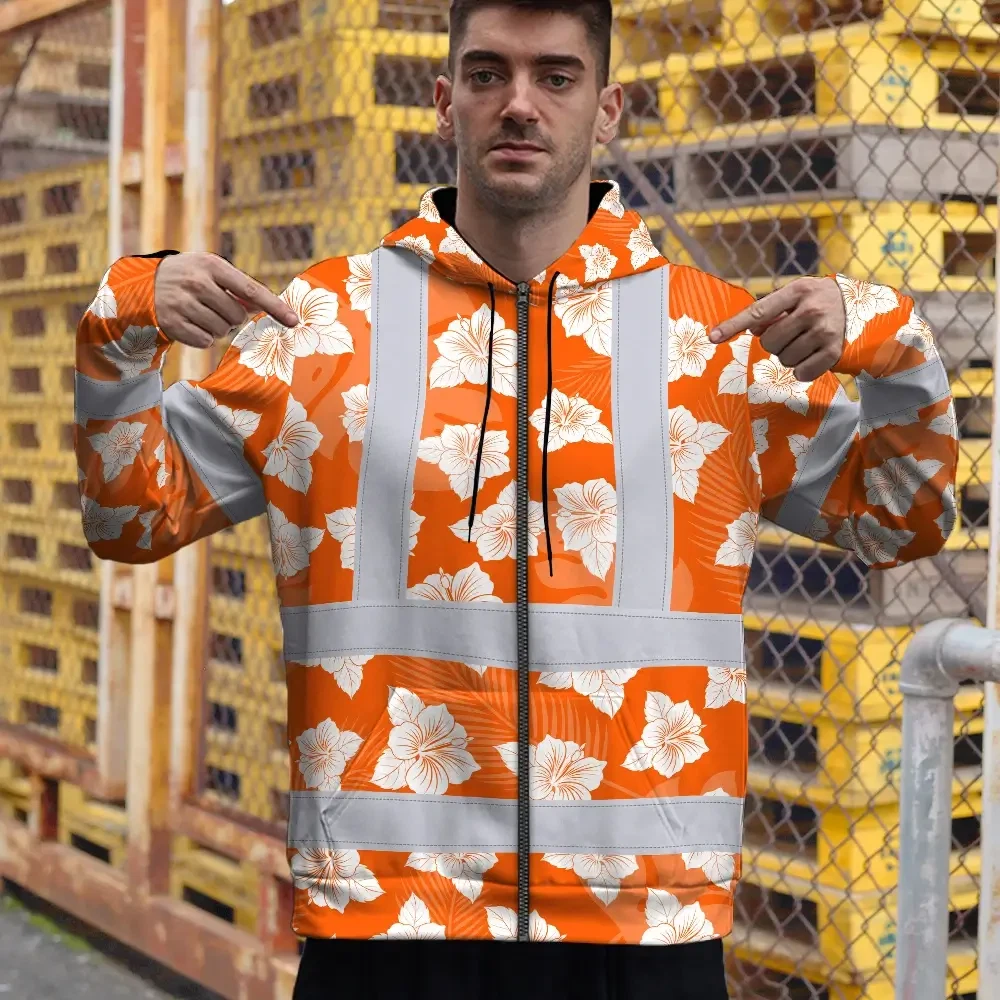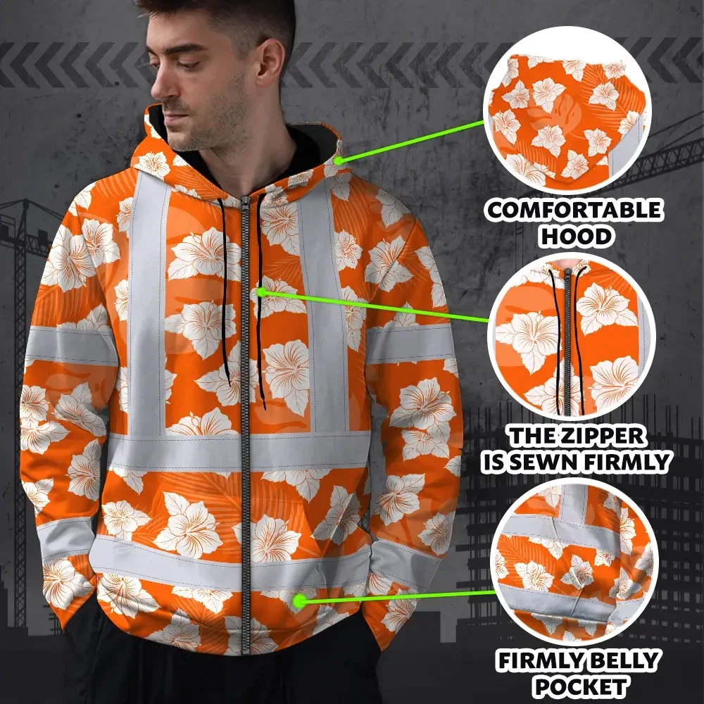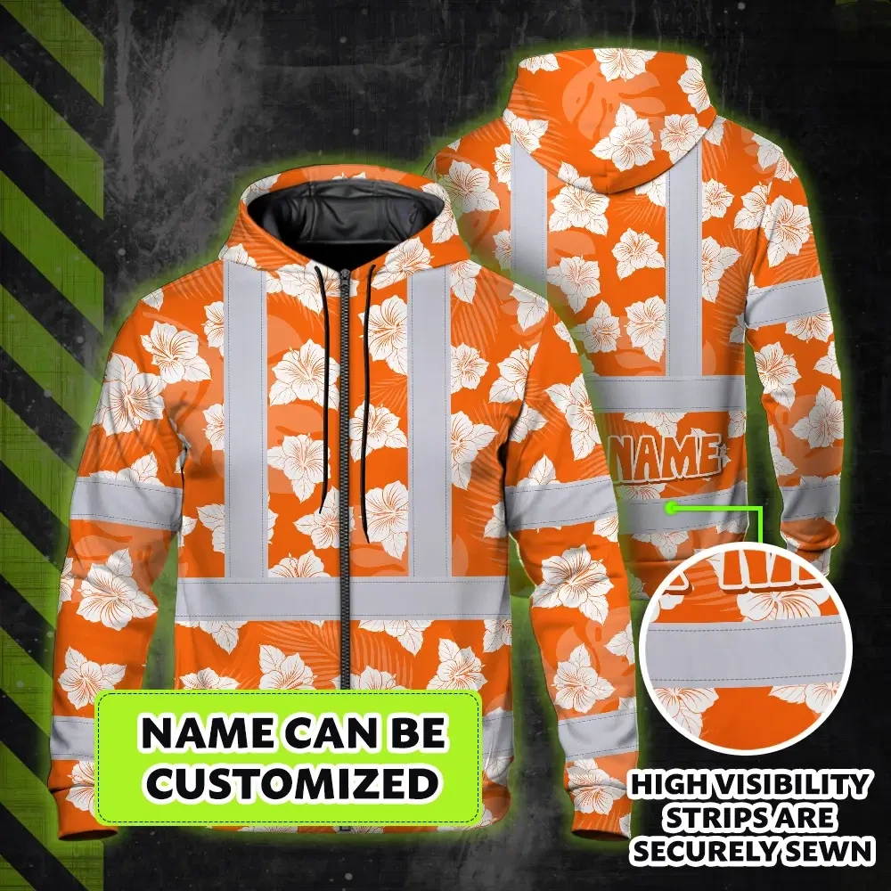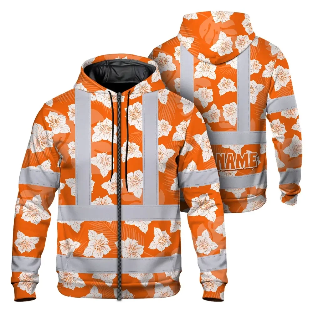 Hi Vis Zip Hoodie Reflective Tapes Orange Neon Flowers 2 Custom Name Safety Workwear For Workers, Truckers, Operators