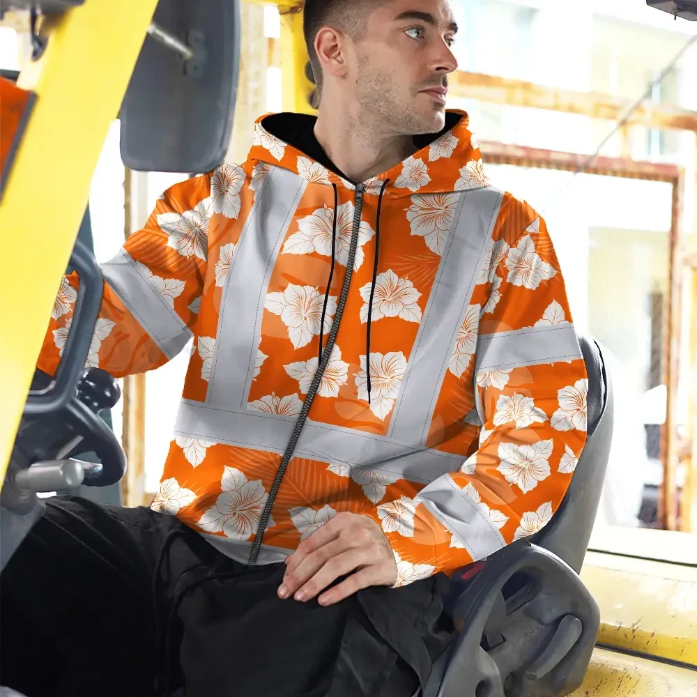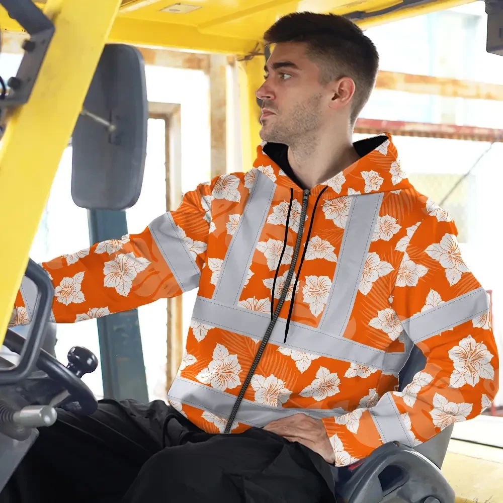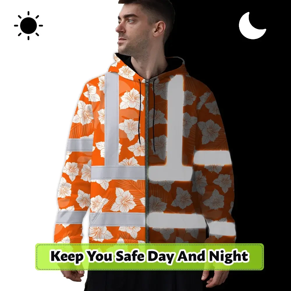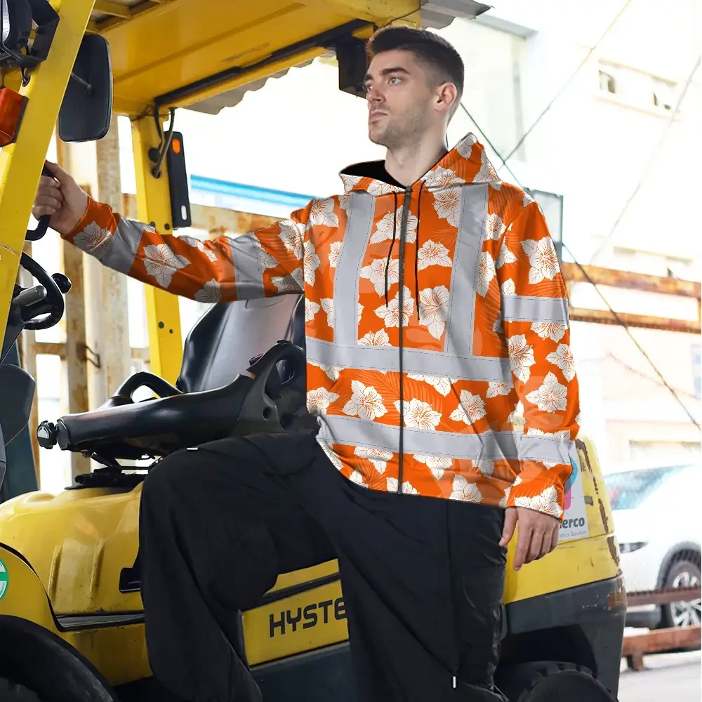 Hi Vis Zip Hoodie Reflective Tapes Orange Neon Flowers 2 Custom Name Safety Workwear For Workers, Truckers, Operators