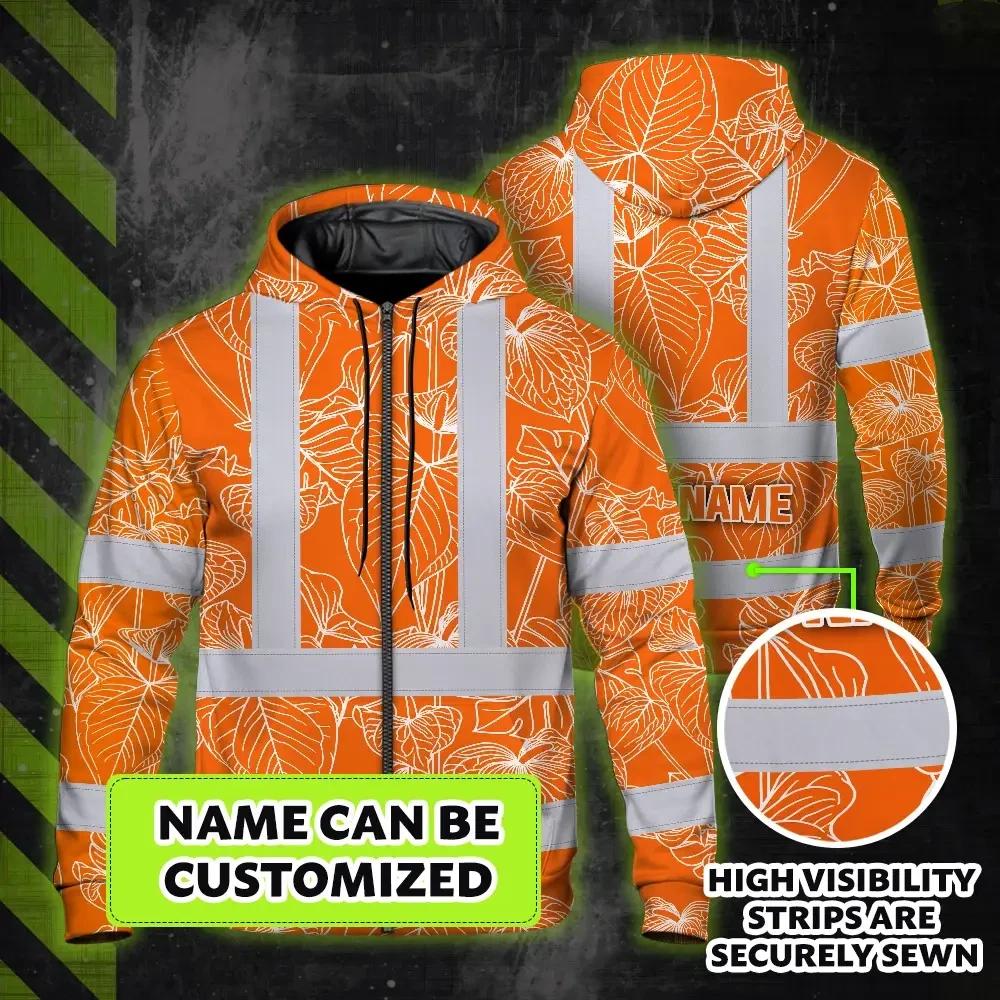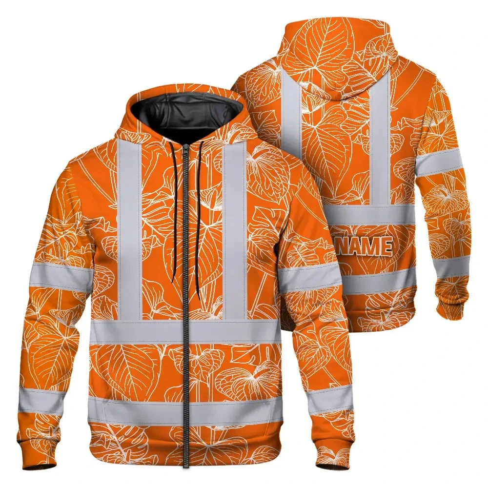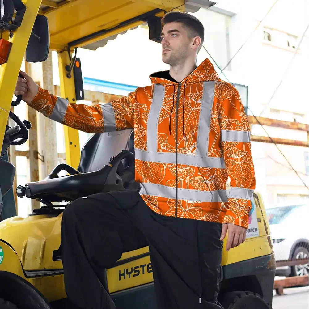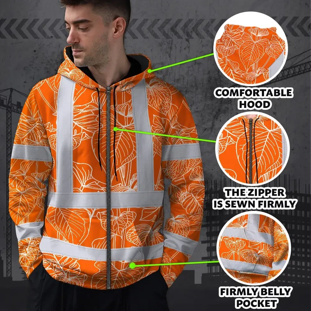 Hi Vis Zip Hoodie Reflective Tapes Orange Neon Flowers Custom Name Safety Workwear For Workers, Truckers, Operators