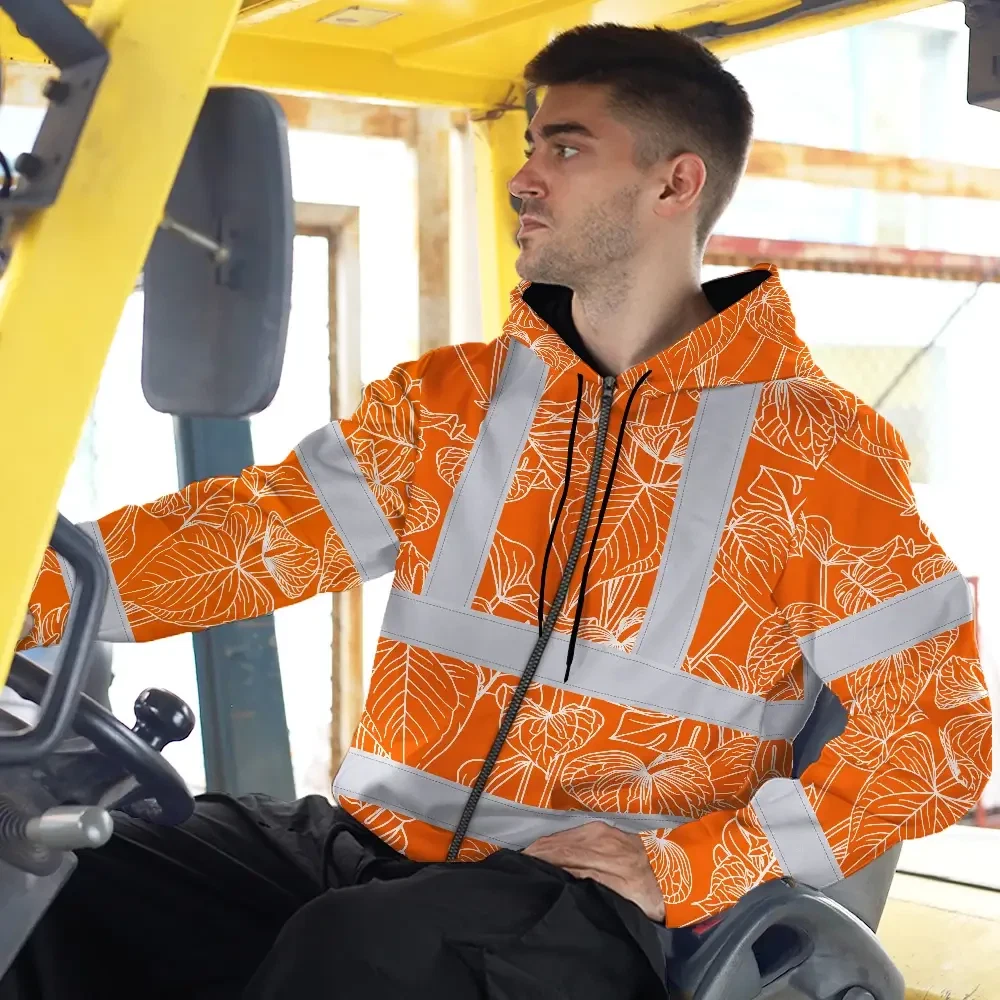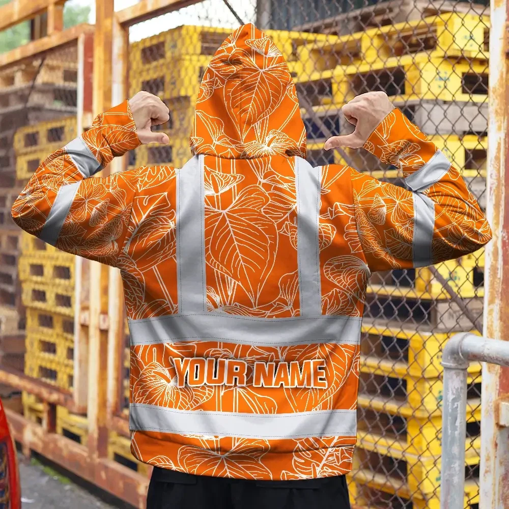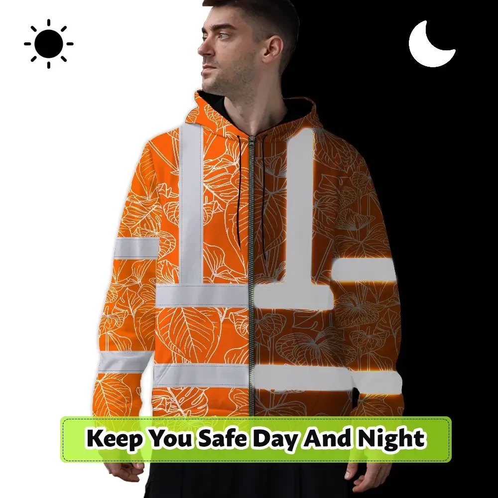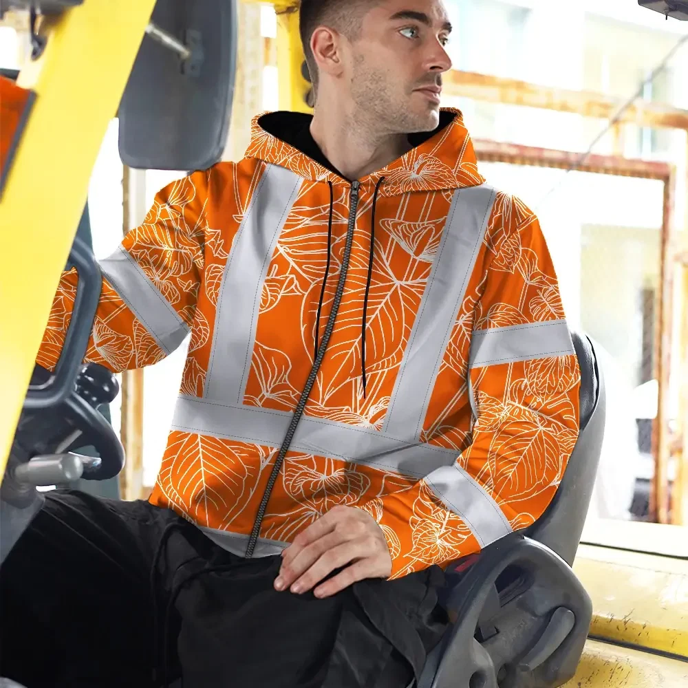 Hi Vis Zip Hoodie Reflective Tapes Orange Neon Flowers Custom Name Safety Workwear For Workers, Truckers, Operators