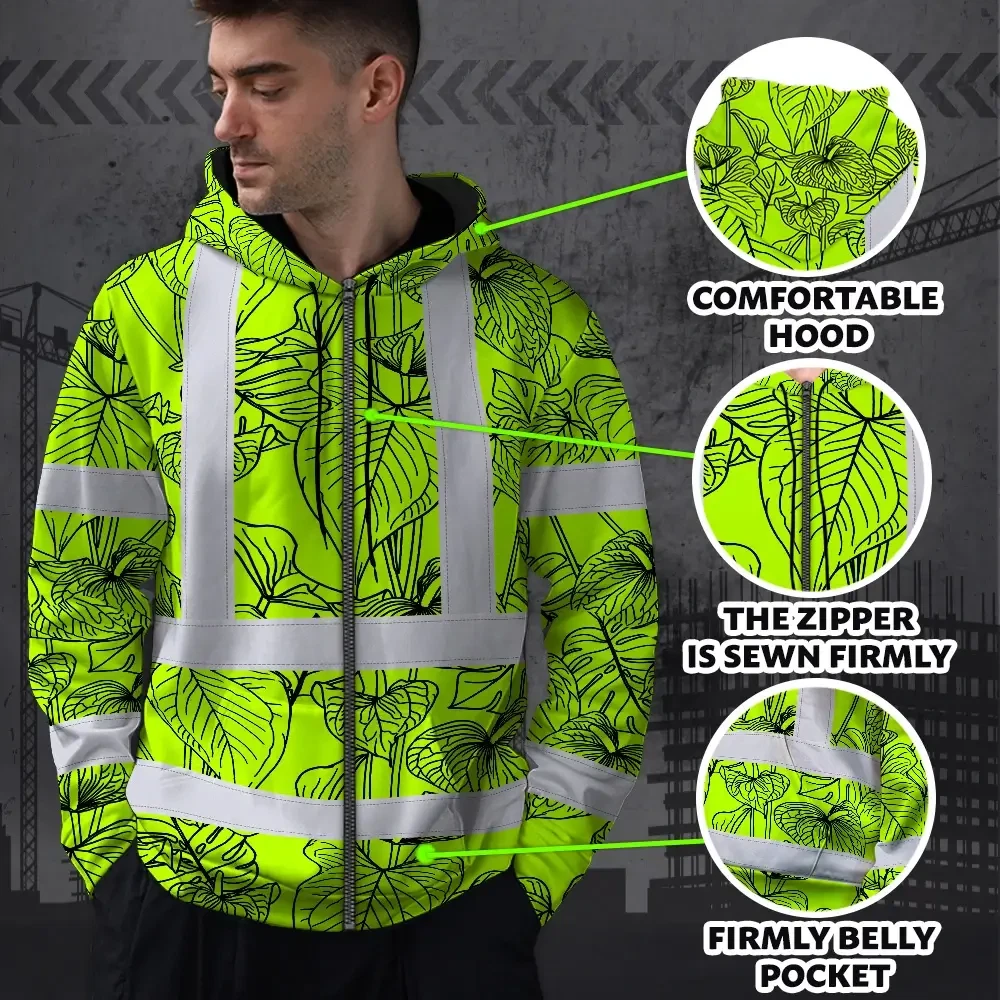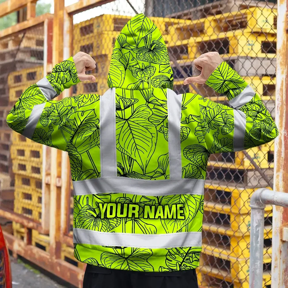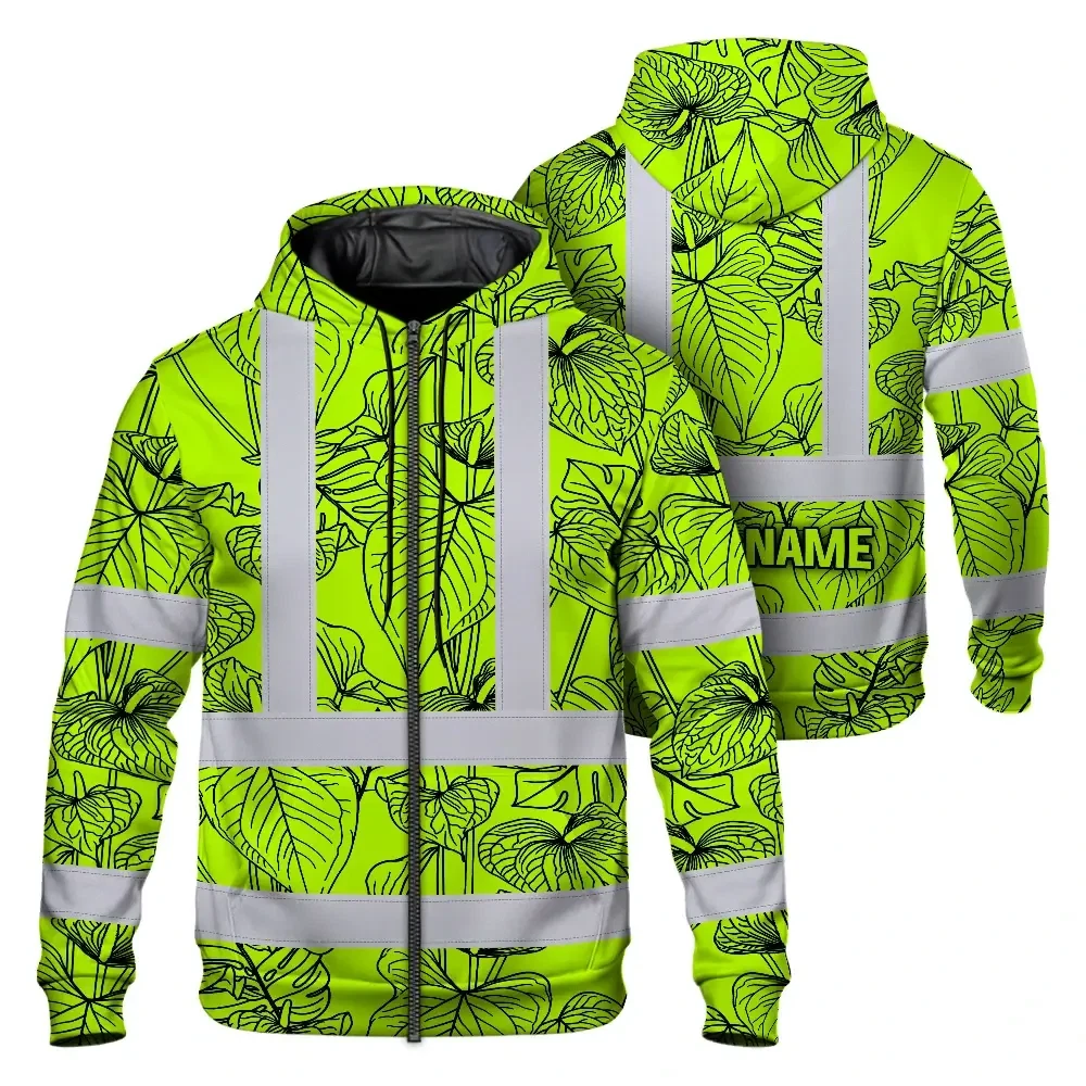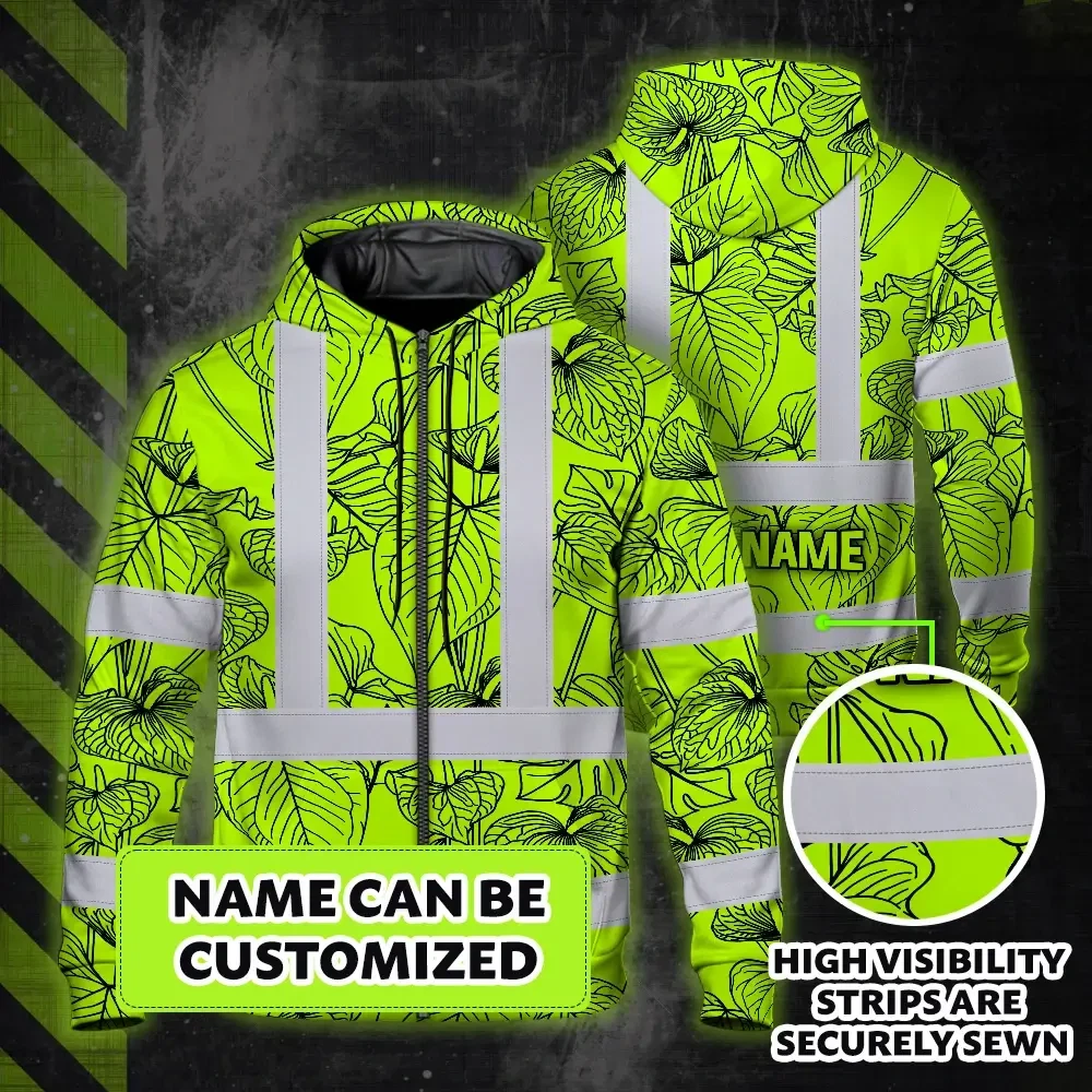 Hi Vis Zip Hoodie Reflective Tapes Orange Neon Flowers Custom Name Safety Workwear For Workers, Truckers, Operators