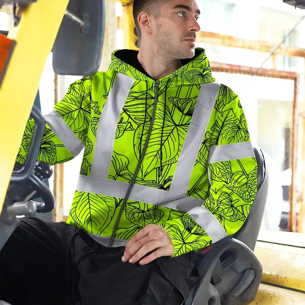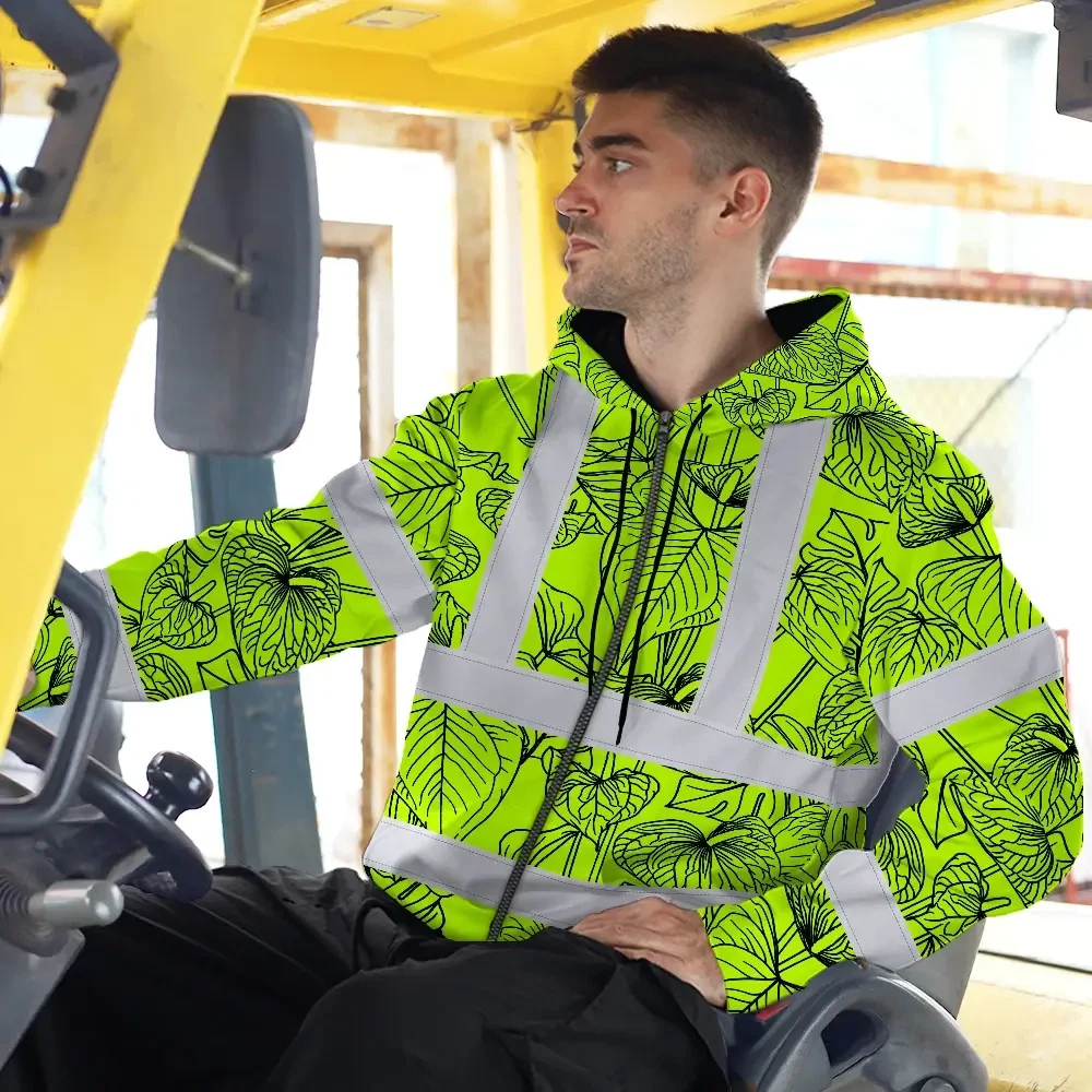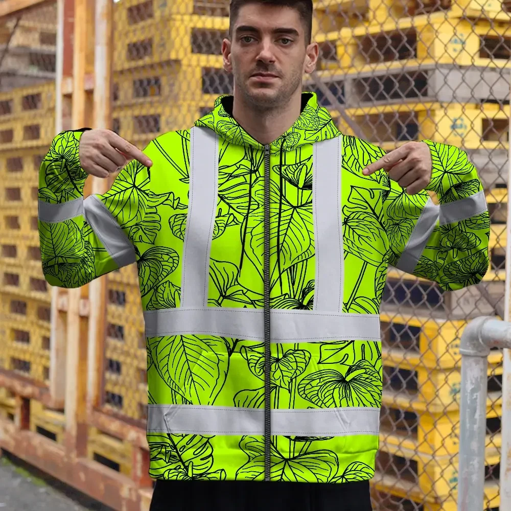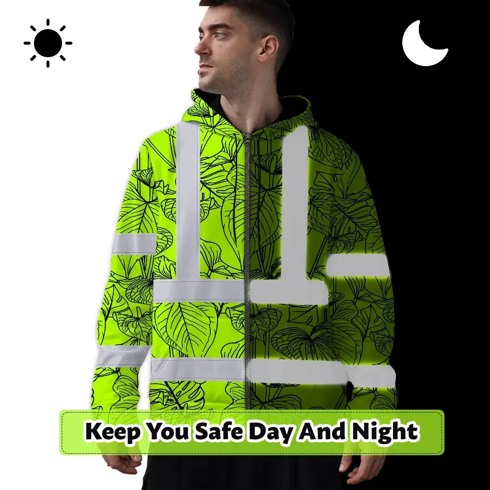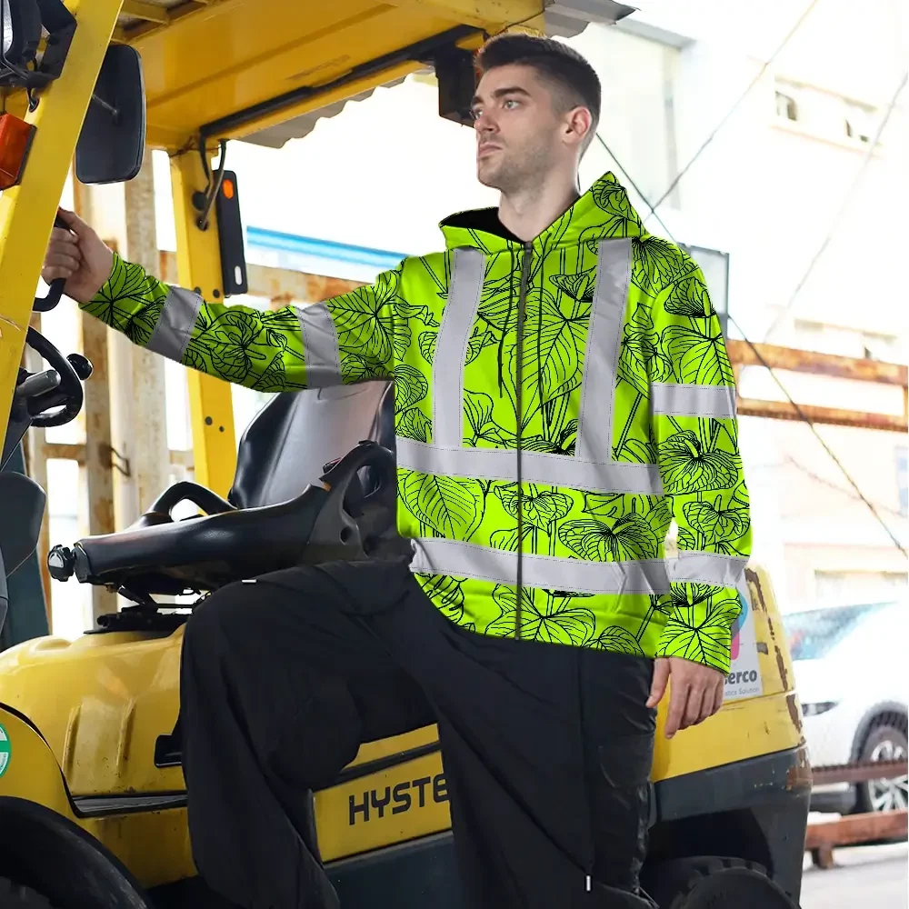 Hi Vis Zip Hoodie Reflective Tapes Orange Neon Flowers Custom Name Safety Workwear For Workers, Truckers, Operators