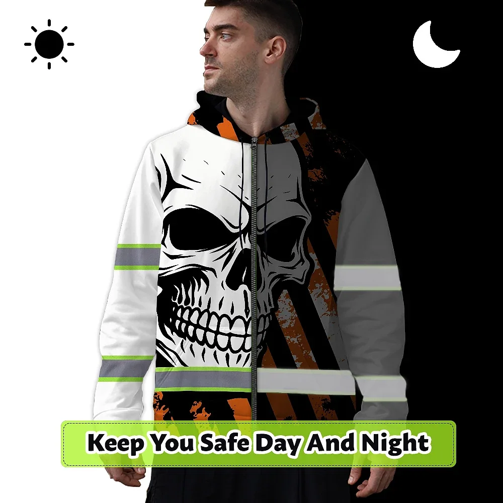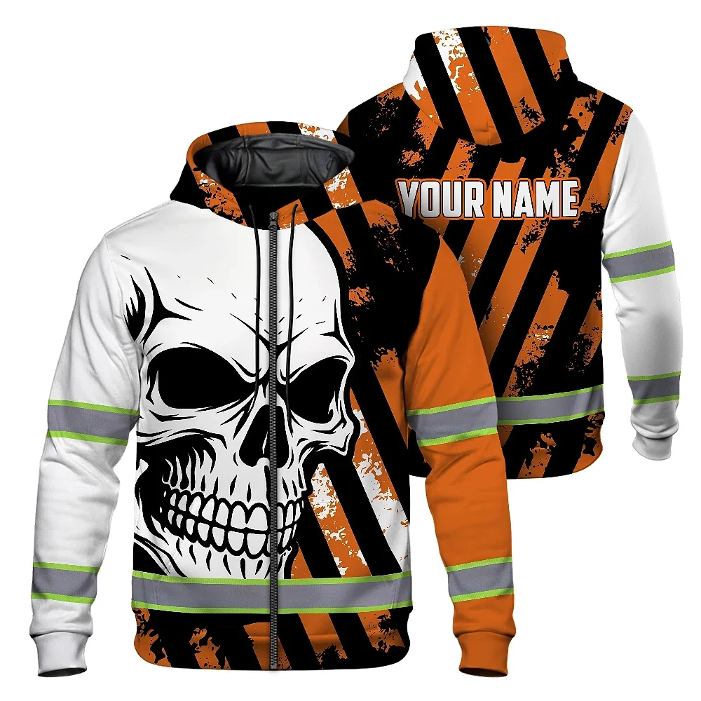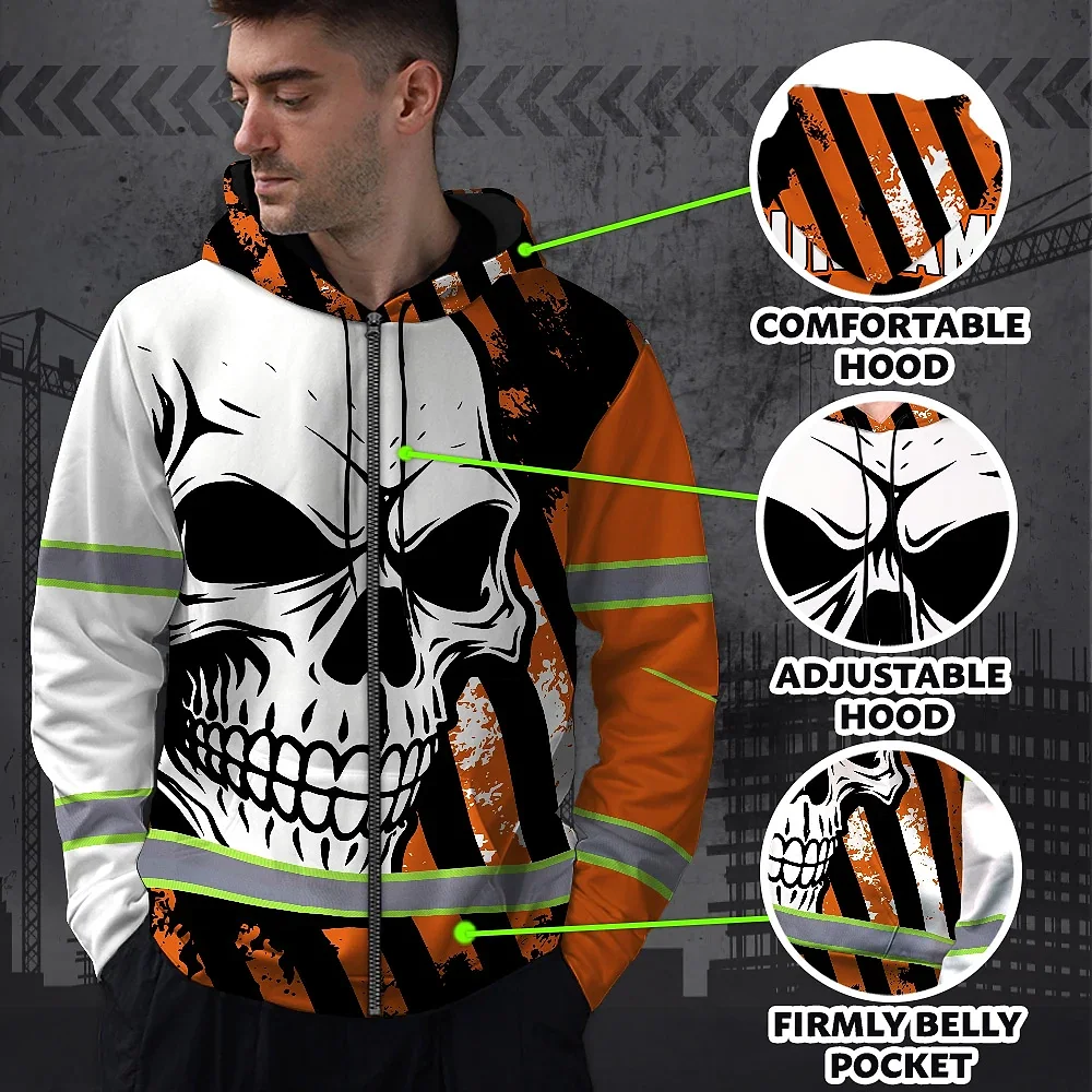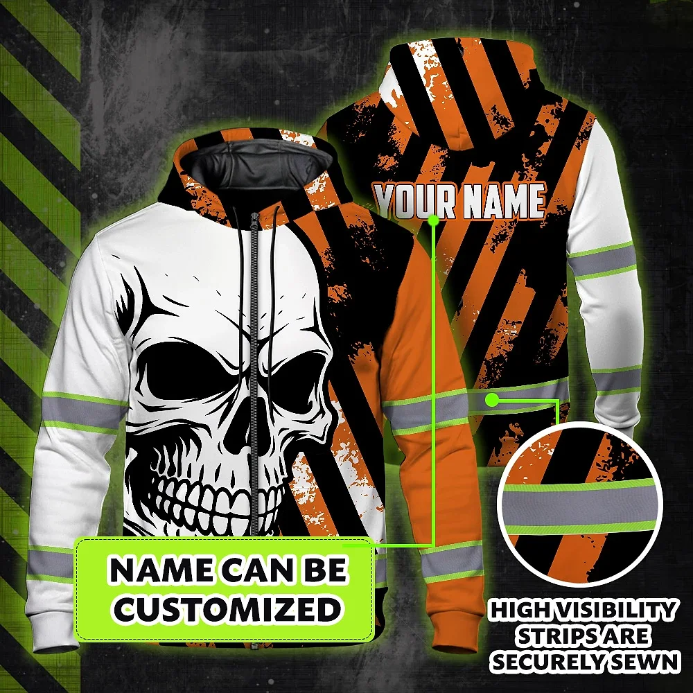 Hi Vis Zip Hoodie Reflective Tapes Orange Neon Skull Custom Name Safety Workwear For Bikers, Workers, Truckers, Operators