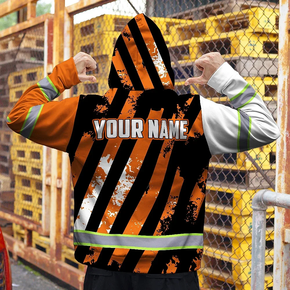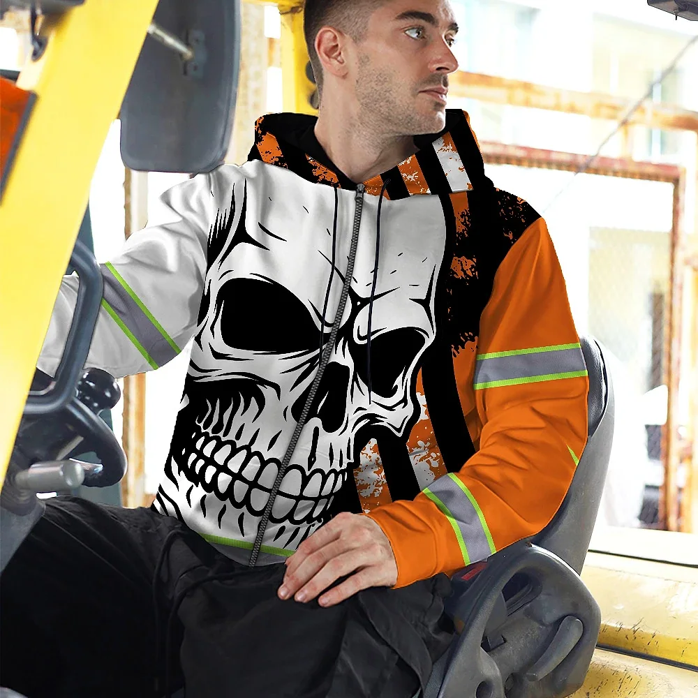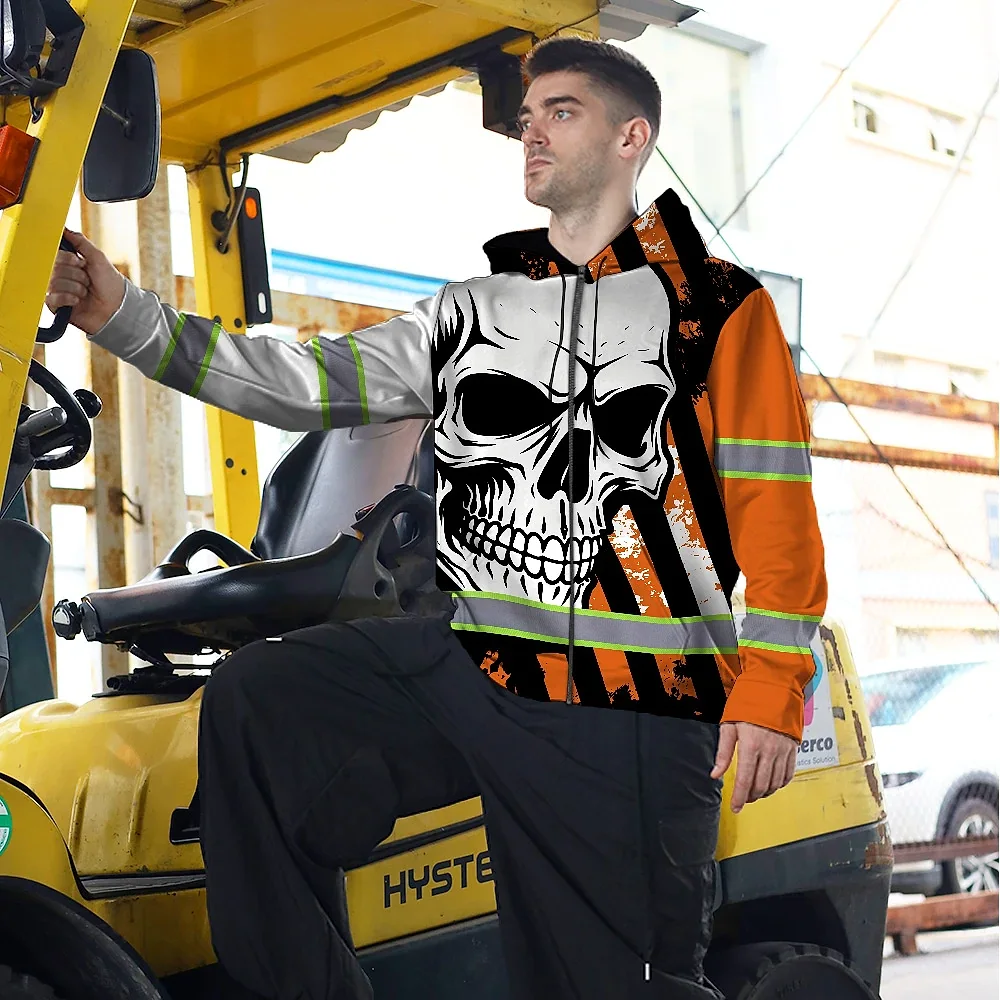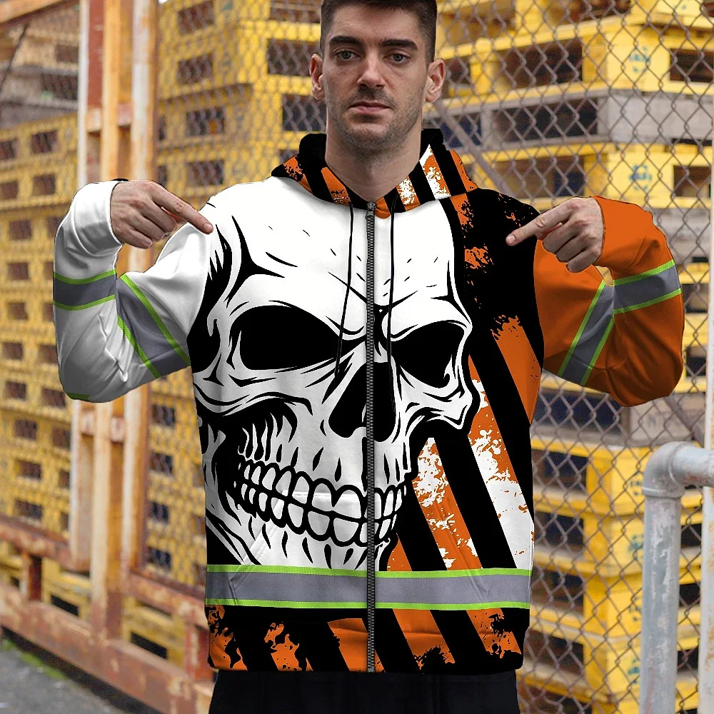 Hi Vis Zip Hoodie Reflective Tapes Orange Neon Skull Custom Name Safety Workwear For Bikers, Workers, Truckers, Operators