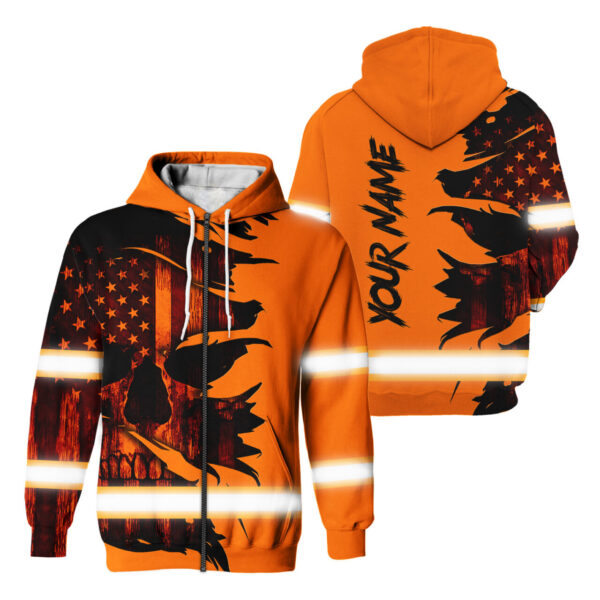 Hi Vis Zip Hoodie Reflective Orange Neon Skull Fire Custom Name Safety Workwear For Workers, Runners, Cyclists, Patriotic