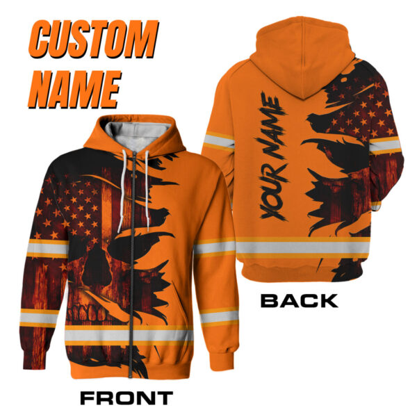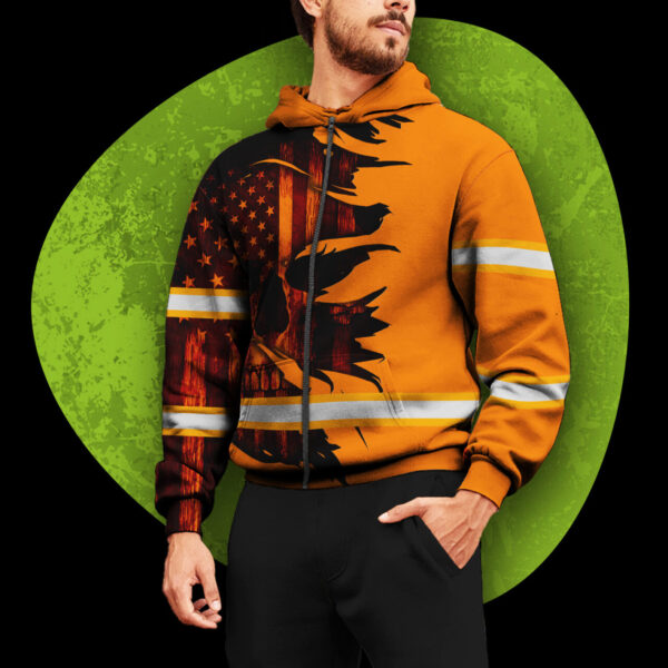 Hi Vis Zip Hoodie Reflective Tapes Orange Neon Skull US Flag Scratch Custom Name Safety Workwear For Workers, Runners, Cyclists, Patriotic