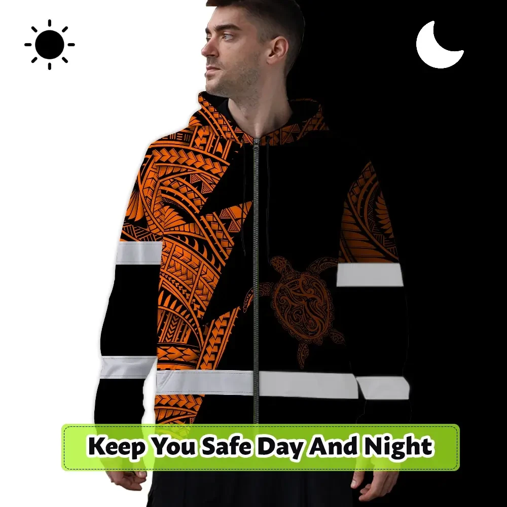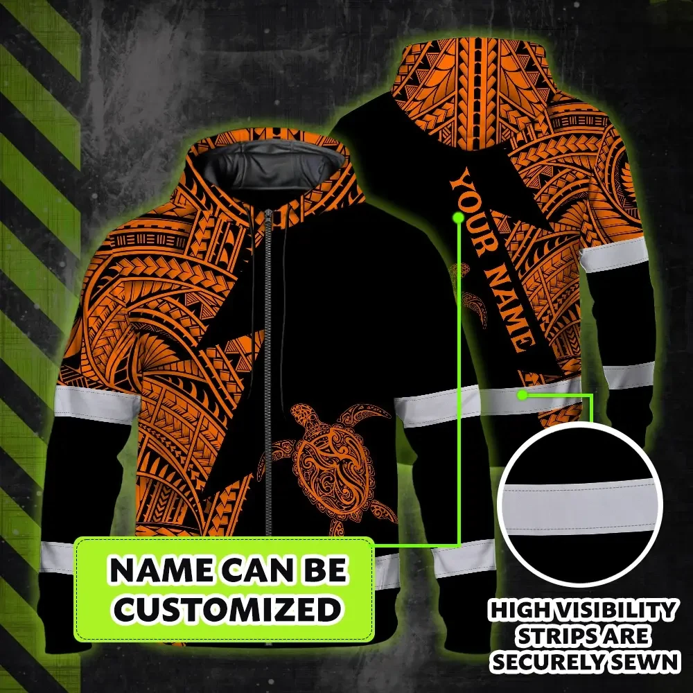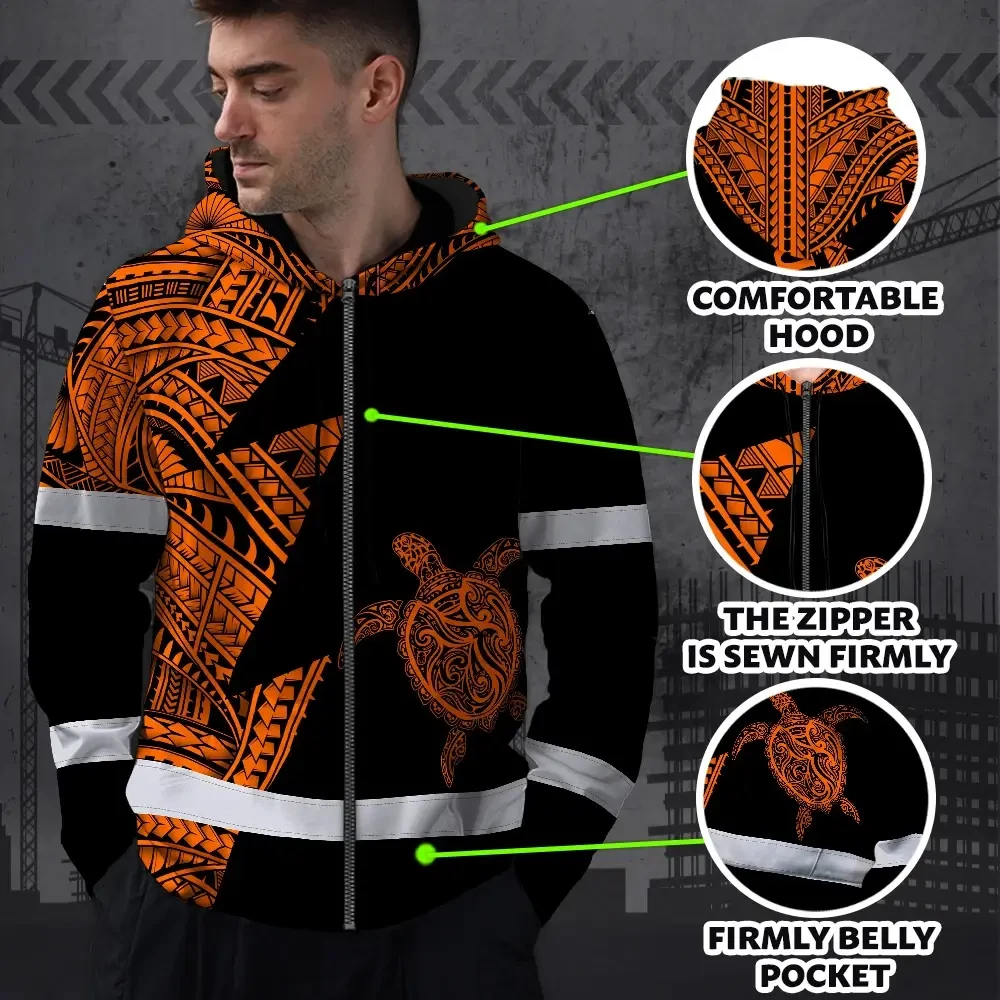 Hi Vis Zip Hoodie Reflective Tapes Orange Neon Turtle Hawaii Custom Name Safety Workwear For Workers, Truckers, Operators