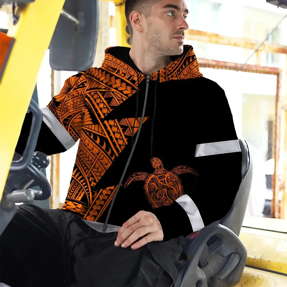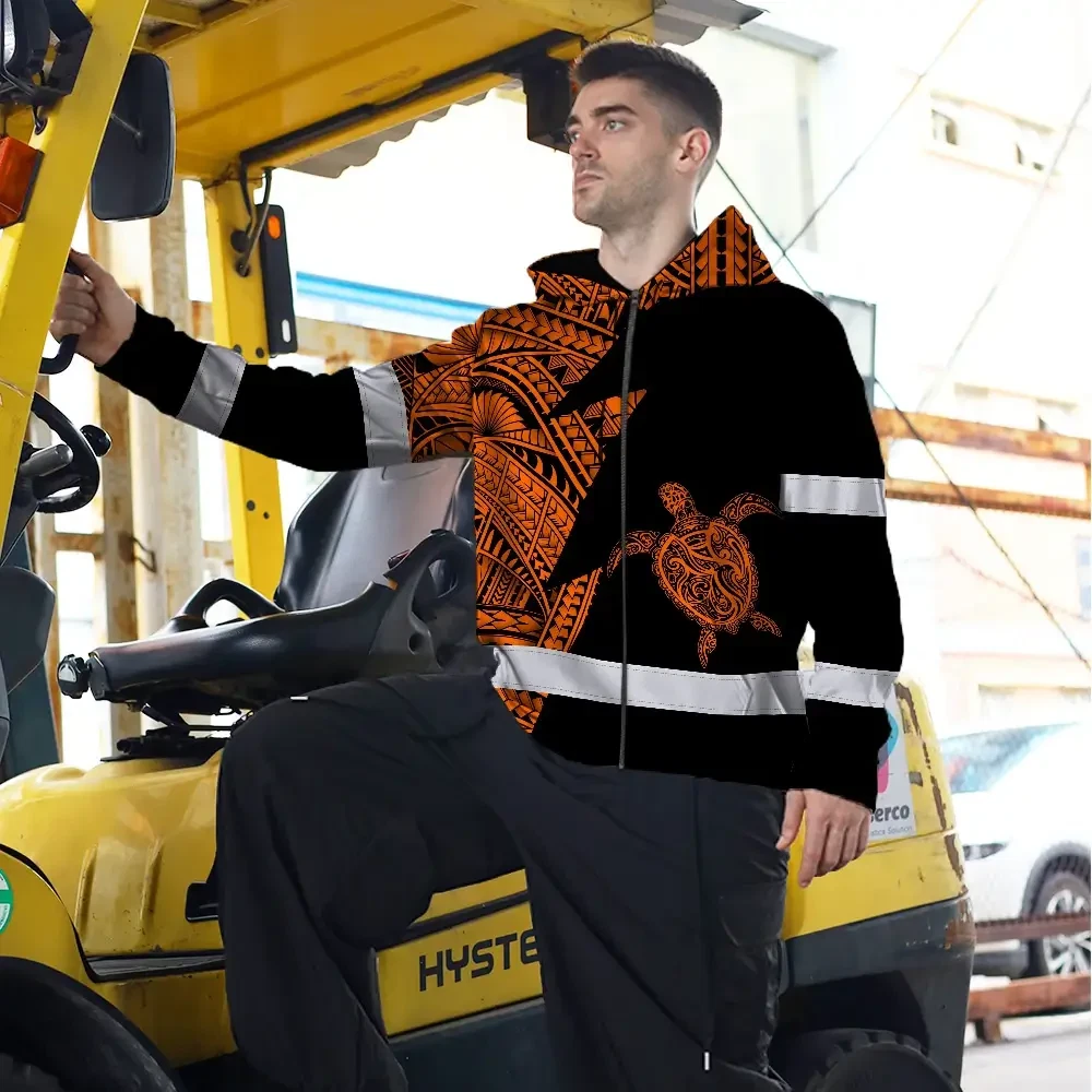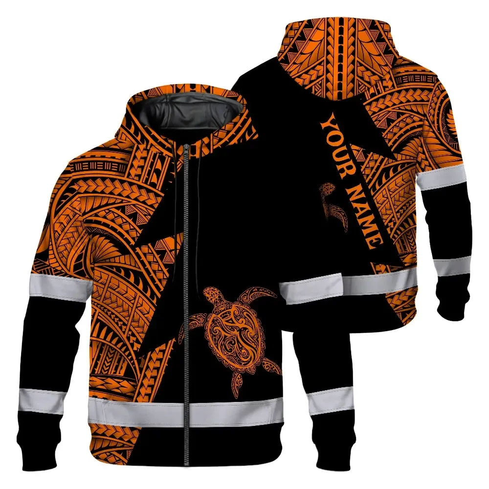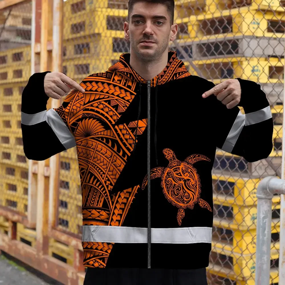 Hi Vis Zip Hoodie Reflective Tapes Orange Neon Turtle Hawaii Custom Name Safety Workwear For Workers, Truckers, Operators