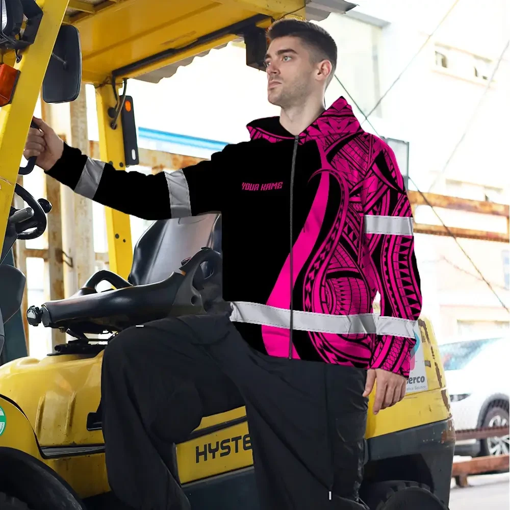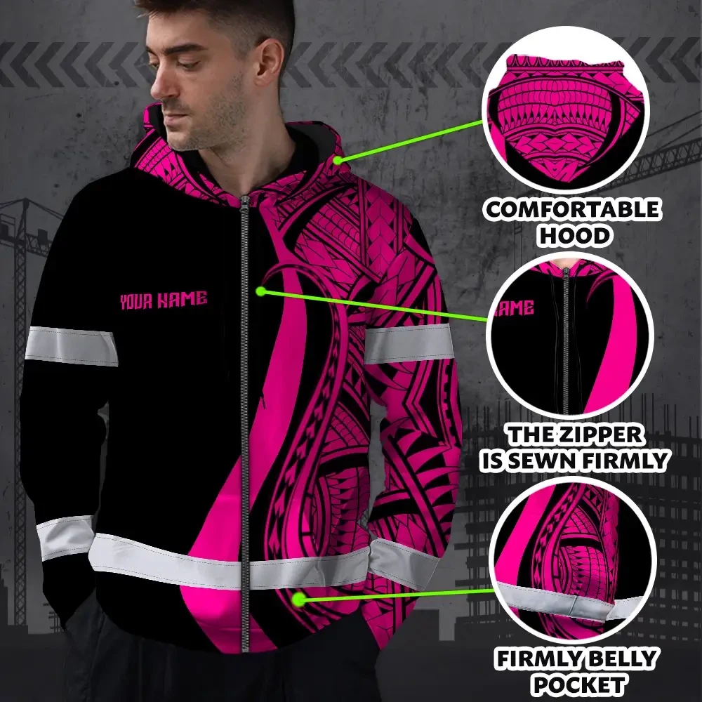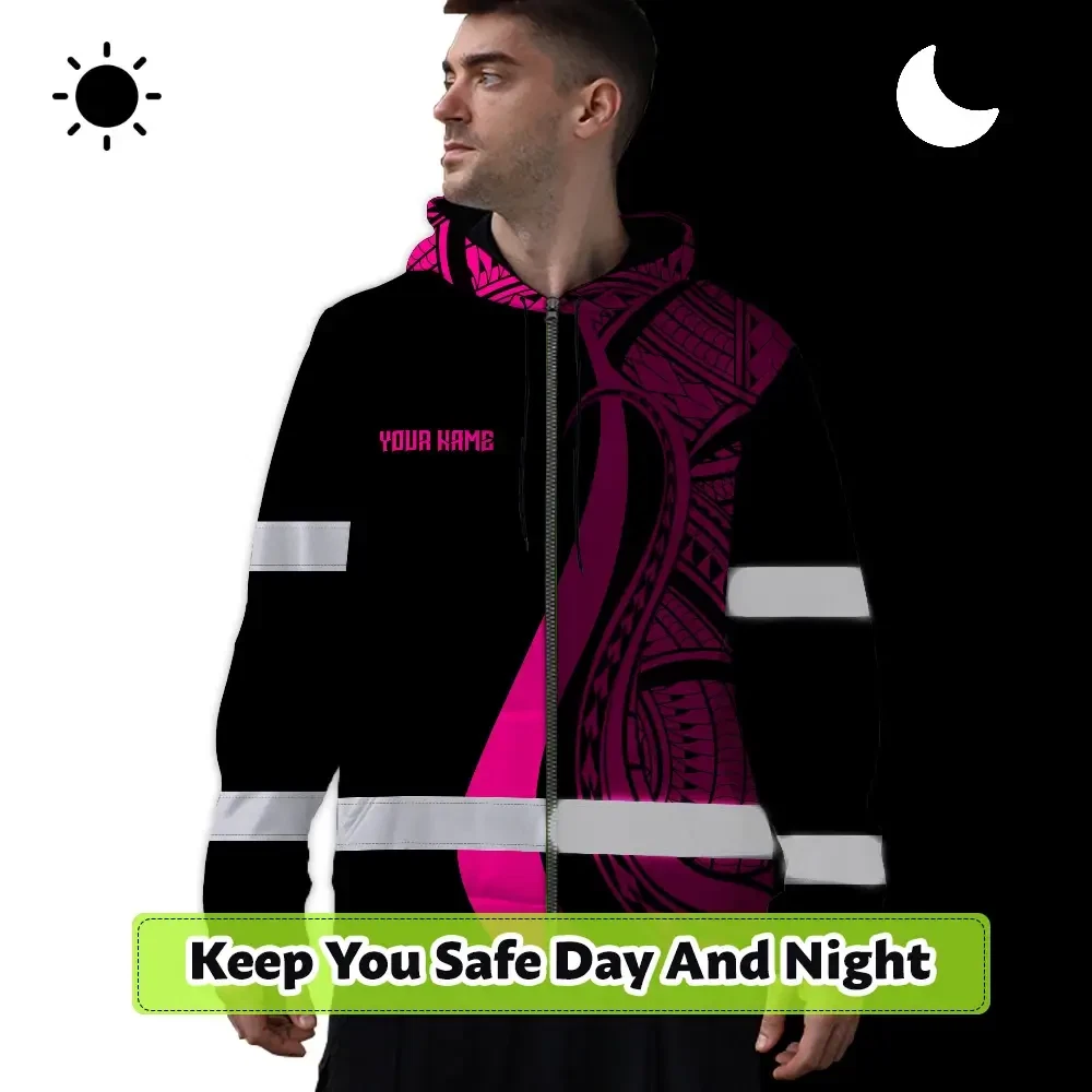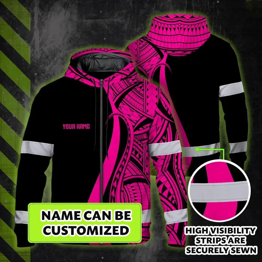 Hi Vis Zip Hoodie Reflective Tapes Pink Neon Hawaii Custom Name Safety Workwear For Workers, Truckers, Operators