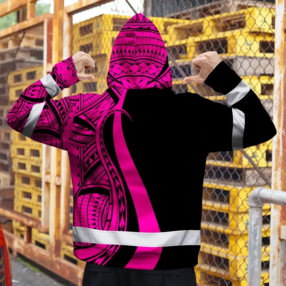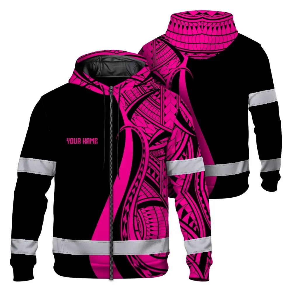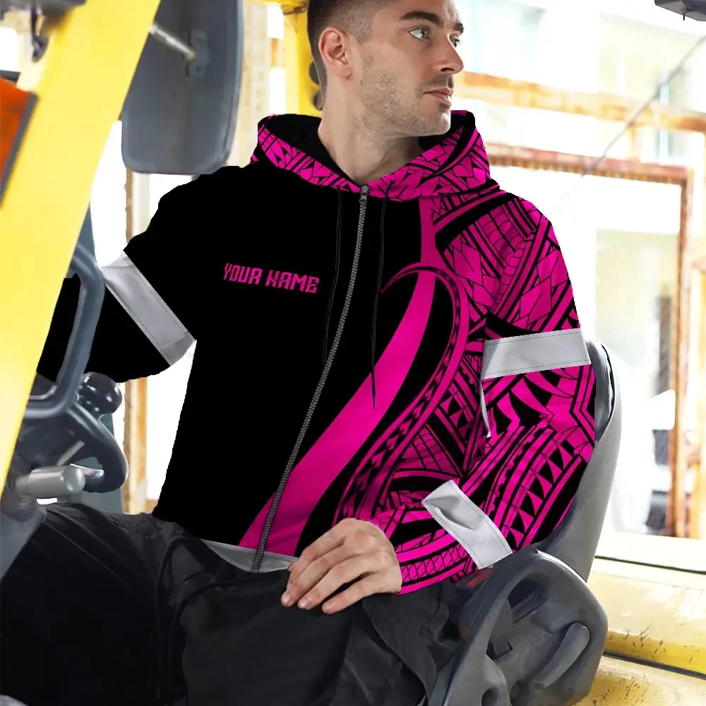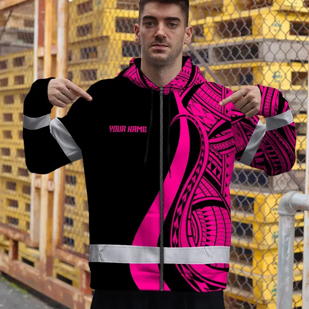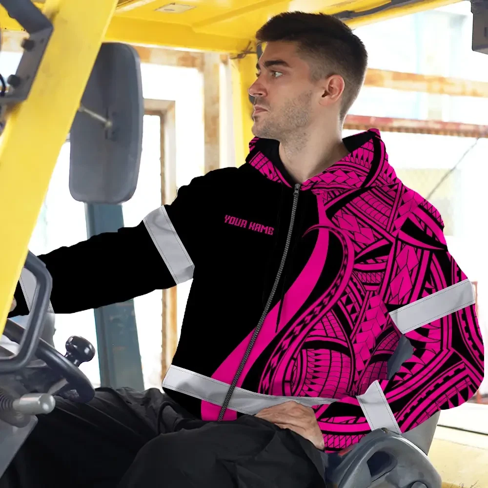 Hi Vis Zip Hoodie Reflective Tapes Pink Neon Hawaii Custom Name Safety Workwear For Workers, Truckers, Operators