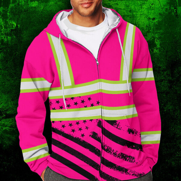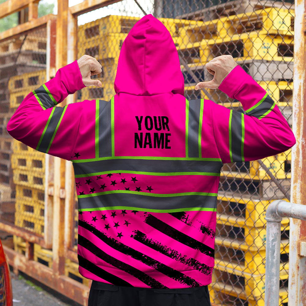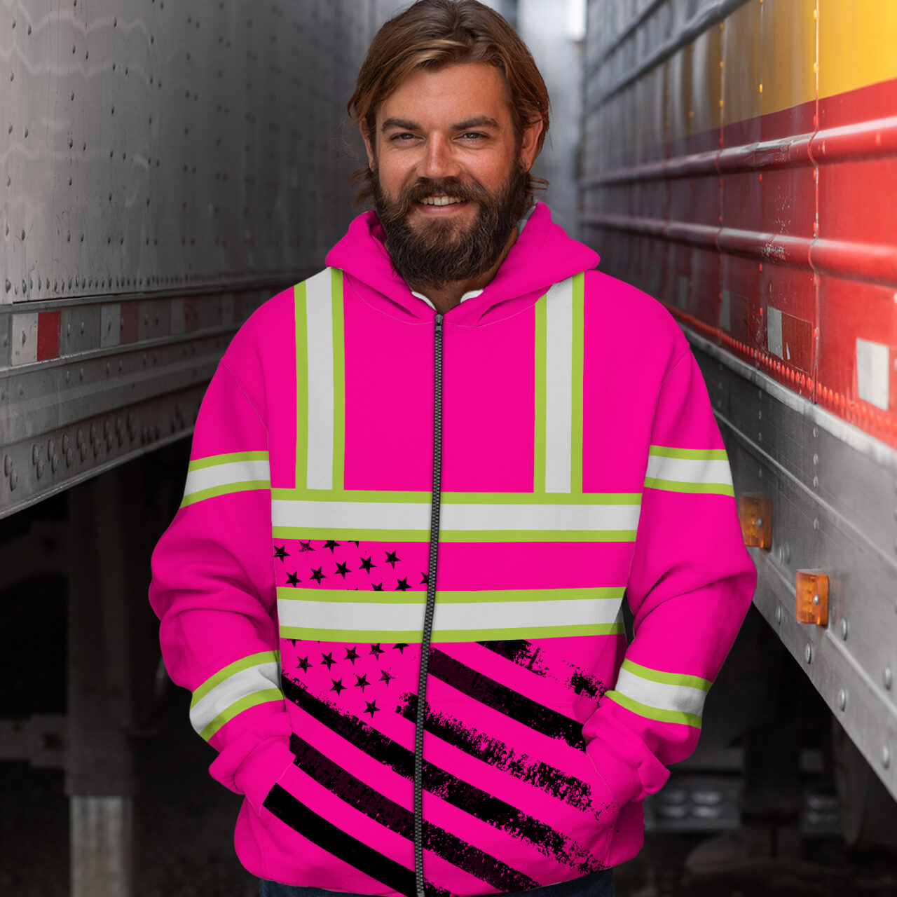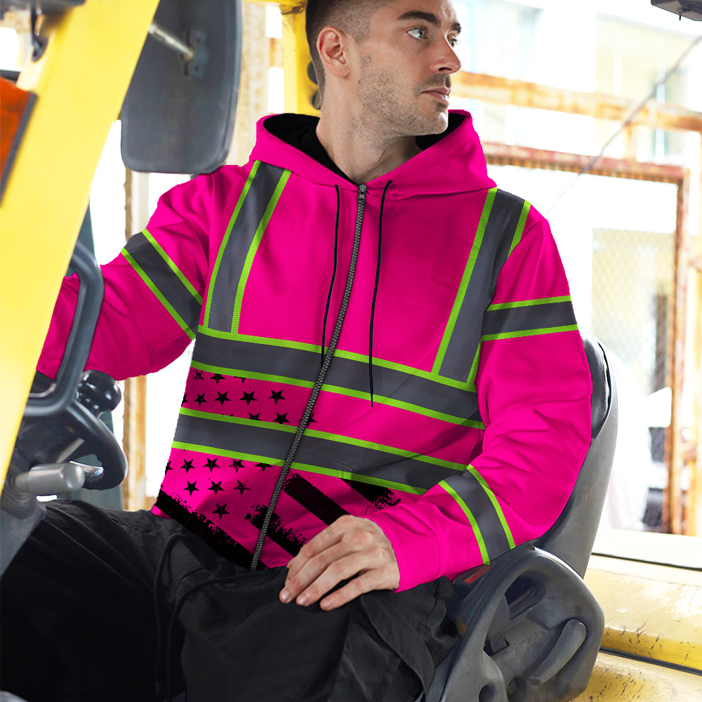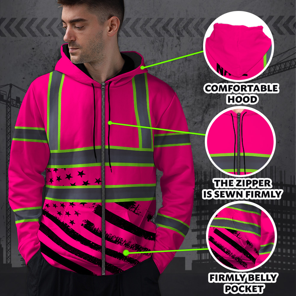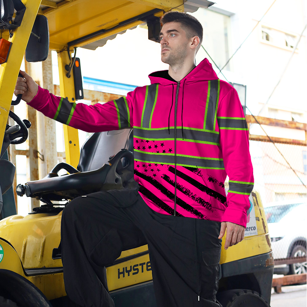 Hi Vis Zip Hoodie Reflective Tapes Pink USA Flag Safety Workwear For Workers