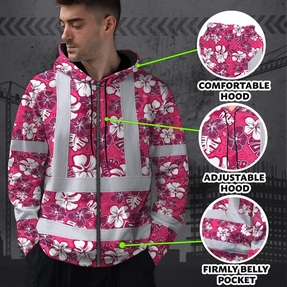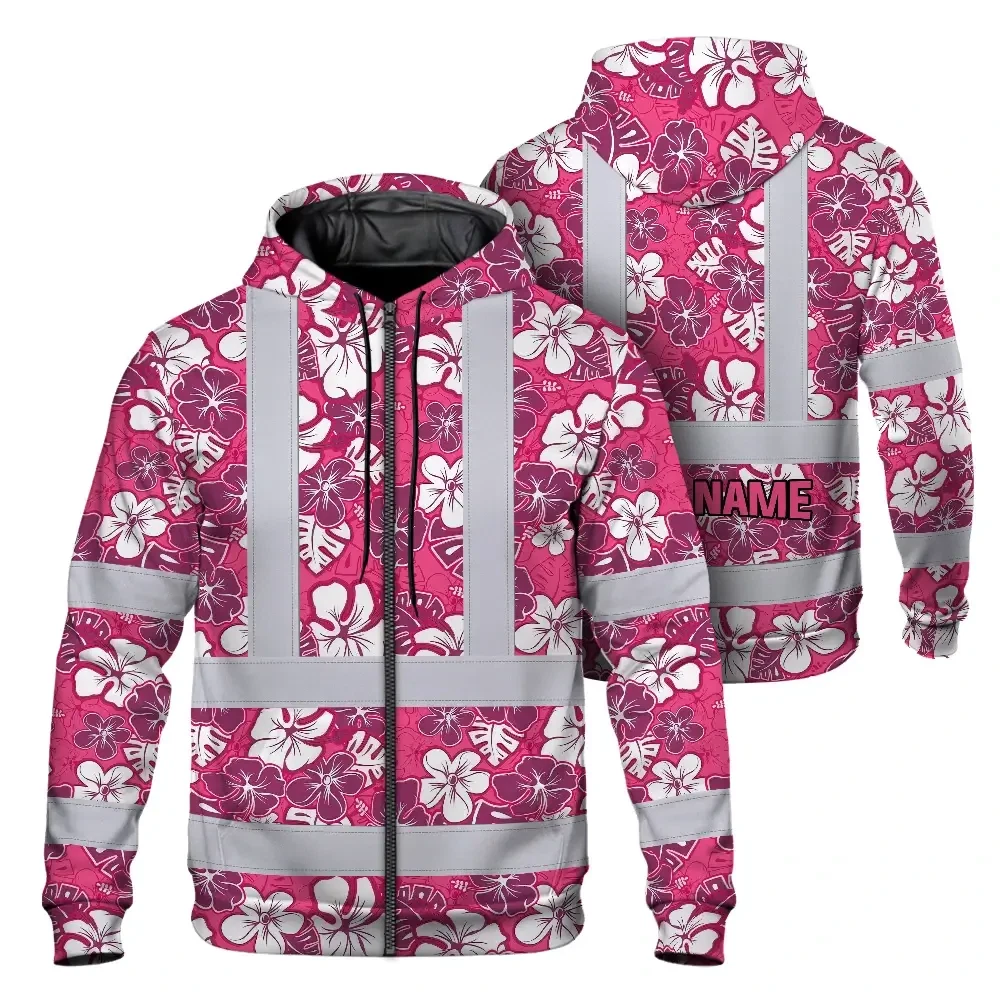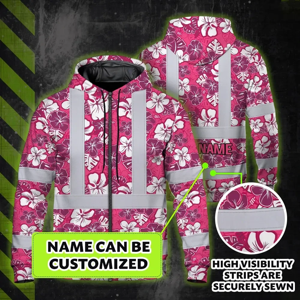 Hi Vis Zip Hoodie Reflective Tapes Pink Violet Flowers Custom Name Safety Workwear For Workers, Truckers, Operators