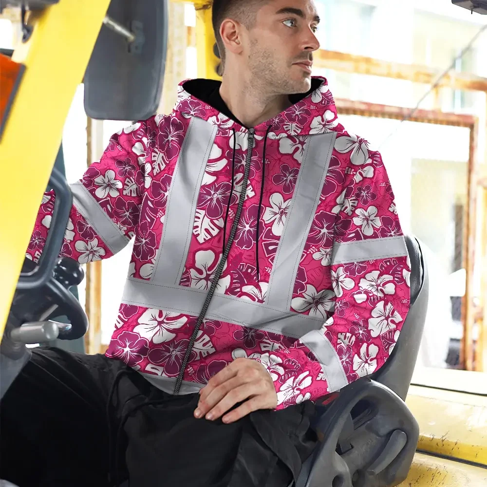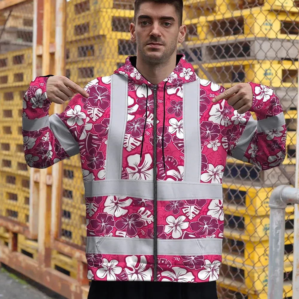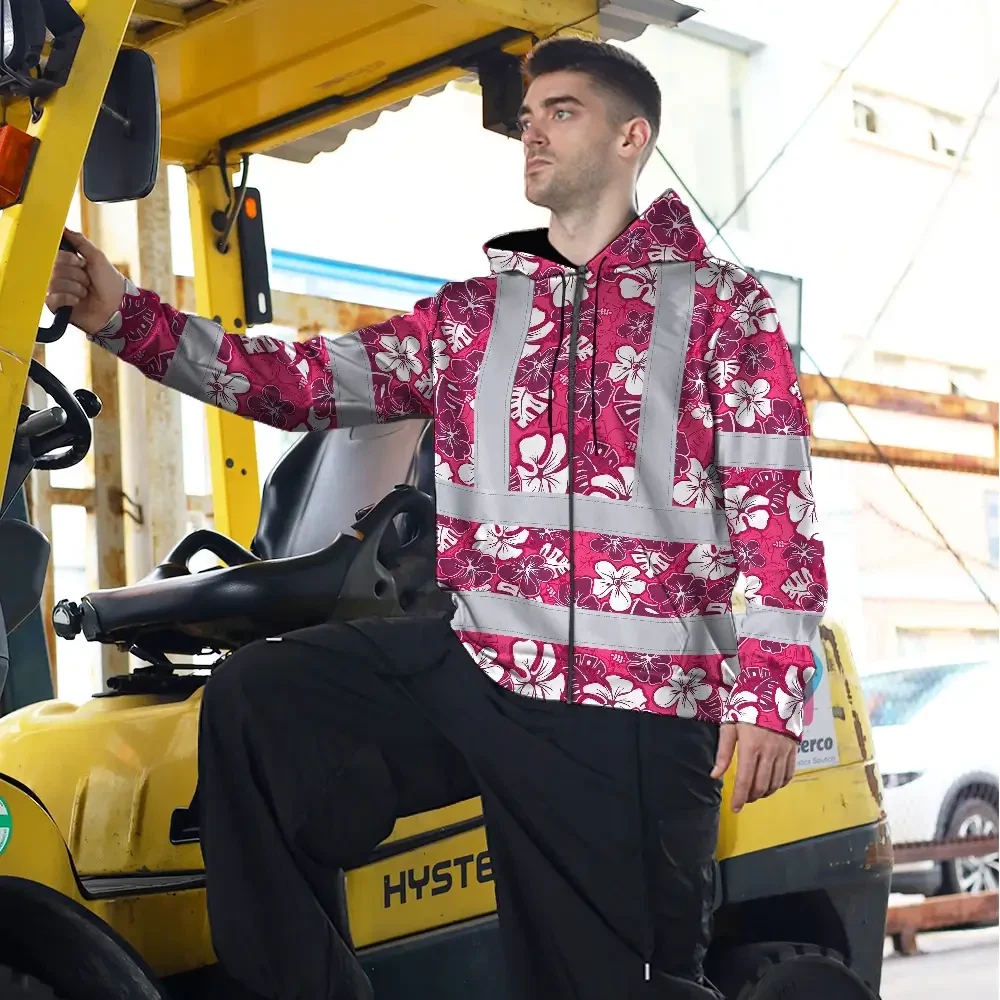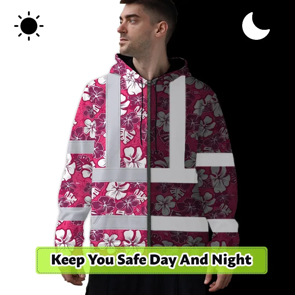 Hi Vis Zip Hoodie Reflective Tapes Pink Violet Flowers Custom Name Safety Workwear For Workers, Truckers, Operators