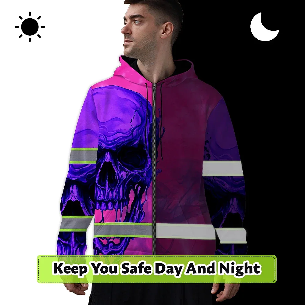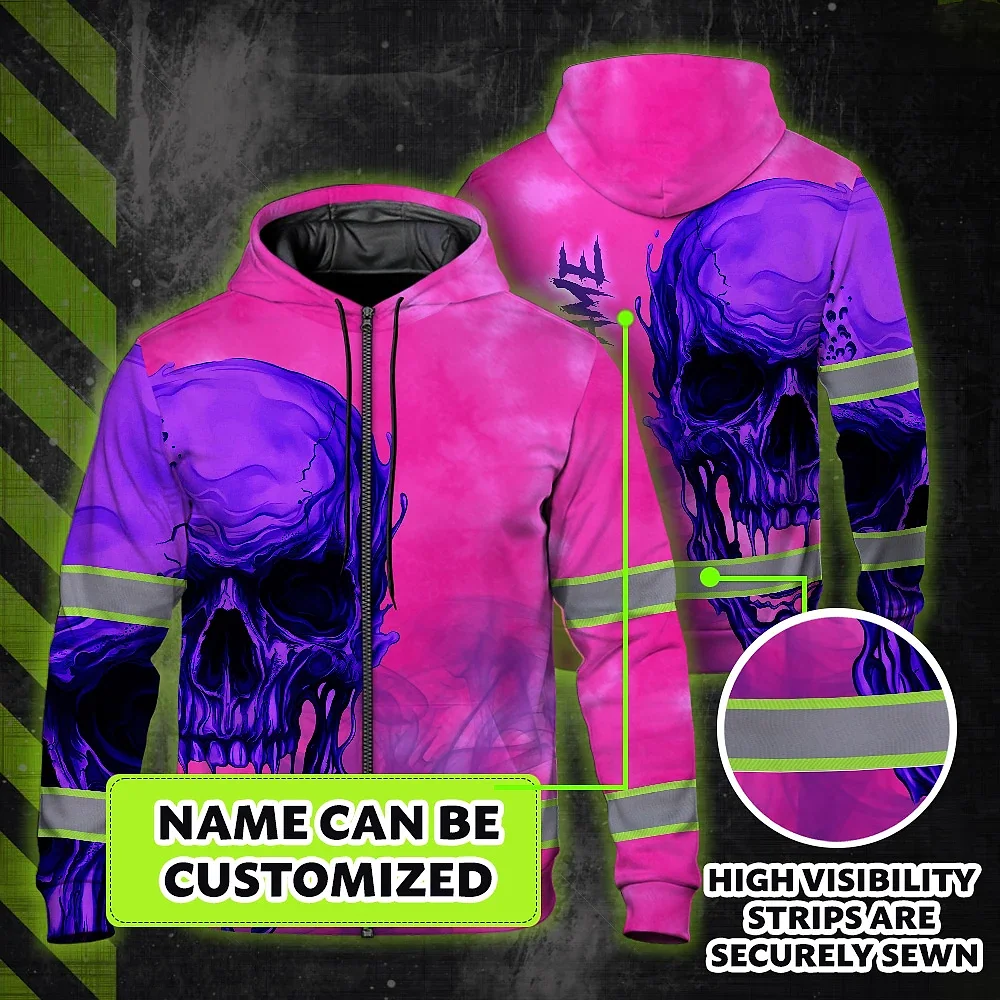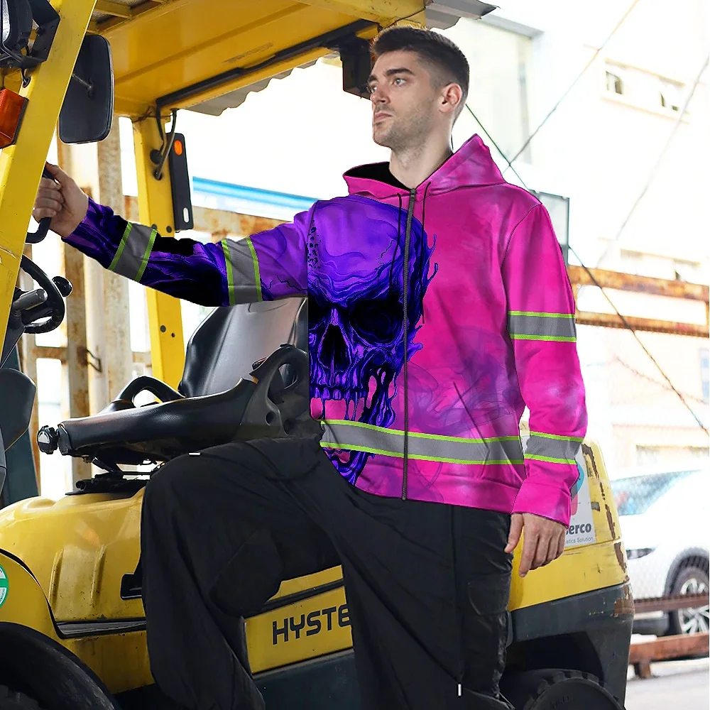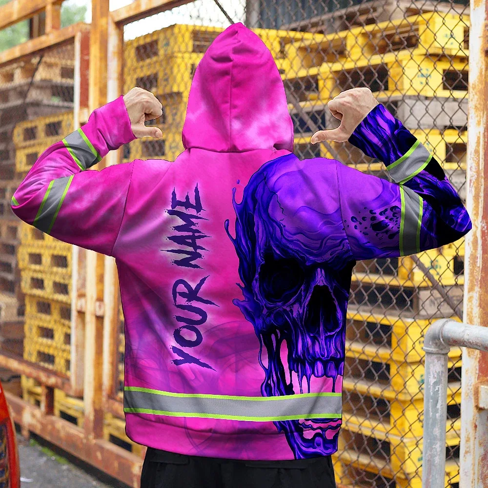 Hi Vis Zip Hoodie Reflective Tapes Pink Violet Skull Custom Name Safety Workwear For Workers, Truckers, Operators