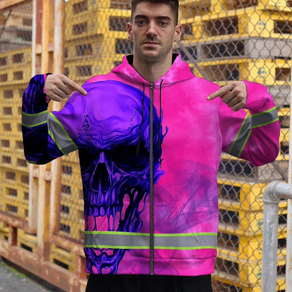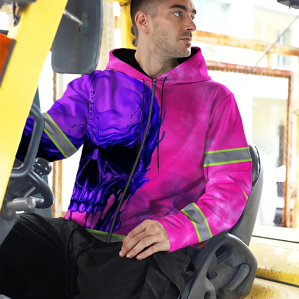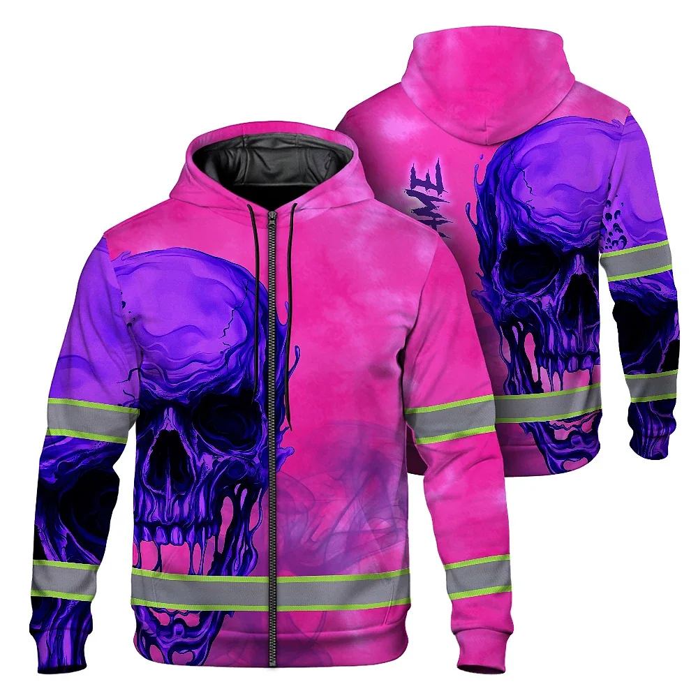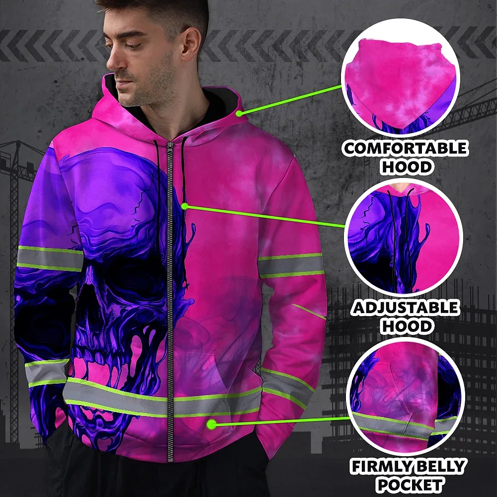 Hi Vis Zip Hoodie Reflective Tapes Pink Violet Skull Custom Name Safety Workwear For Workers, Truckers, Operators