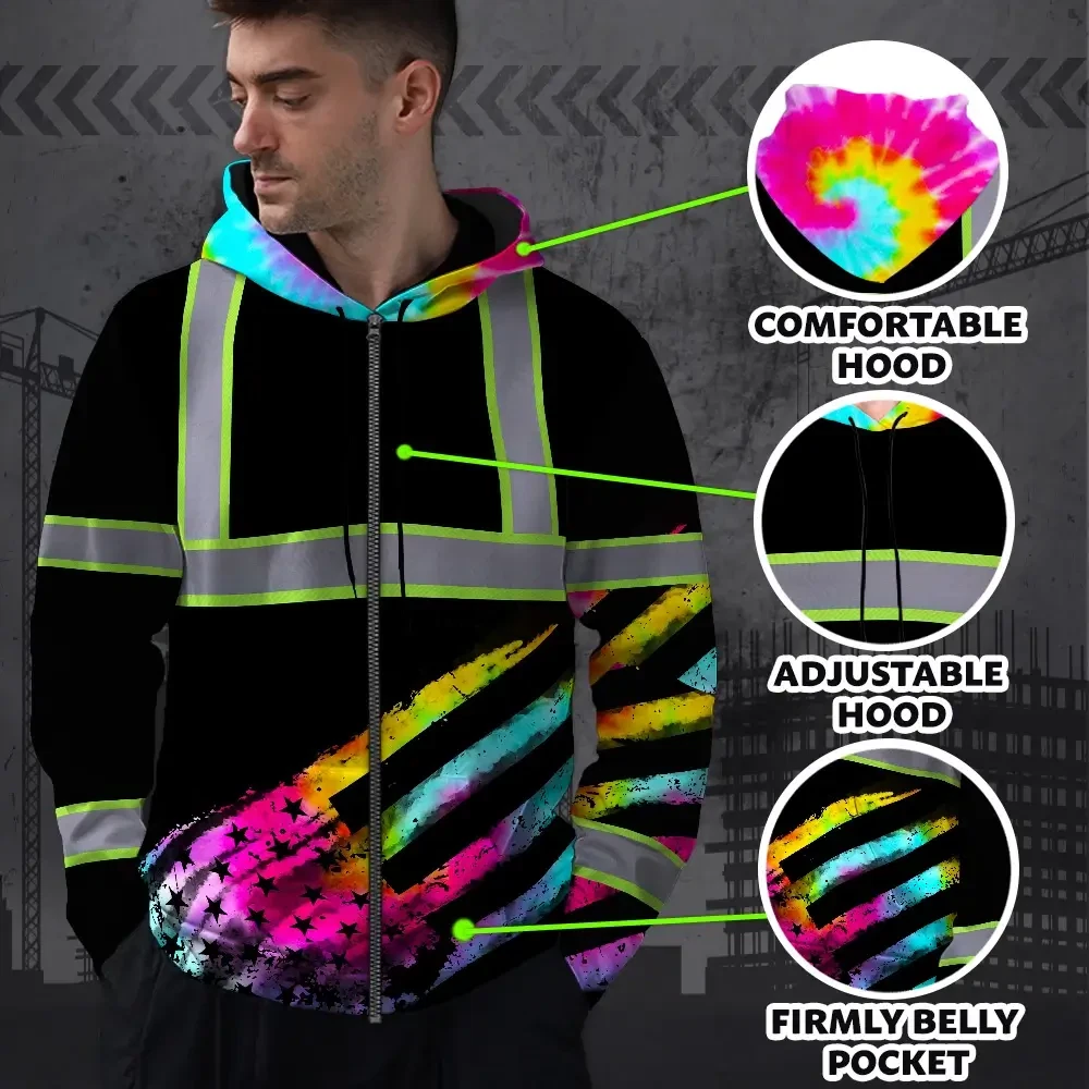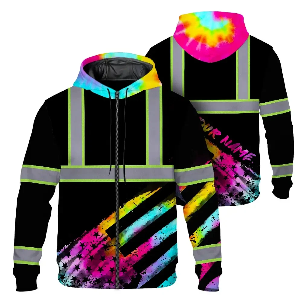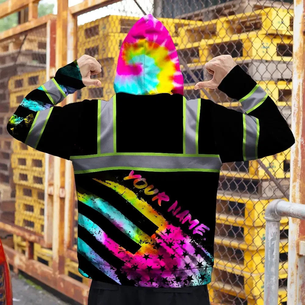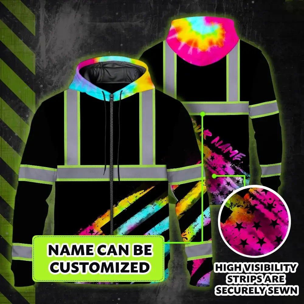 Hi Vis Zip Hoodie Reflective Tapes Rainbow Flag Tie Dye Custom Name