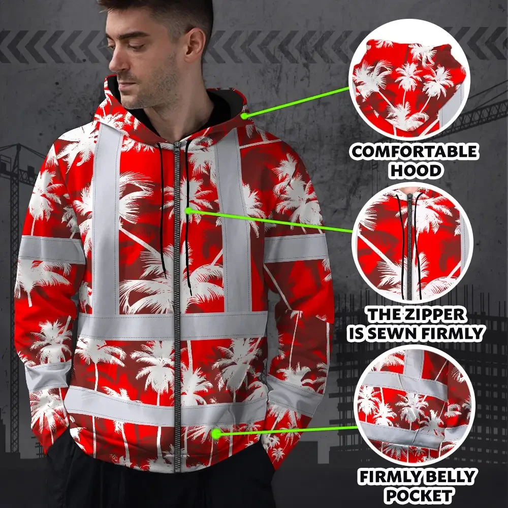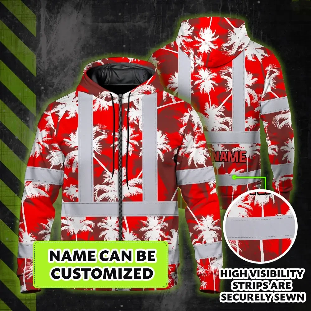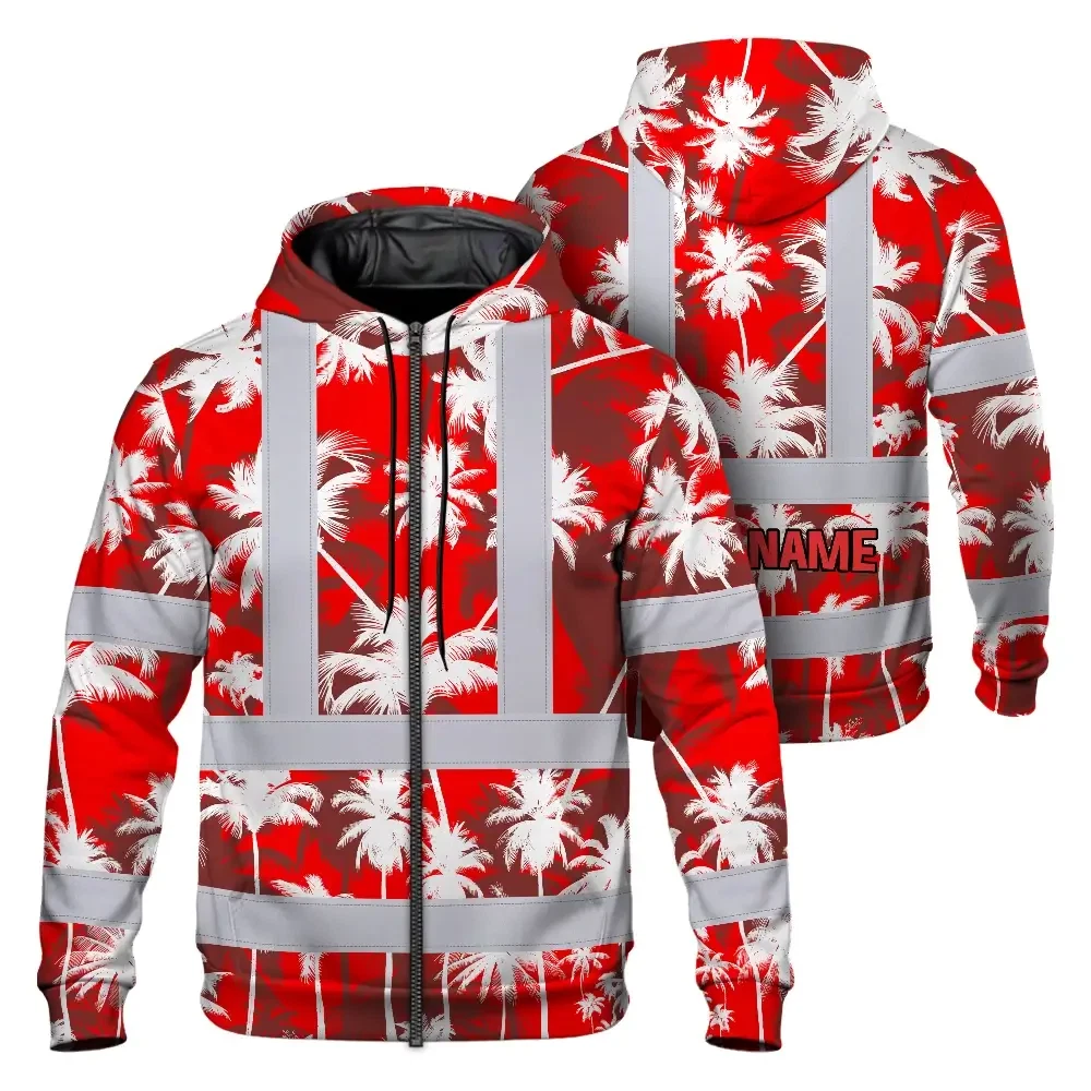 Hi Vis Zip Hoodie Reflective Tapes Red Neon Flowers Custom Name Safety Workwear For Workers, Truckers, Operators