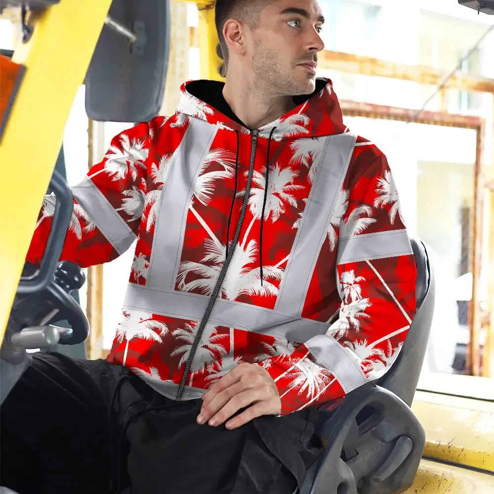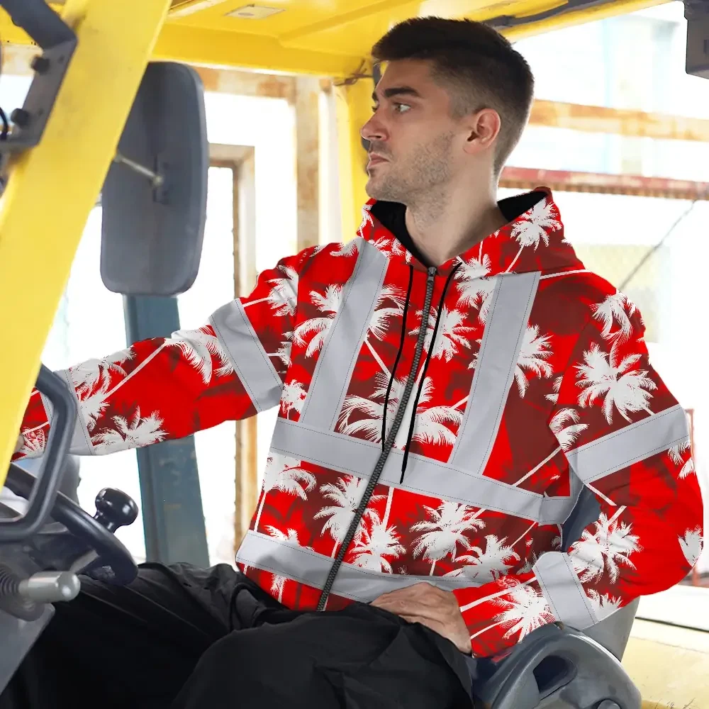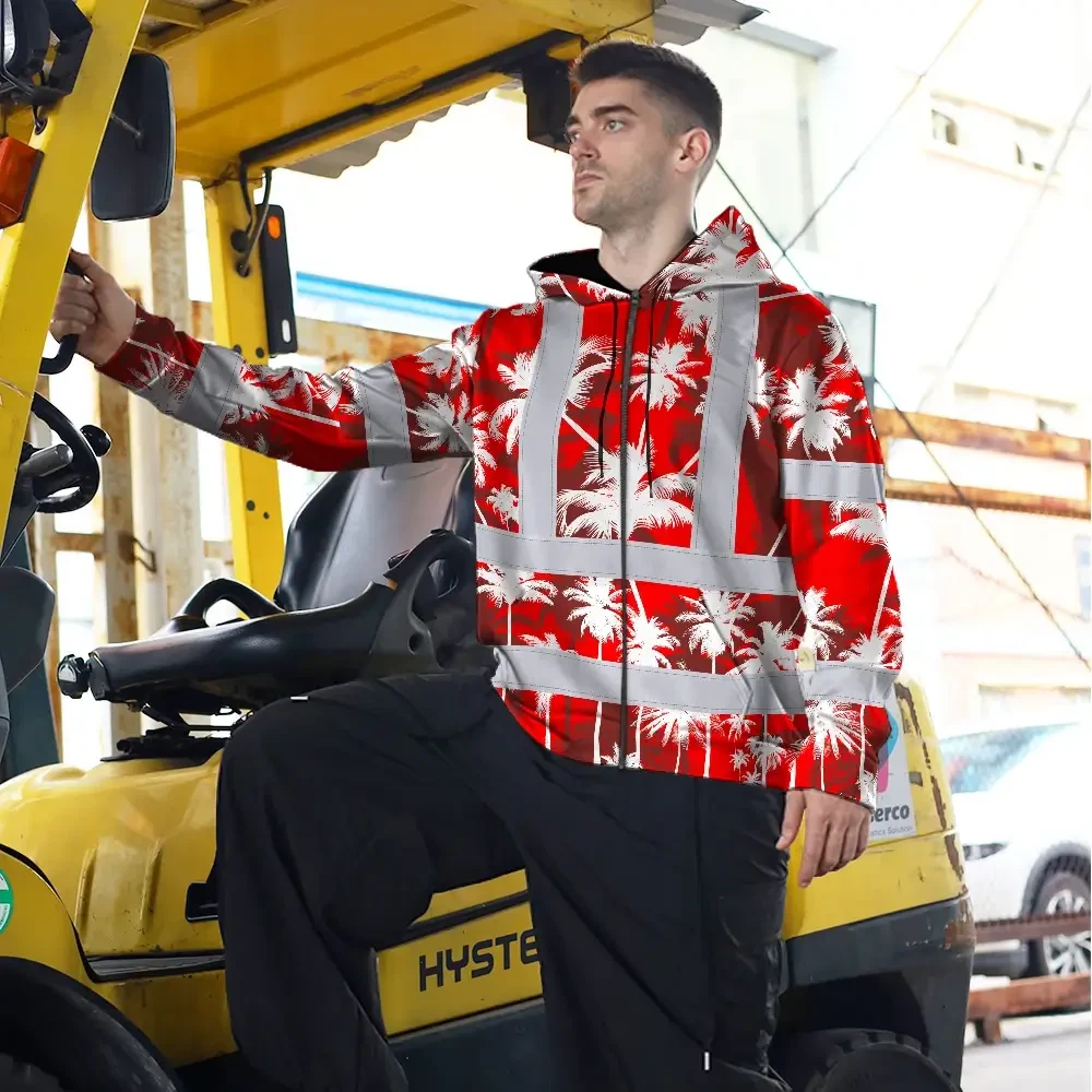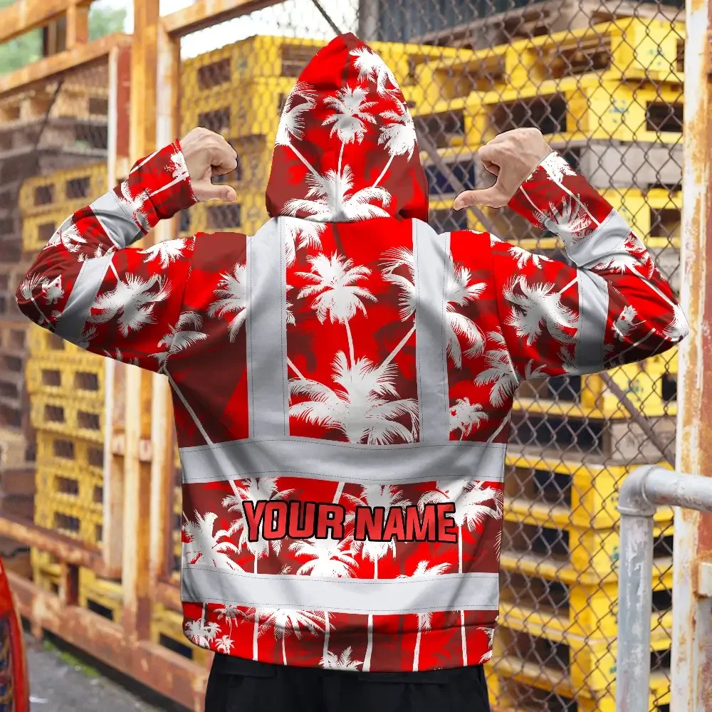 Hi Vis Zip Hoodie Reflective Tapes Red Neon Flowers Custom Name Safety Workwear For Workers, Truckers, Operators
