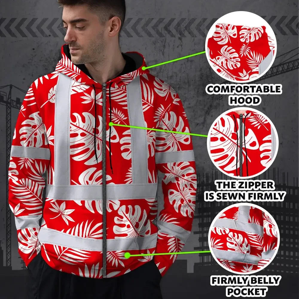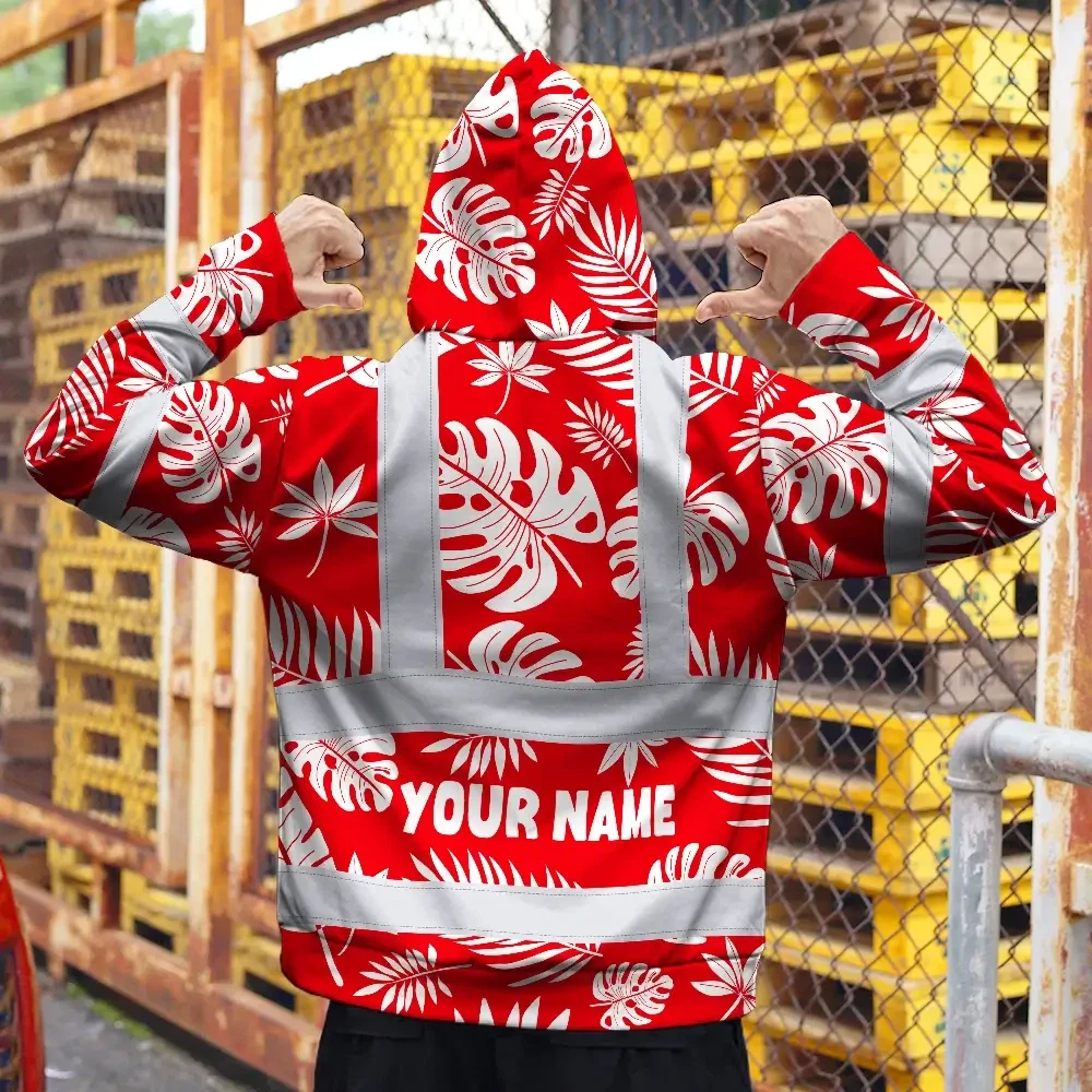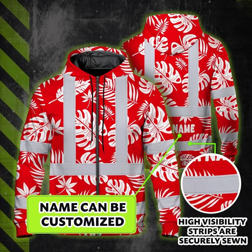 Hi Vis Zip Hoodie Reflective Tapes Red Neon Flowers Custom Name Safety Workwear For Workers, Truckers, Operators
