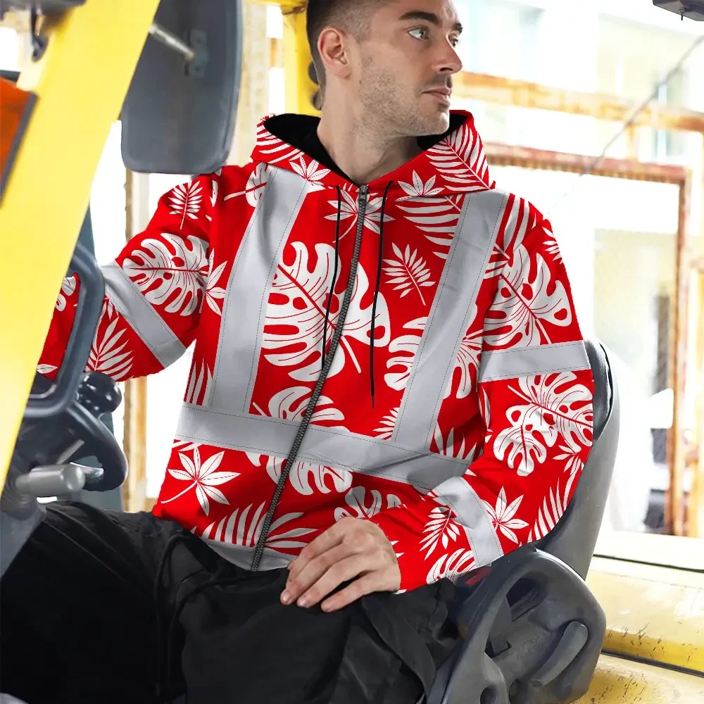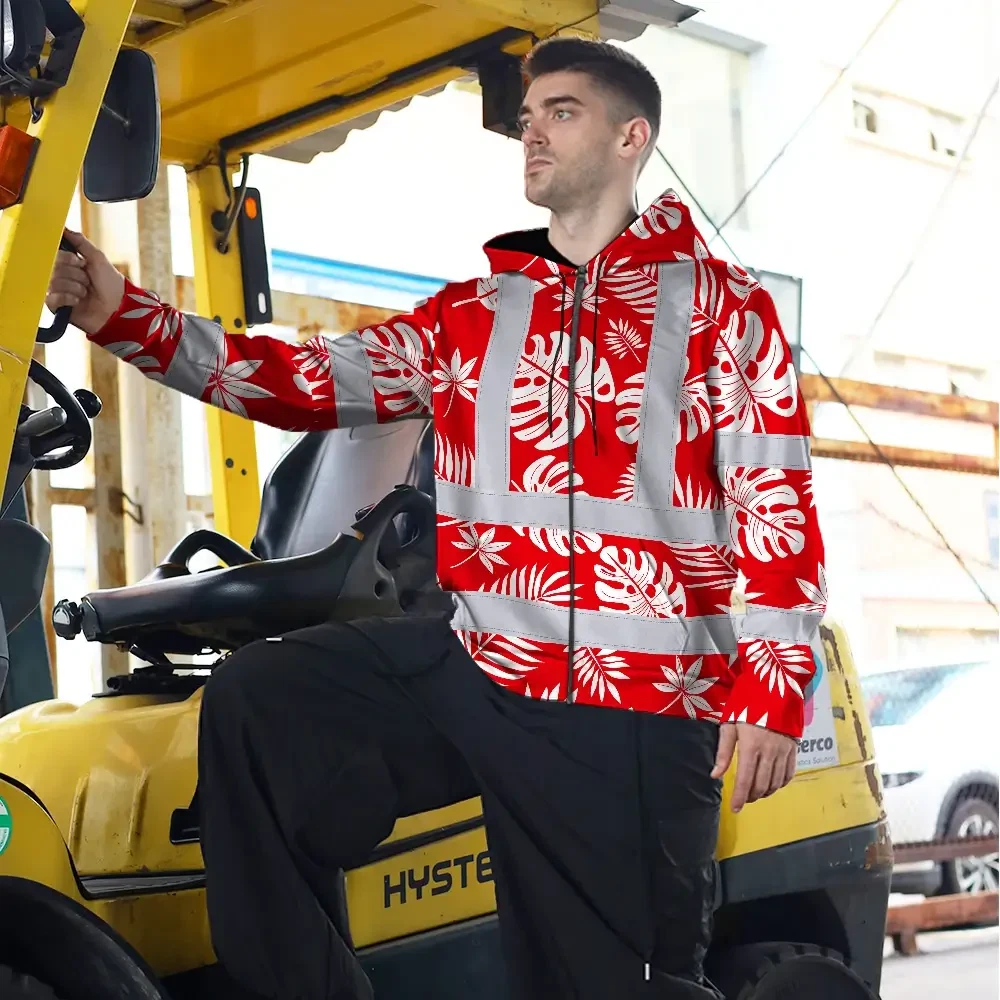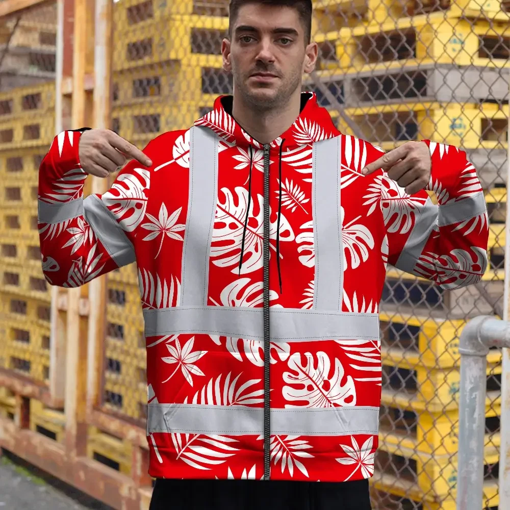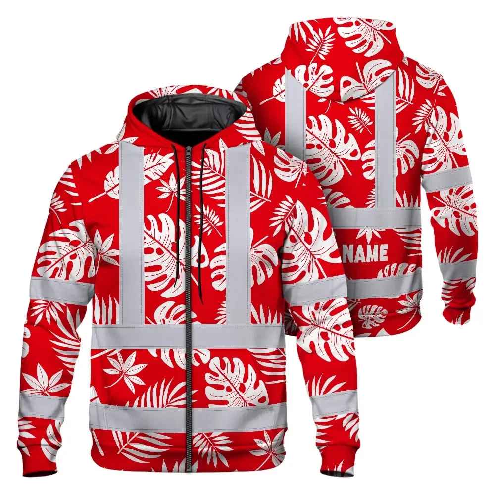 Hi Vis Zip Hoodie Reflective Tapes Red Neon Flowers Custom Name Safety Workwear For Workers, Truckers, Operators
