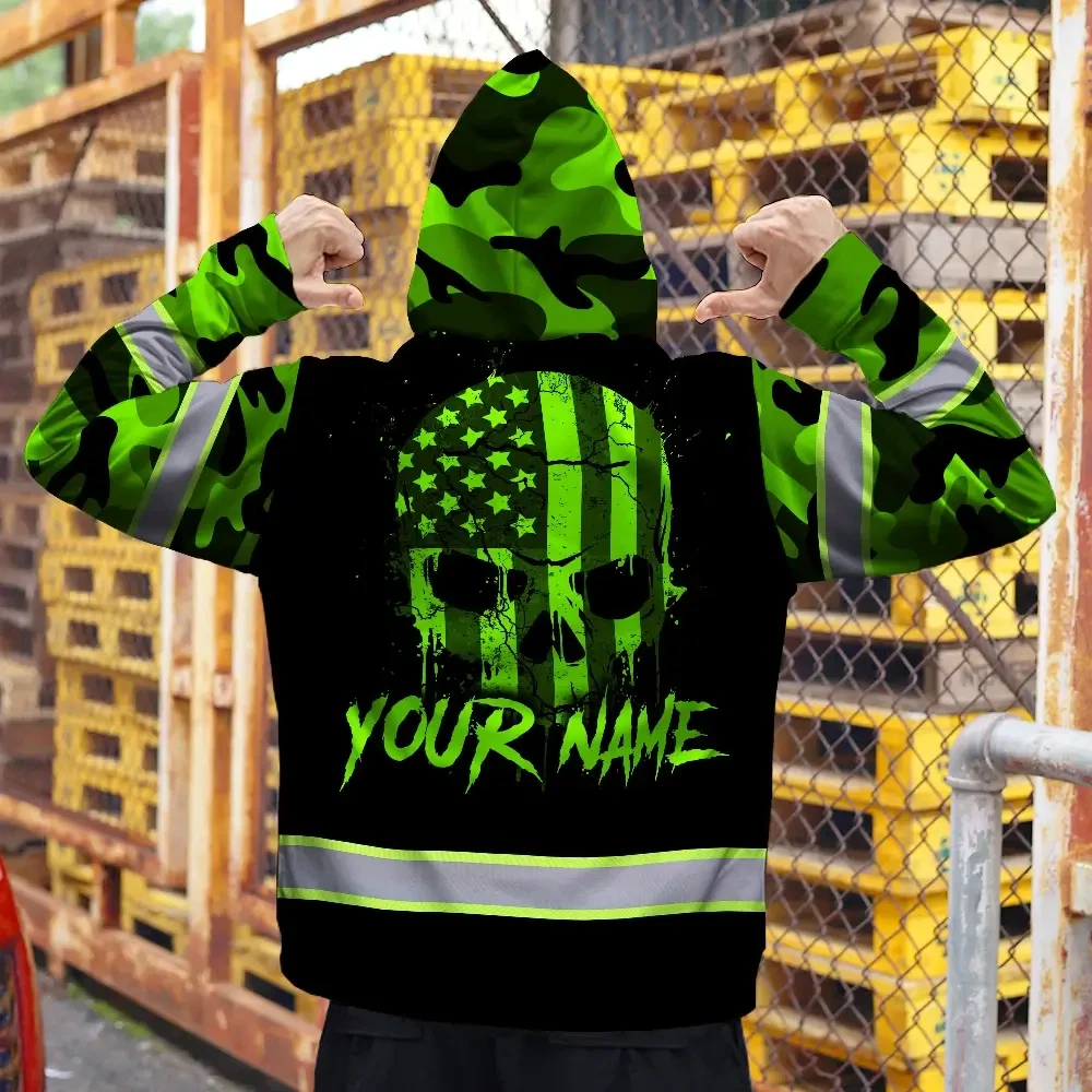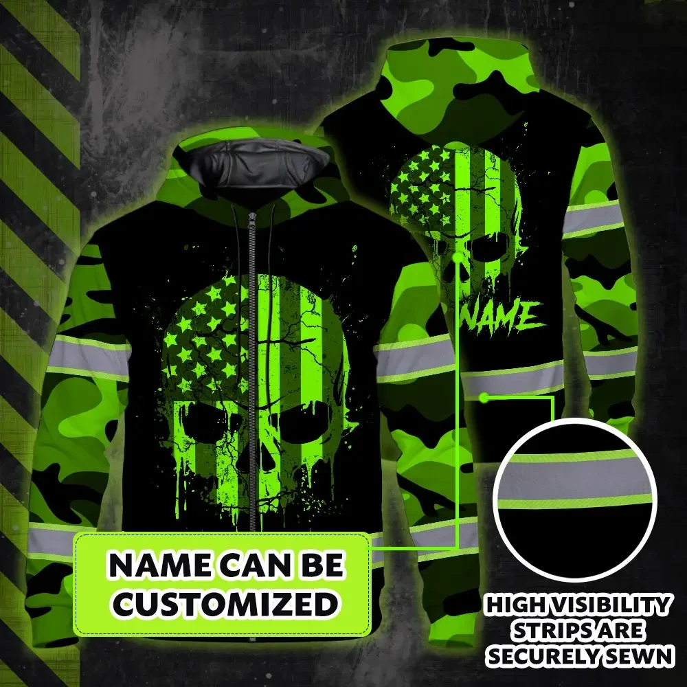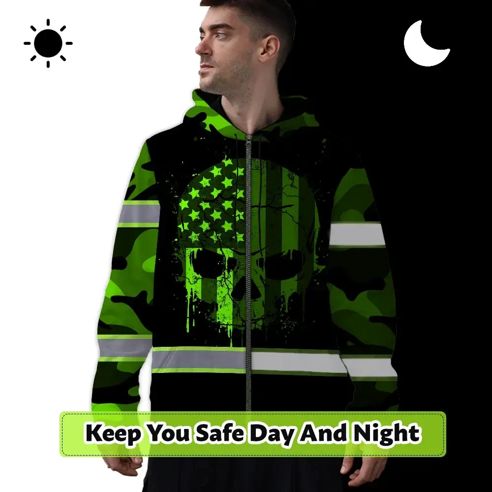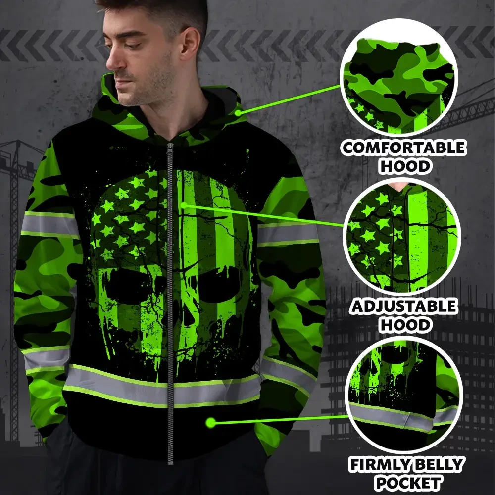 Hi Vis Zip Hoodie Reflective Tapes Skull Camo USA Flag Custom Name Safety Workwear